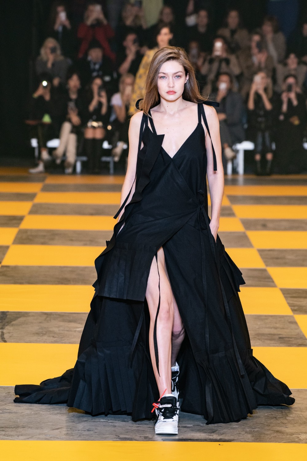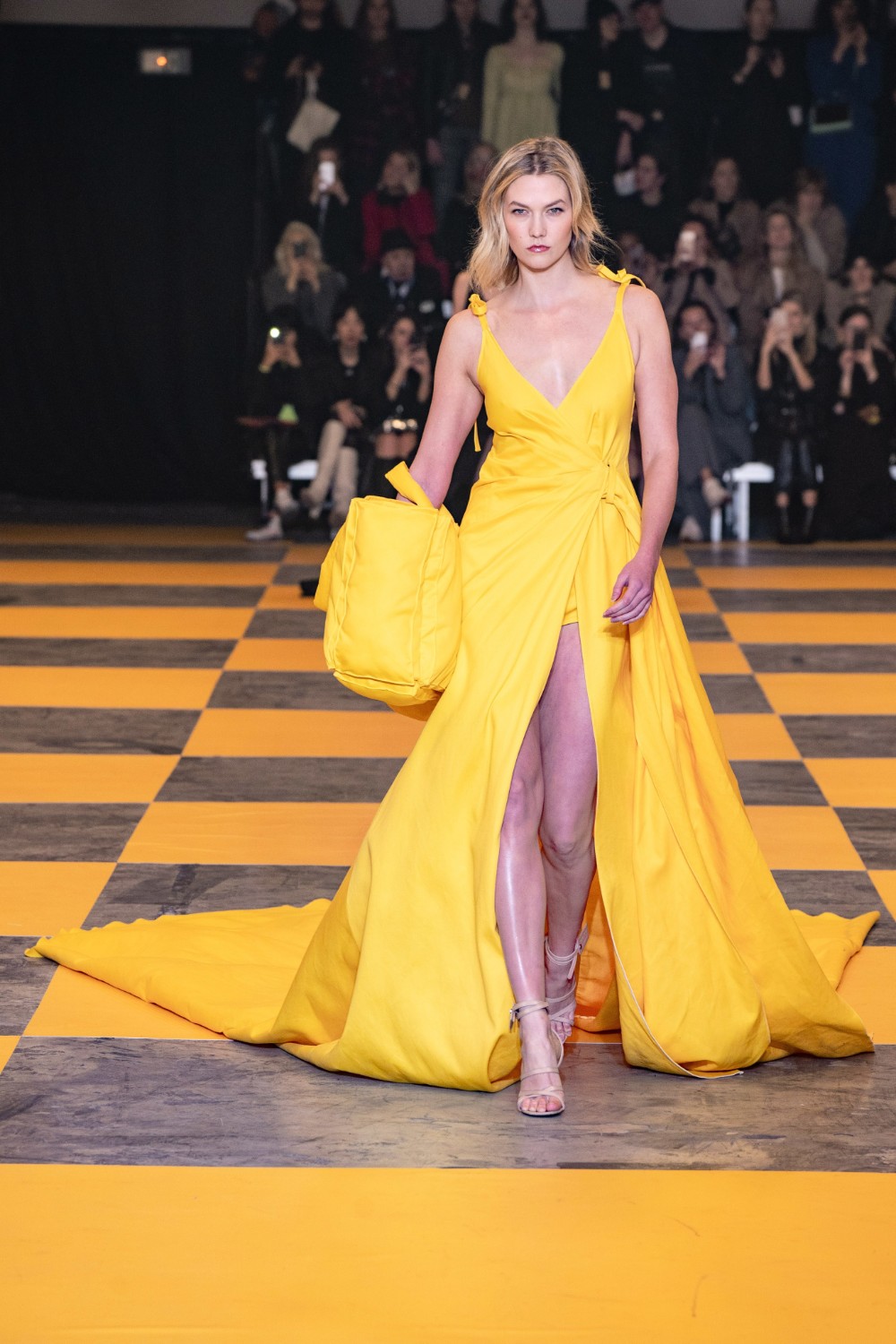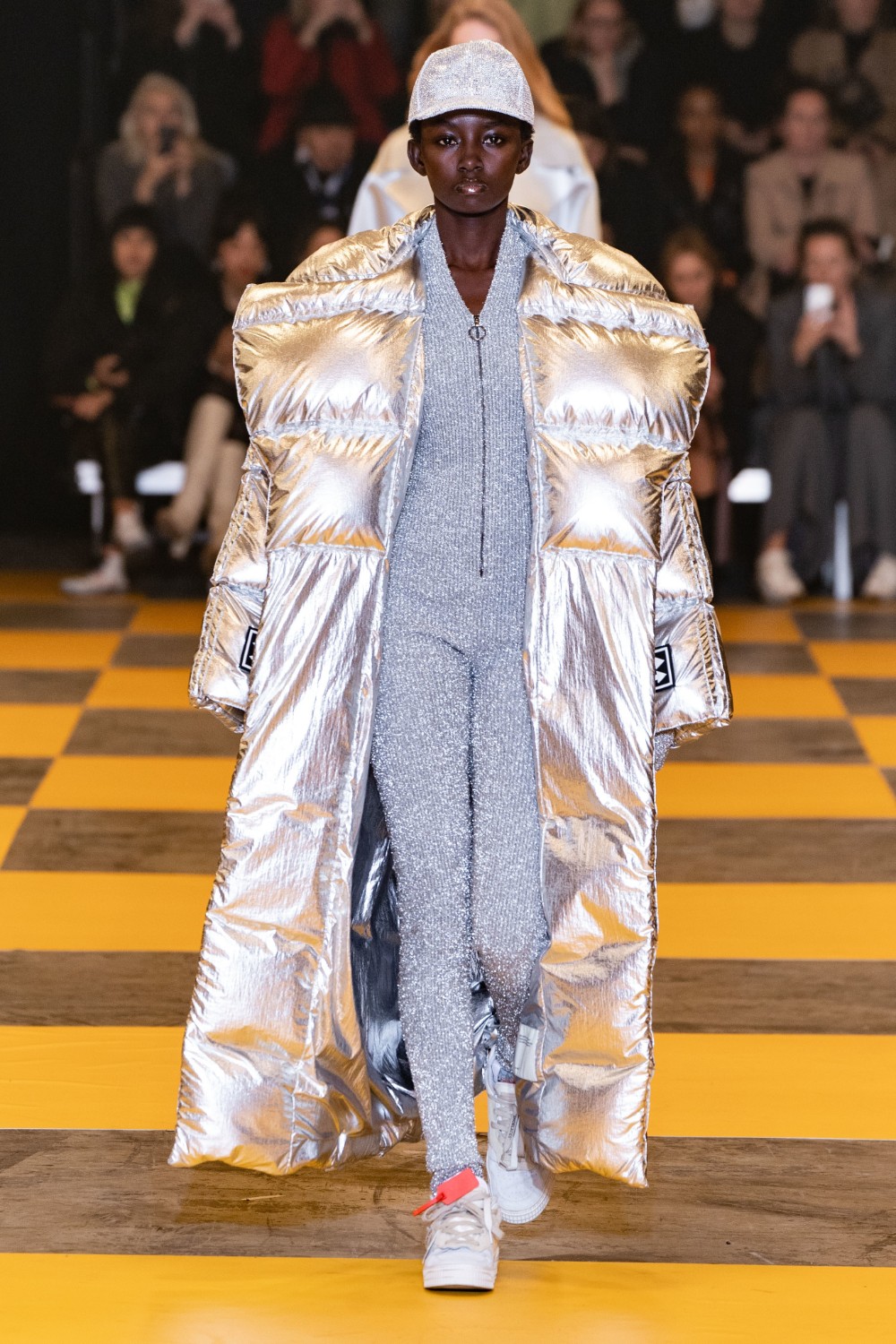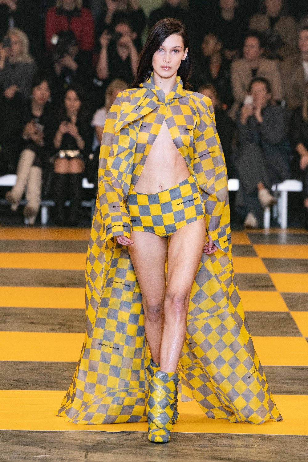 The overall feel was still very much street though. The set was inspired by a Nascar race track — a nod to the previous season’s track-and-field theme — where the runway was a bold yellow and grey checkered floor, mirrored in the collection’s puffer jackets, bags, a gown, and dramatic cape worn by Bella Hadid. A supermodel finale featured Adut Akech, Karlie Kloss, and the Hadid sisters on the catwalk.
