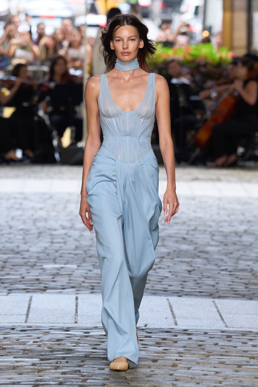 The marriage of Eastern and Western clothing tradition is a constant preoccupation for Gurung, one that he explored especially beautifully for spring 2024, and which he returned to this season starting with look one, denim/wool sari pants paired with a pleated tank. There were shorts versions and sherwani-inspired jackets. Of note were the sari/Grecian hybrid gowns that play with the earthy goddess look that is very much of the moment. Taking things in another, more classically American direction were bubble-skirted numbers and a printed set, mini dress and coat, that owed something to Bill Blass, where Gurung worked for a time.