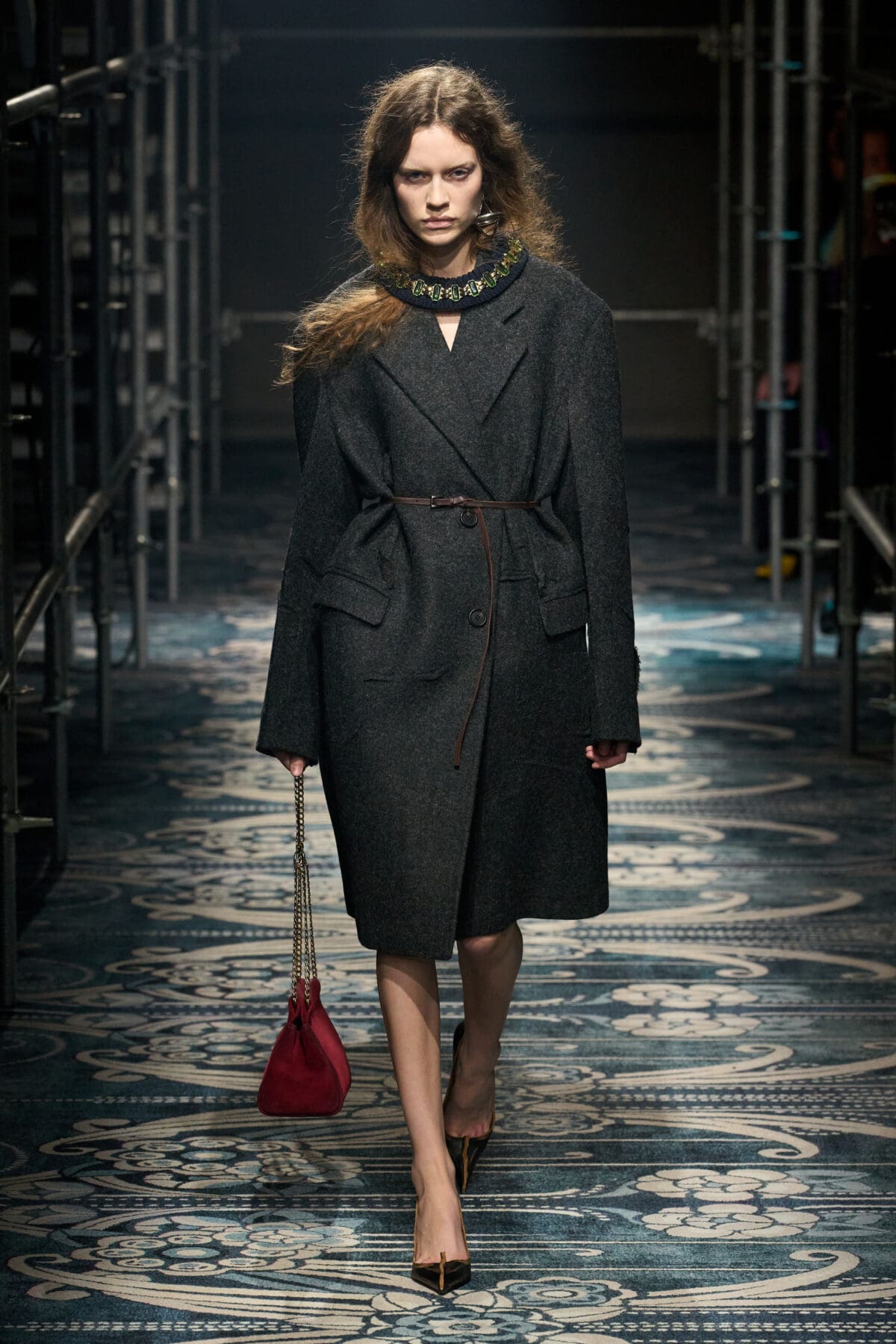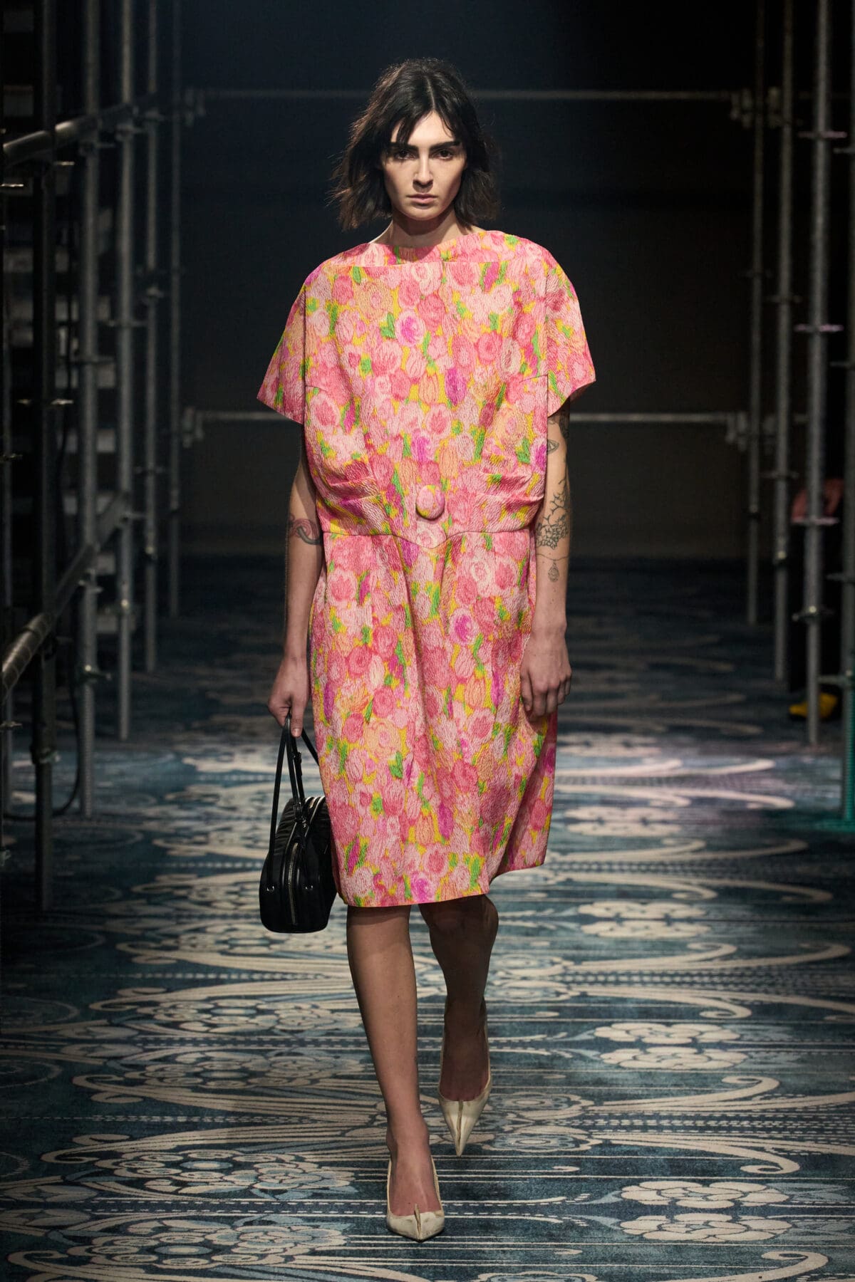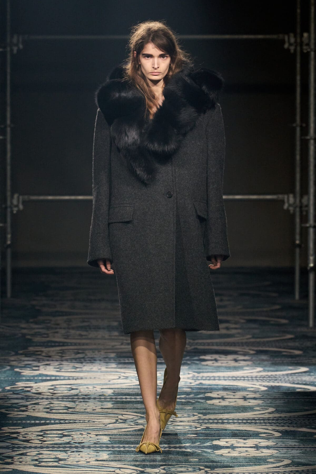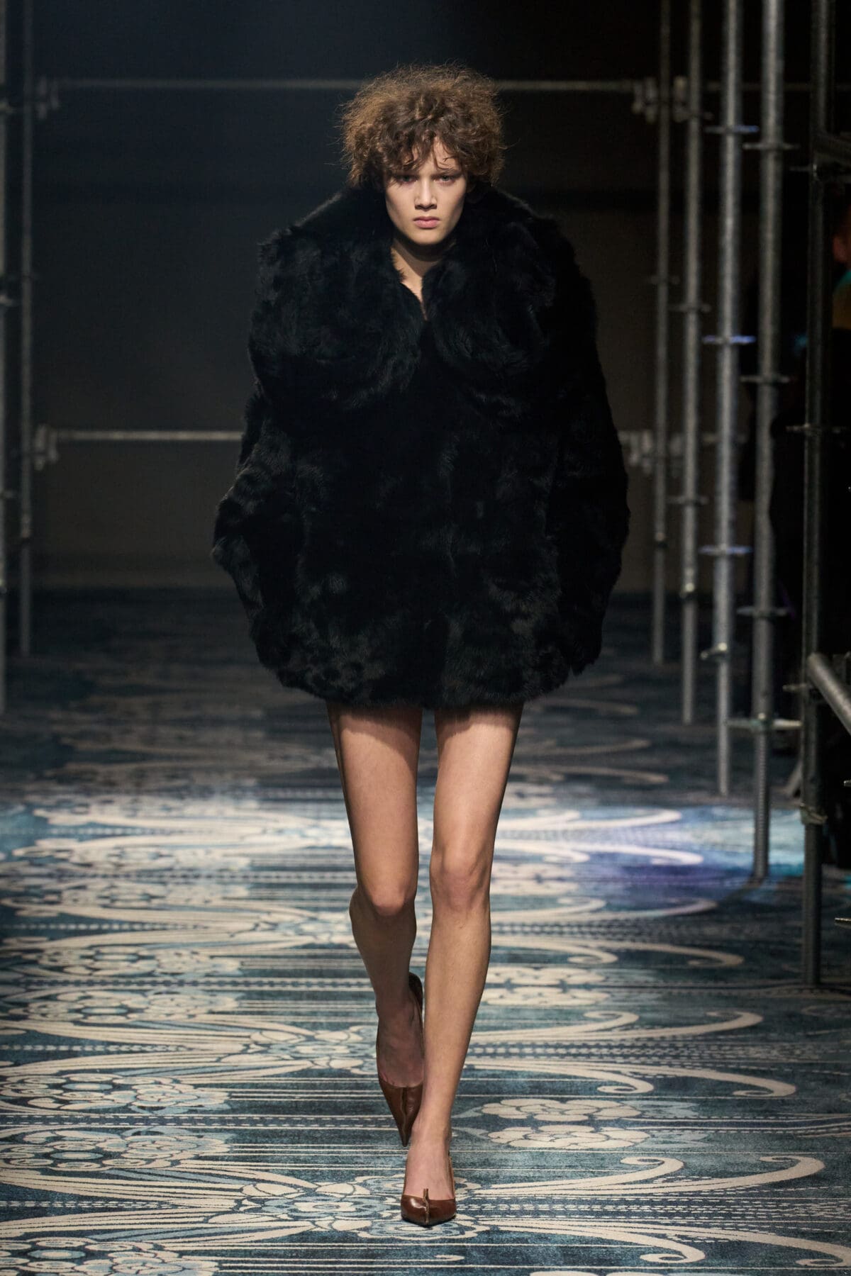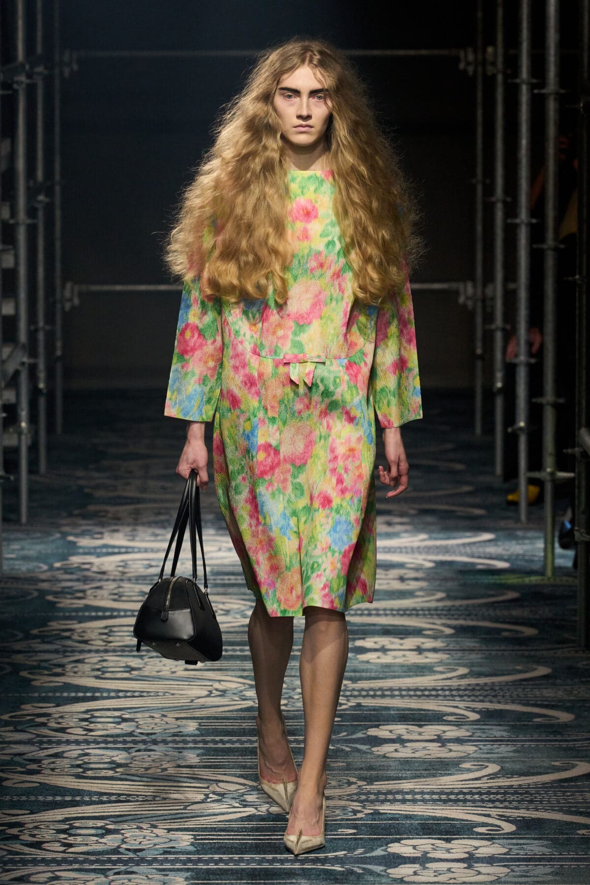 “Within feminine beauty, when you think of its archetypes, there are lots of restrictions of the body—here, it’s free.” Simons said. That didn’t just apply to what we’d consider the non-sexy shapes of the floral print house dresses or the coats with man-sized shoulders. Fur chubbies worn with pumps and nothing else are liberating in a different kind way, and sexy plain-and-simple. Other more subtle details, like the way split collars dipped below the nape of the neck, seemed to have been made strictly for the wearer’s own pleasure. But it’s the non-sexiness of the shapeless dresses that made the strongest point in this show. To dare to wear clothes that don’t stay inside the proscribed lines of femininity is, in its own small way, like flipping the bird at the system, and that feels right. As Prada said herself, “we just talk about which clothes make sense now.”