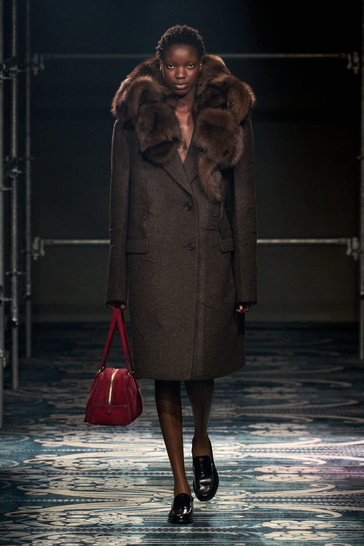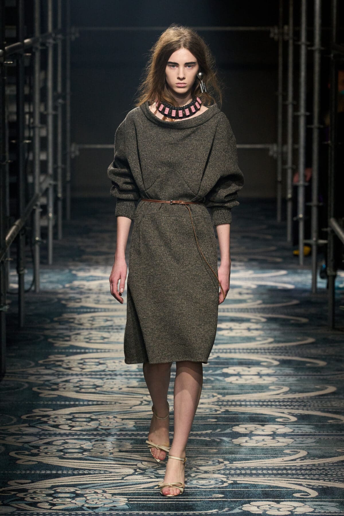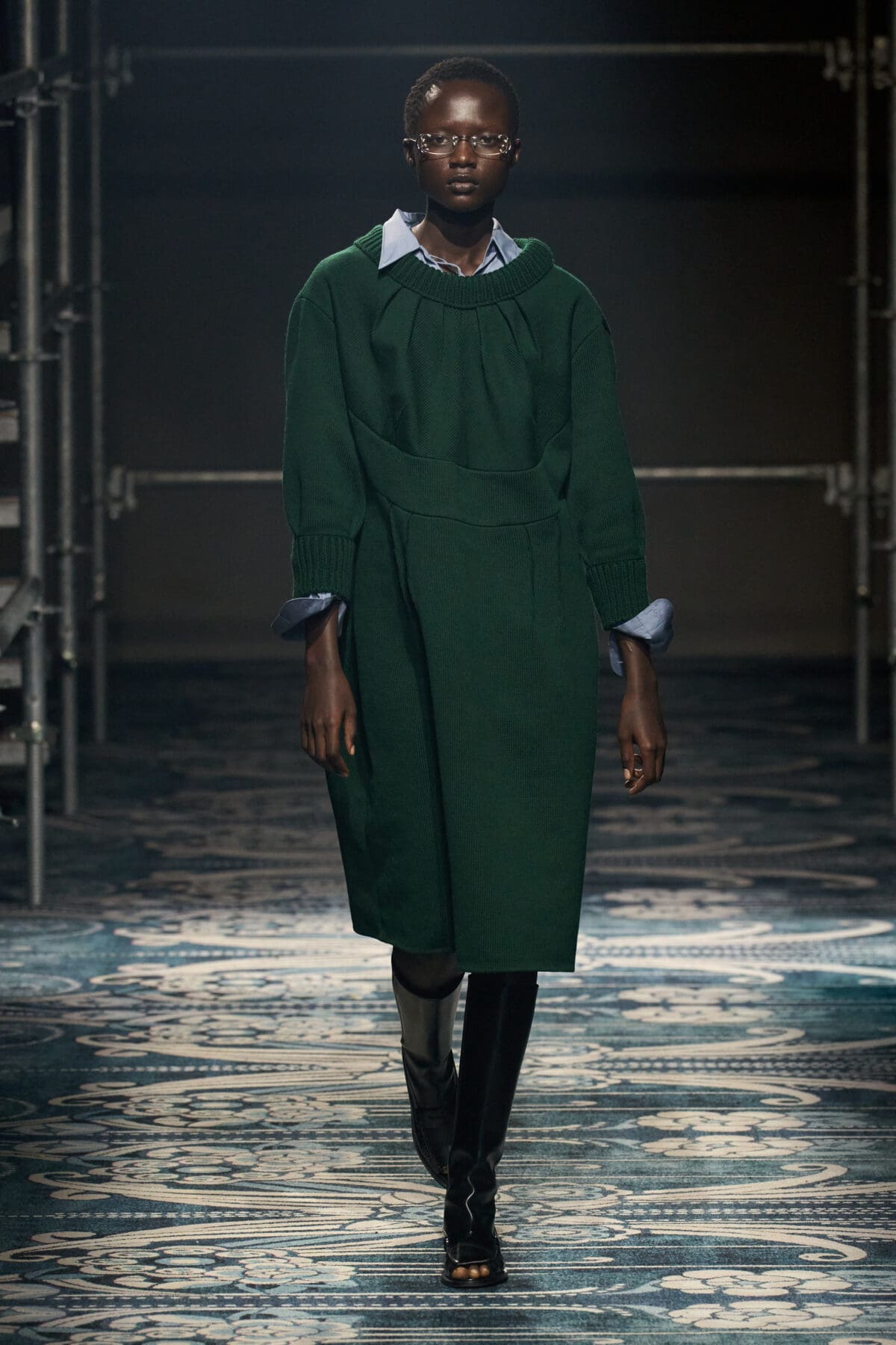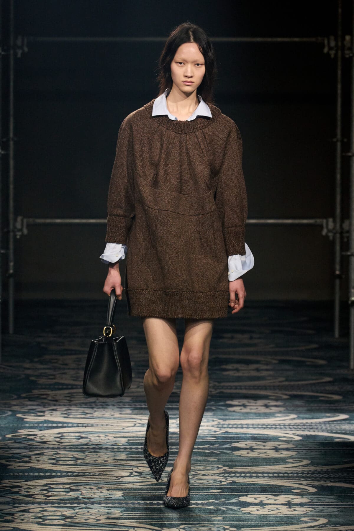“Within feminine beauty, when you think of its archetypes, there are lots of restrictions of the body—here, it’s free.” Simons said. That didn’t just apply to what we’d consider the non-sexy shapes of the floral print house dresses or the coats with man-sized shoulders. Fur chubbies worn with pumps and nothing else are liberating in a different kind way, and sexy plain-and-simple. Other more subtle details, like the way split collars dipped below the nape of the neck, seemed to have been made strictly for the wearer’s own pleasure. But it’s the non-sexiness of the shapeless dresses that made the strongest point in this show. To dare to wear clothes that don’t stay inside the proscribed lines of femininity is, in its own small way, like flipping the bird at the system, and that feels right. As Prada said herself, “we just talk about which clothes make sense now.”