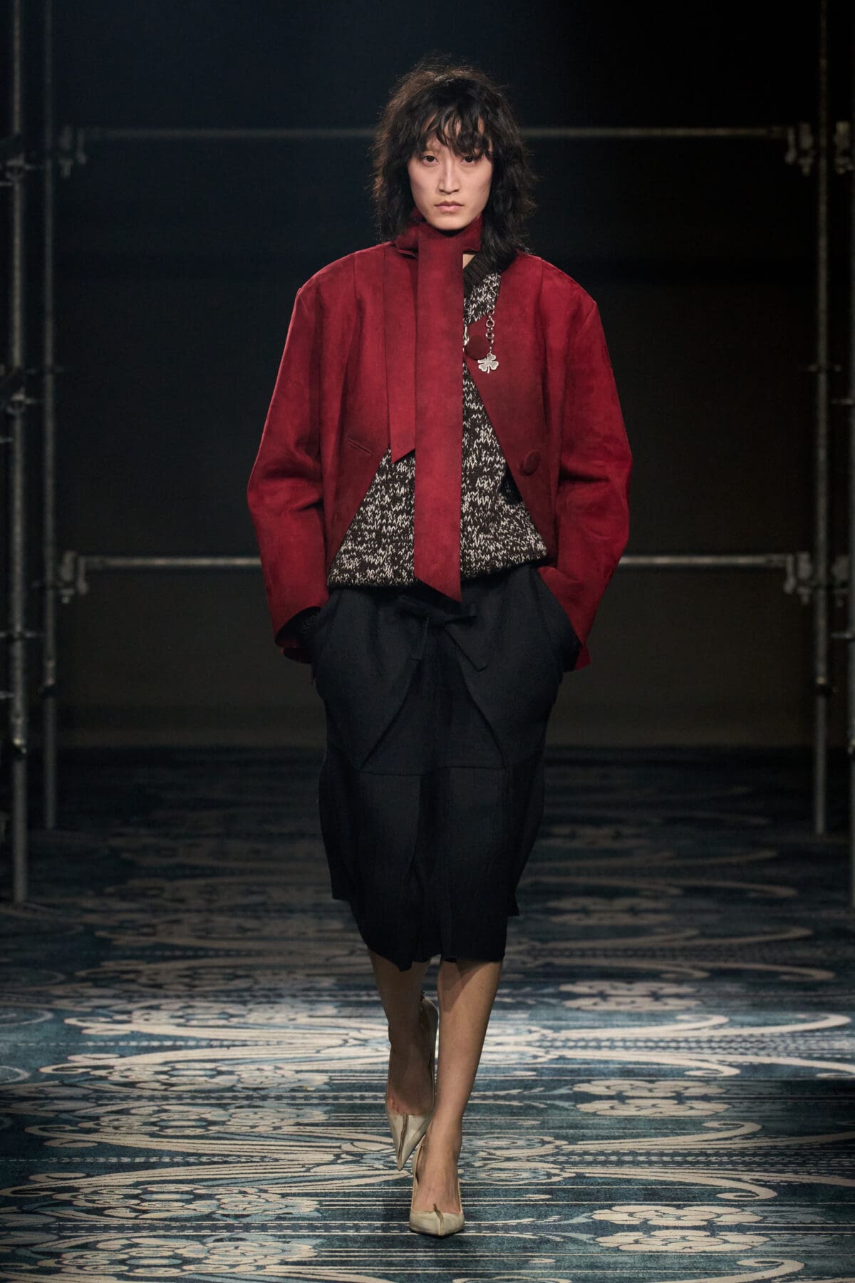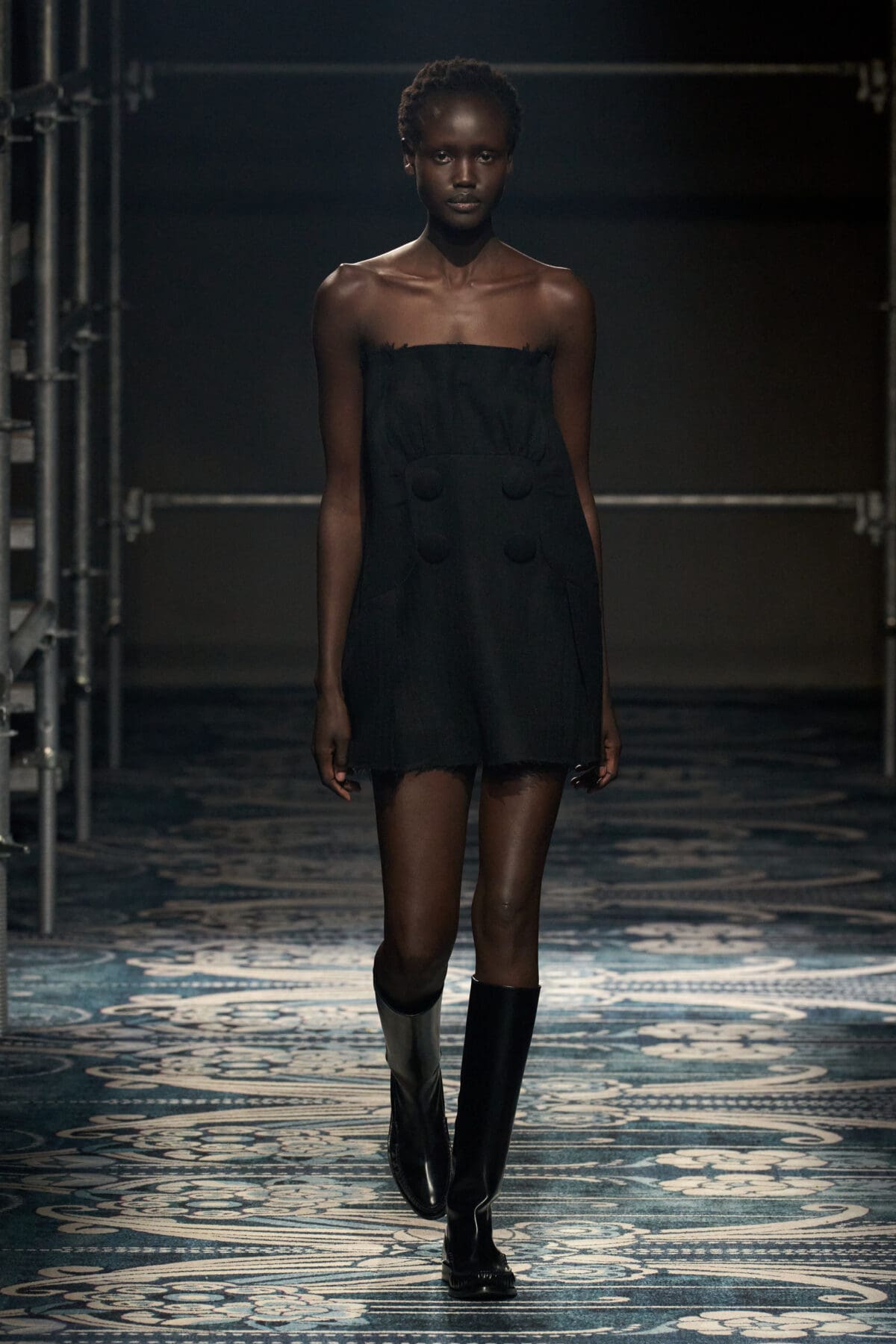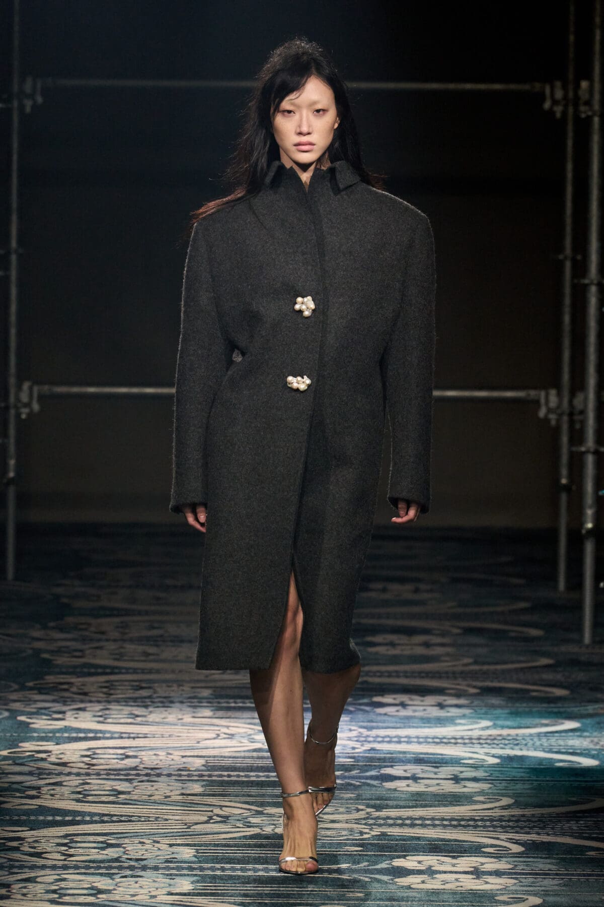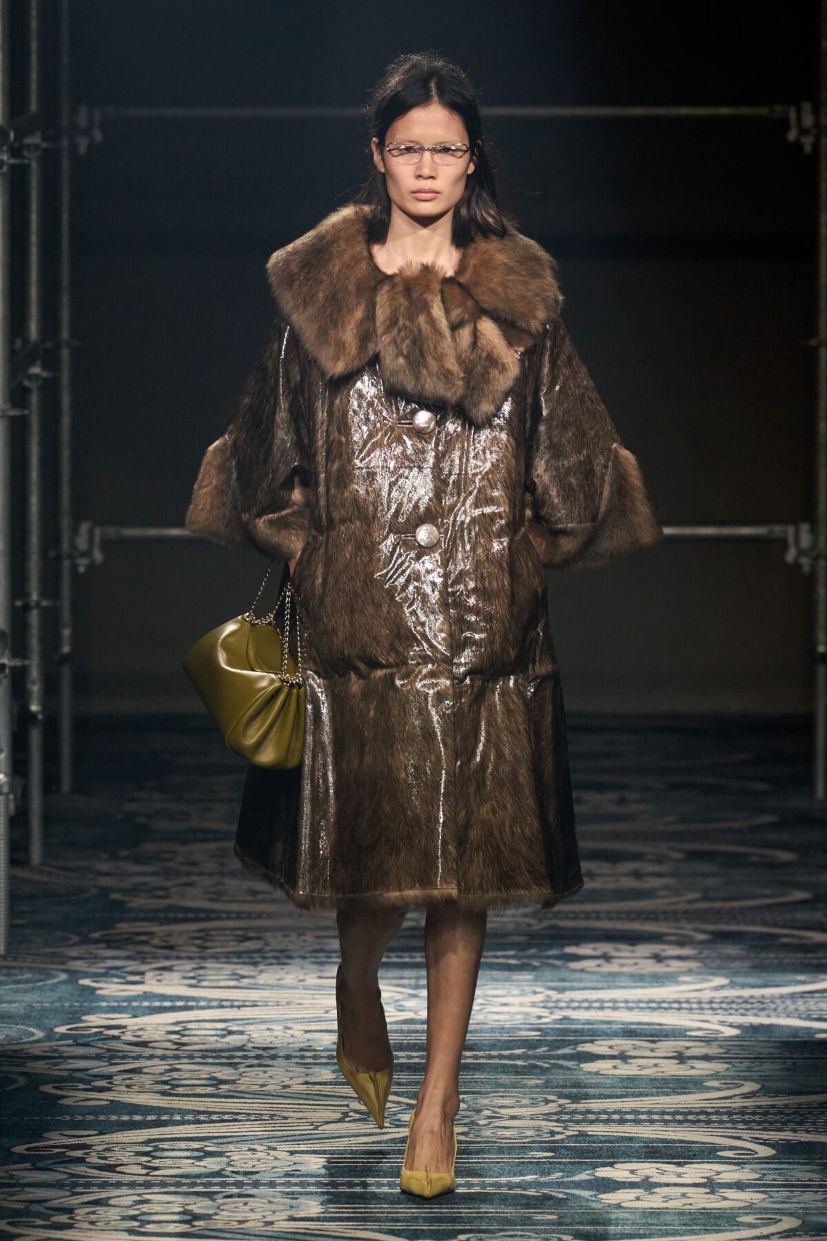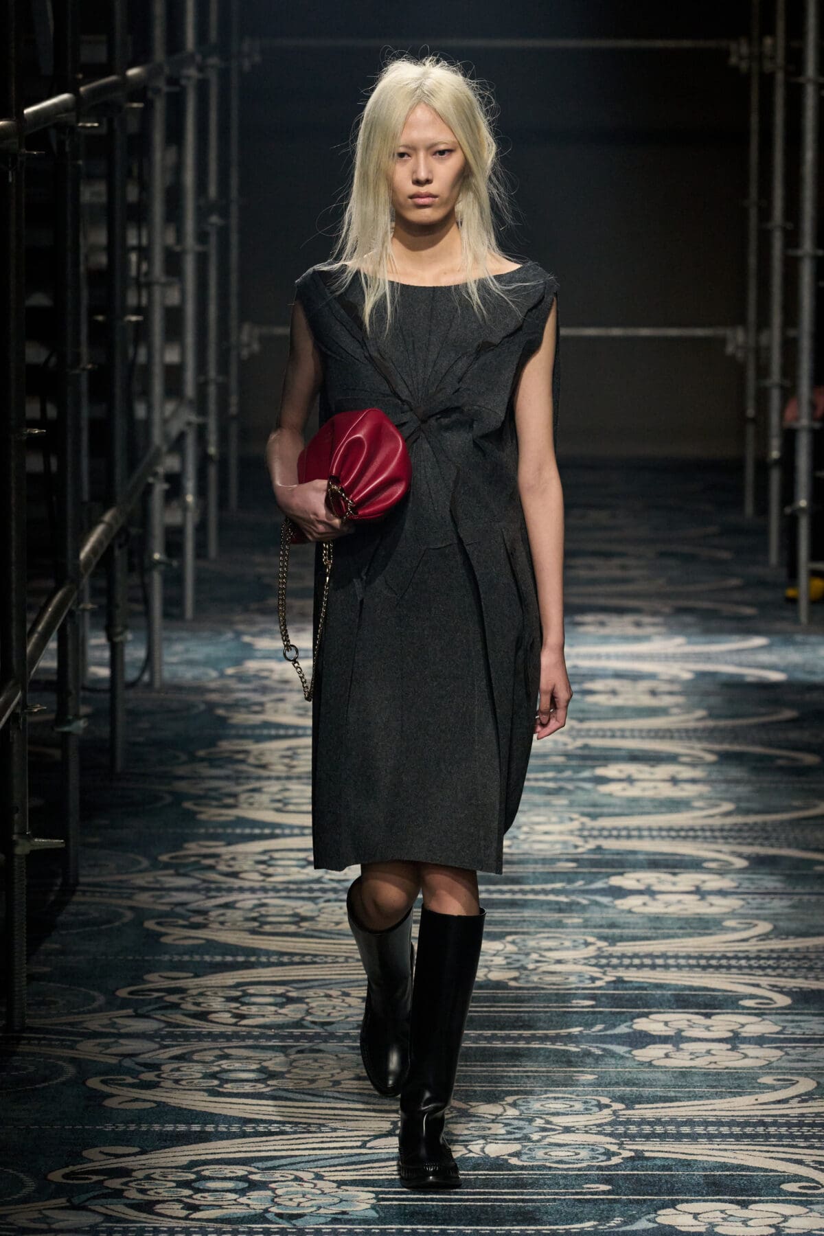 “Within feminine beauty, when you think of its archetypes, there are lots of restrictions of the body—here, it’s free.” Simons said. That didn’t just apply to what we’d consider the non-sexy shapes of the floral print house dresses or the coats with man-sized shoulders. Fur chubbies worn with pumps and nothing else are liberating in a different kind way, and sexy plain-and-simple. Other more subtle details, like the way split collars dipped below the nape of the neck, seemed to have been made strictly for the wearer’s own pleasure. But it’s the non-sexiness of the shapeless dresses that made the strongest point in this show. To dare to wear clothes that don’t stay inside the proscribed lines of femininity is, in its own small way, like flipping the bird at the system, and that feels right. As Prada said herself, “we just talk about which clothes make sense now.”