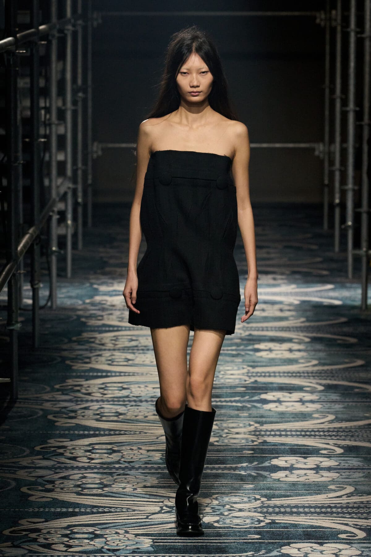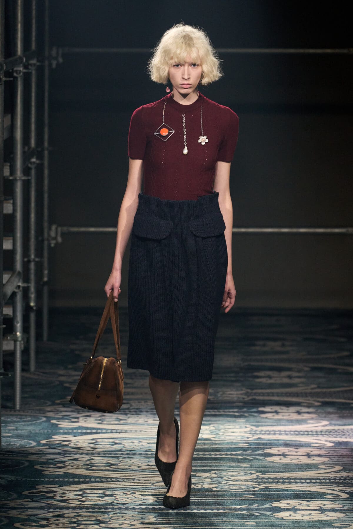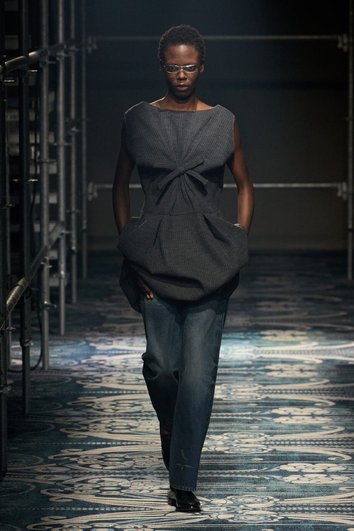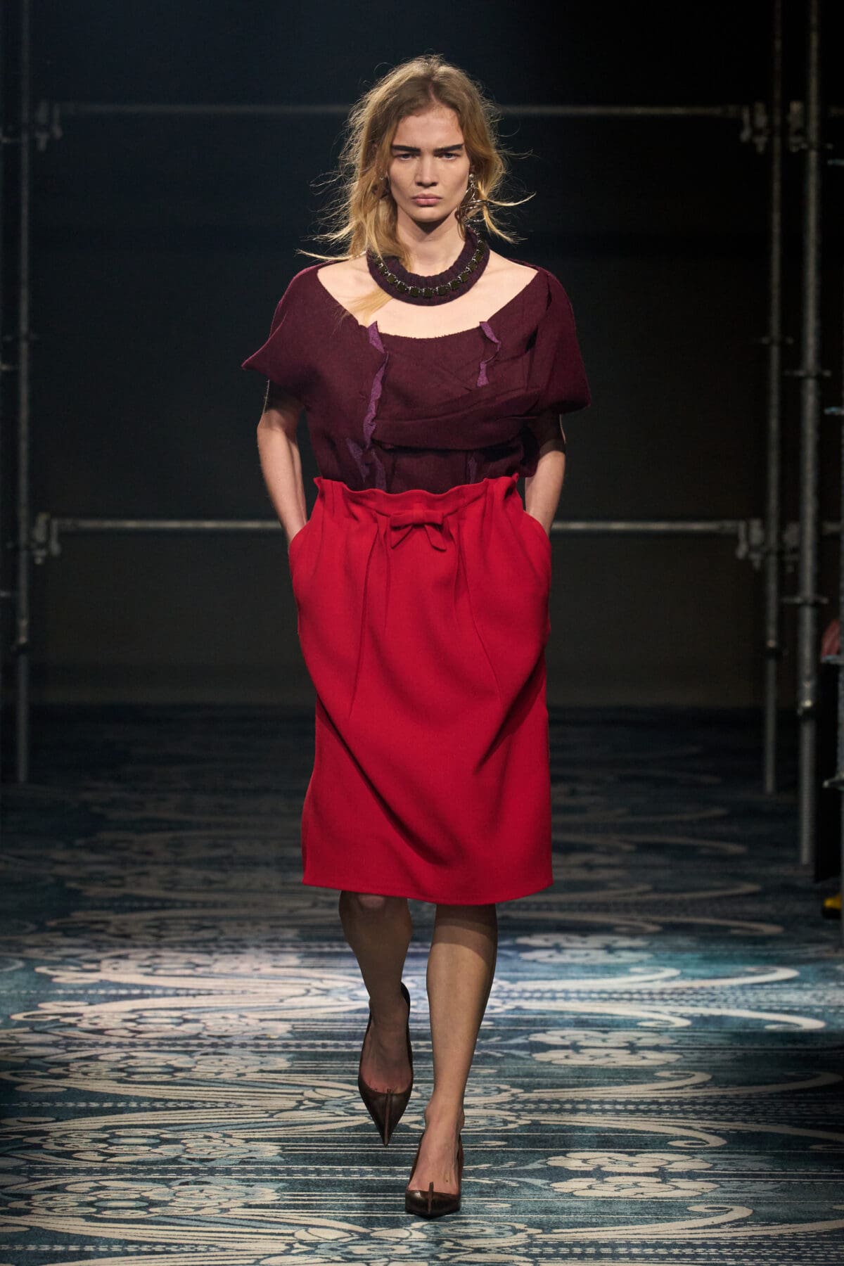 On the runway, Prada and Simons set out to poke holes in the notion of feminine perfection. They did it by “rescaling” little black dresses, eliminating every last bit of their slink until they looked like ’60s sheaths gone wrong. By designing skirts with paper-bag waists that wiped away any sense of an hourglass shape, and by working with materials that leaned thick and coarse, not supple—not “touch me” fabrics, but their opposite, as in “don’t!” Seams were exposed, edges were left raw and unfinished, and wrinkles were pressed into garments, hinting at years of wear. Or, au contraire, maybe the rumples were the result of a proverbial roll in the hay, as the models’ bedroom hair would seem to have suggested.