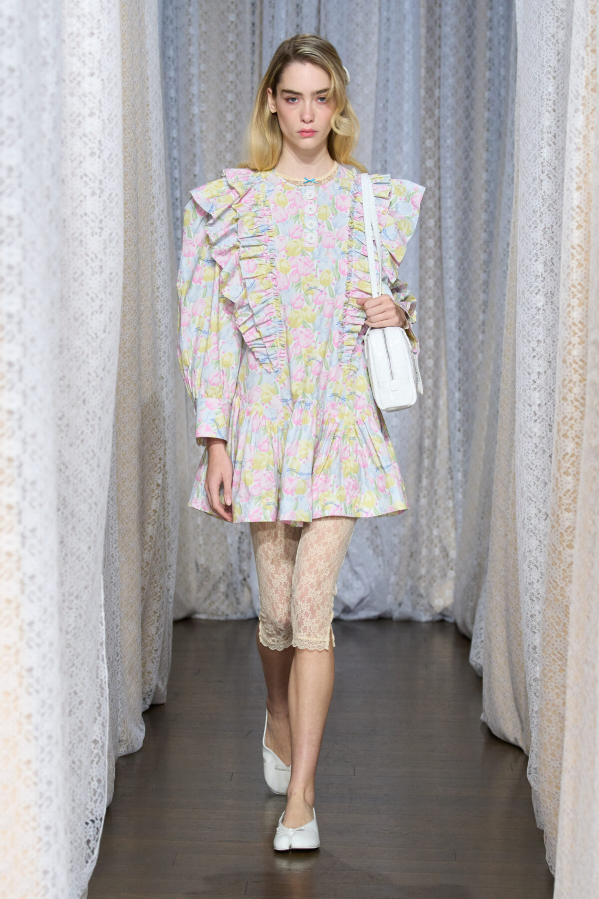Throughout the show you could find dainty and delicate doll-like clothes from prairie dresses to mini skirts that featured maximized Sandy Liang care labels and buttons. Having been inspired by the lace drapery that’s often featured in dollhouses, the technique was used throughout, with one of the lace slip skirts featuring a blue ribbon to mimic a curtain being tied back.