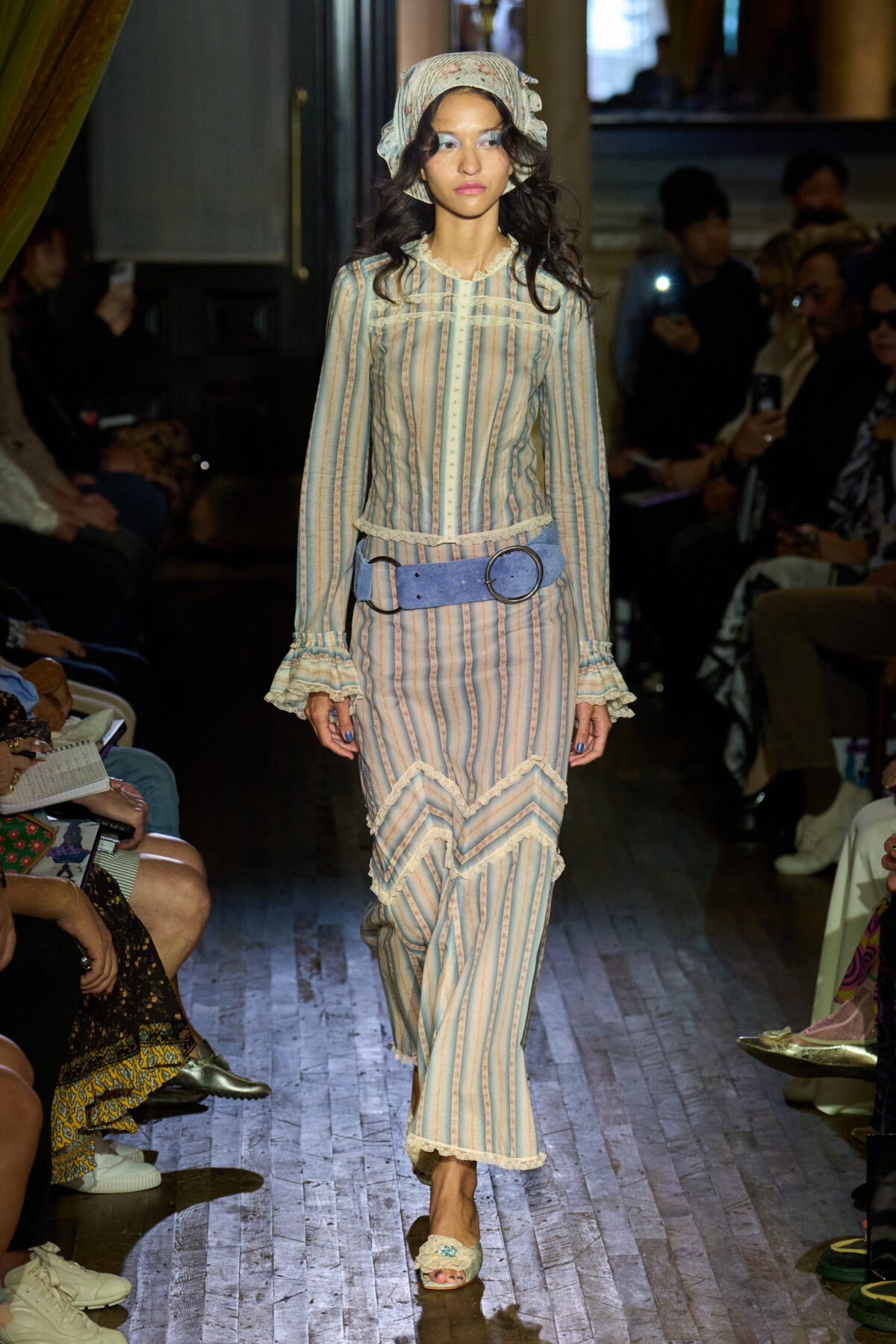 Lawrence’s heroine influenced the boudoir-ish vibes of the collection, from the lingerie pastels of the palette to the lace-edged slips and peignoirs. The results were more insouciant than sexy. Despite her decades in business, Sui has developed quite the youthful fan base of late. Chalk that up to the vintage-store-treasures feel of her clothes and the playful way she puts them together: a plaid cami over an eyelet babydoll over stripy pants, or tablecloth lace pj’s topped by a matching slip topped by a pointelle cardigan. Extra points for the Millicent Rogers curls and the electric blue eye shadow.