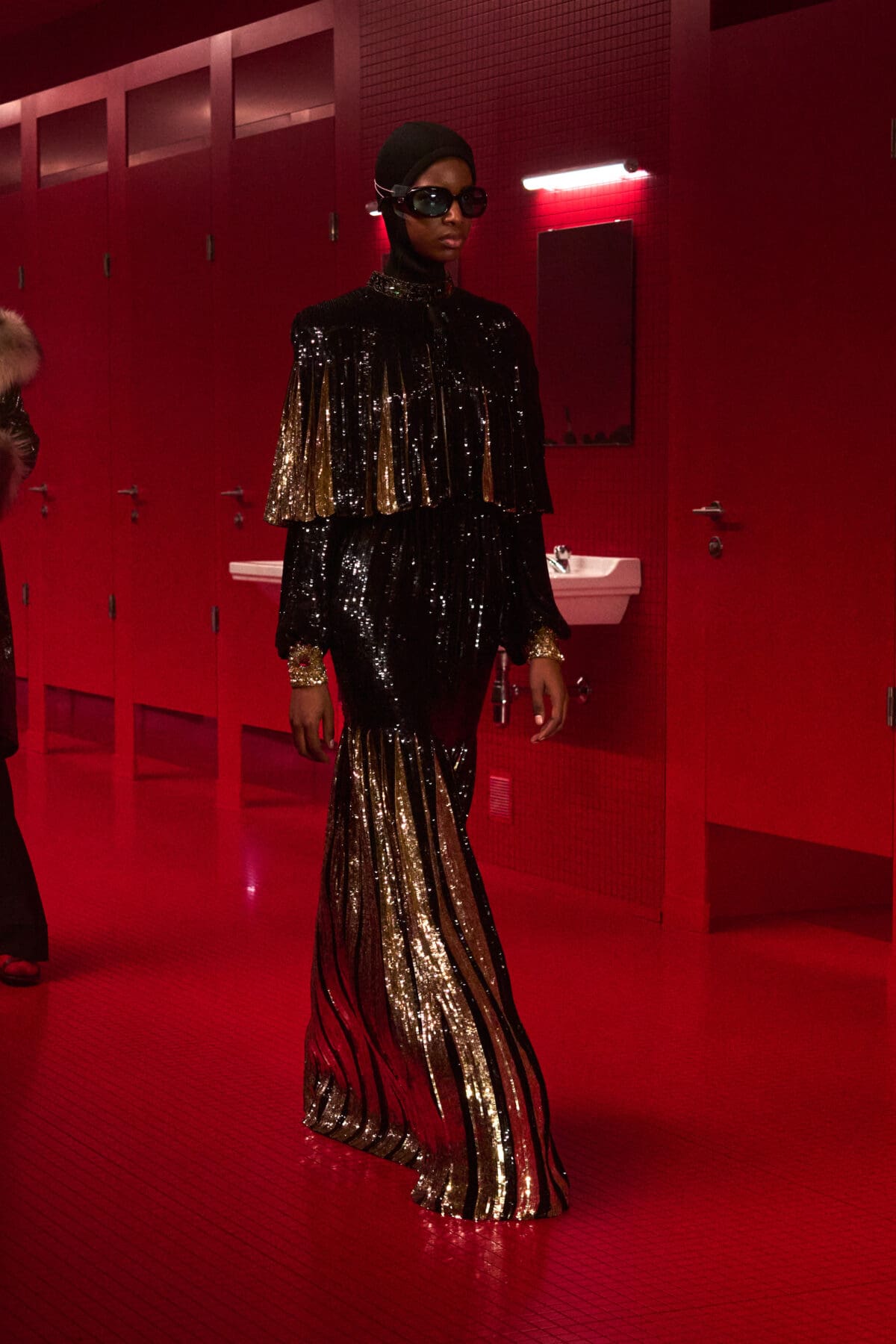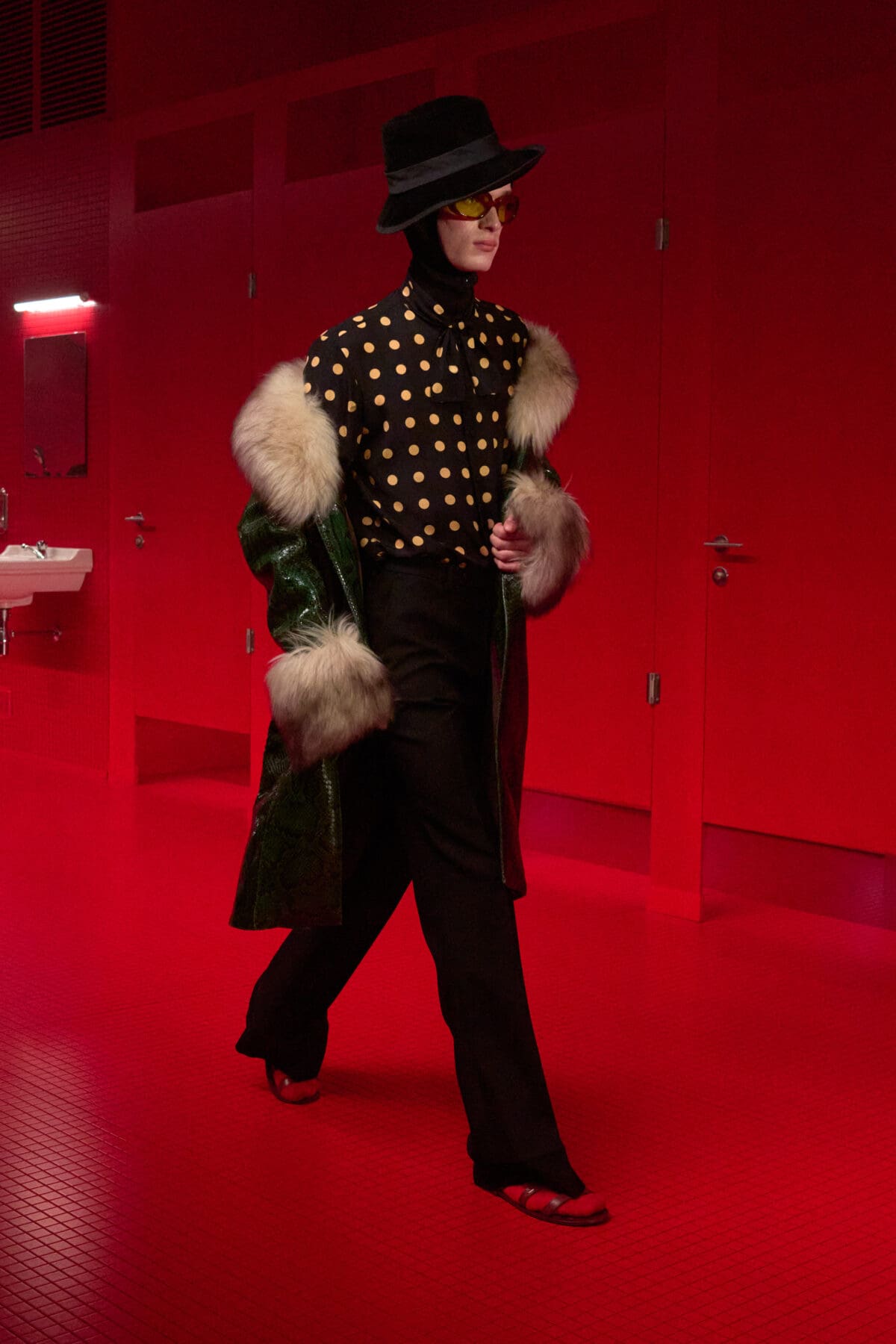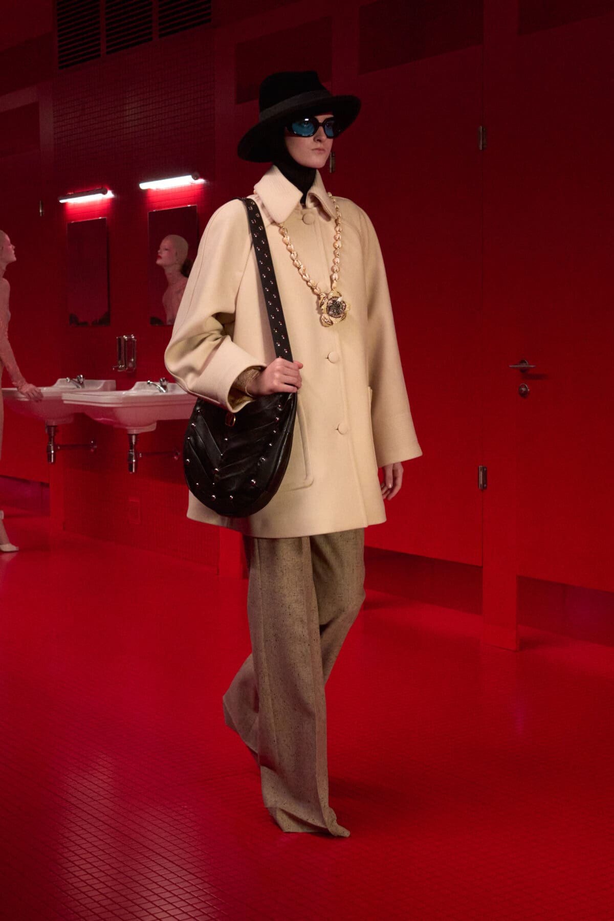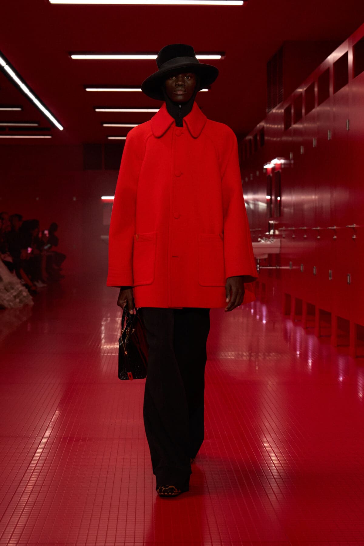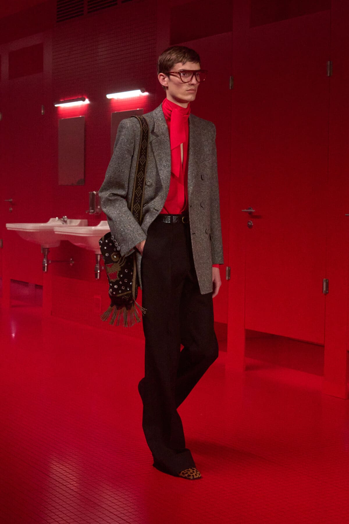 We’ll never look at Valentino red the same way again. That’s the thought that came to mind stepping through the bathroom doors into Alessandro Michele’s show space, an enormous public restroom bathed in lurid red light—a gender neutral restroom, as this was a co-ed show. Michele himself described the set as Lynchian, as in the late movie director David Lynch, but I saw The Shining, by Stanley Kubrick, via The Substance.