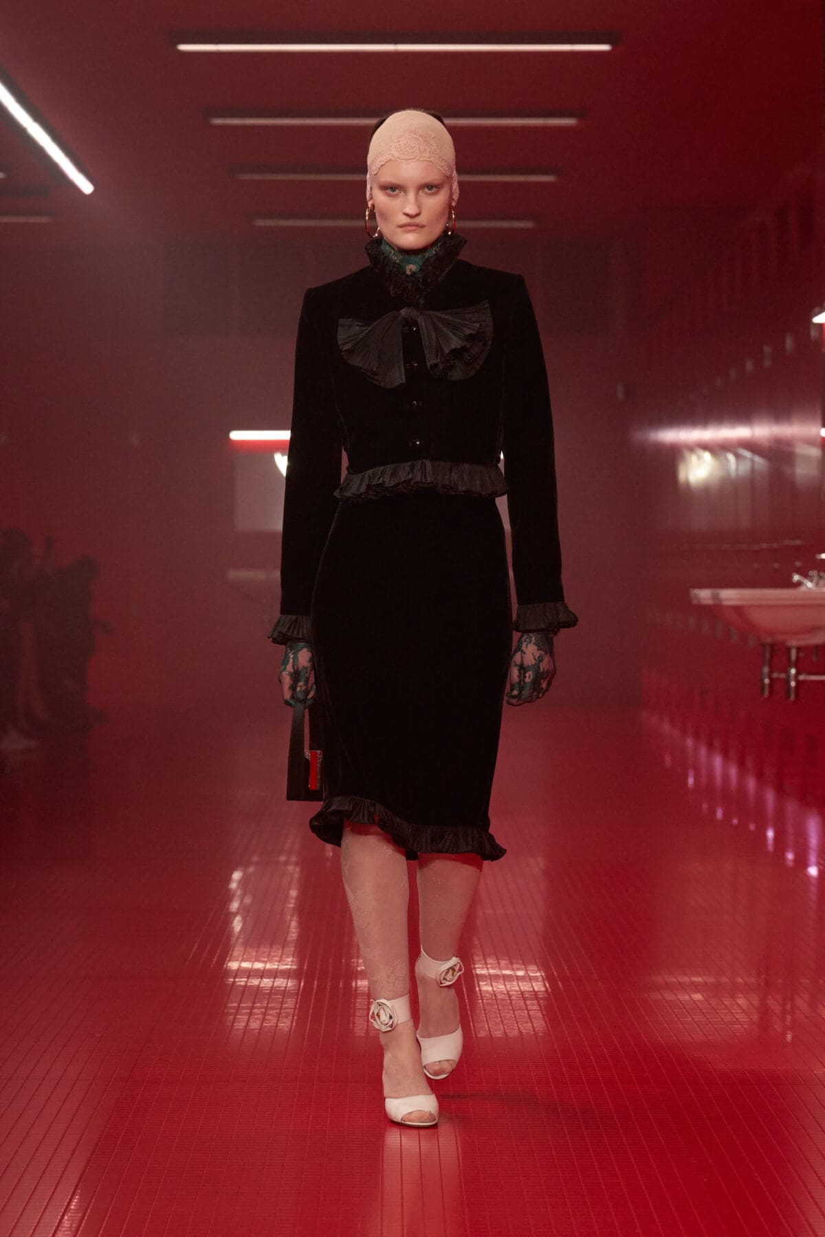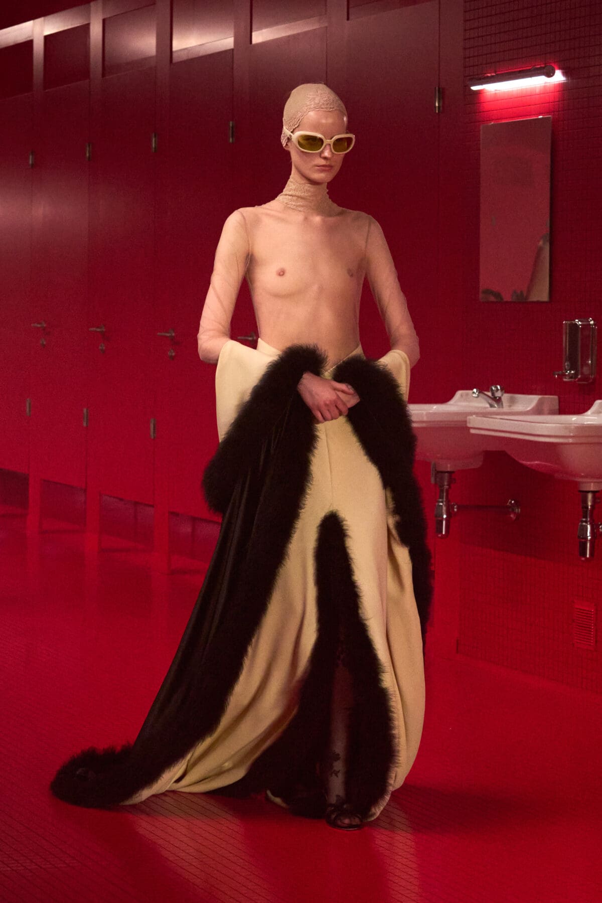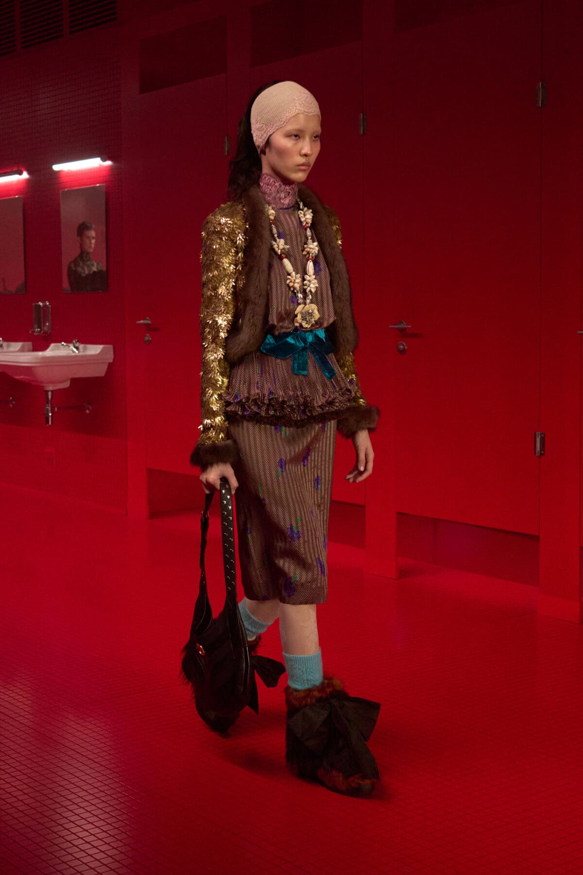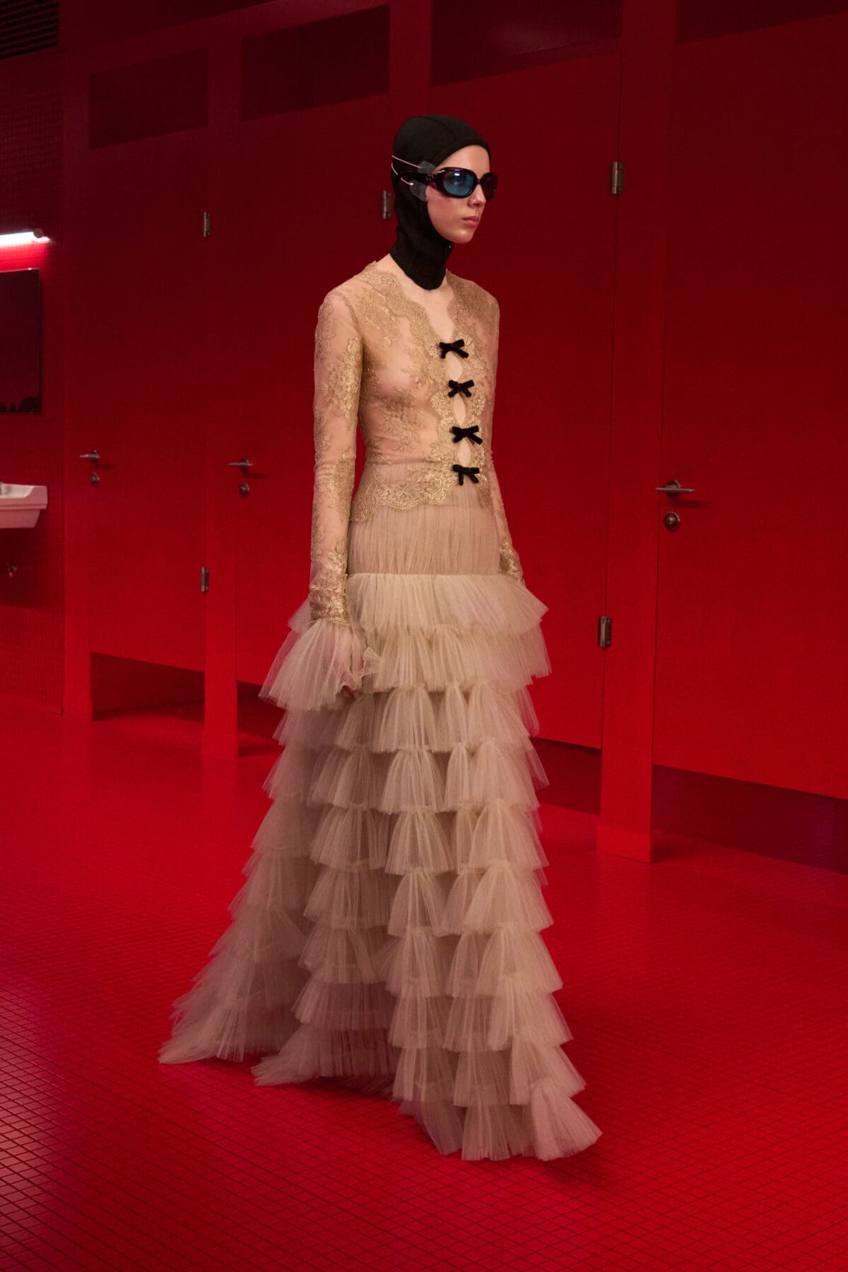We’ll never look at Valentino red the same way again. That’s the thought that came to mind stepping through the bathroom doors into Alessandro Michele’s show space, an enormous public restroom bathed in lurid red light—a gender neutral restroom, as this was a co-ed show. Michele himself described the set as Lynchian, as in the late movie director David Lynch, but I saw The Shining, by Stanley Kubrick, via The Substance.