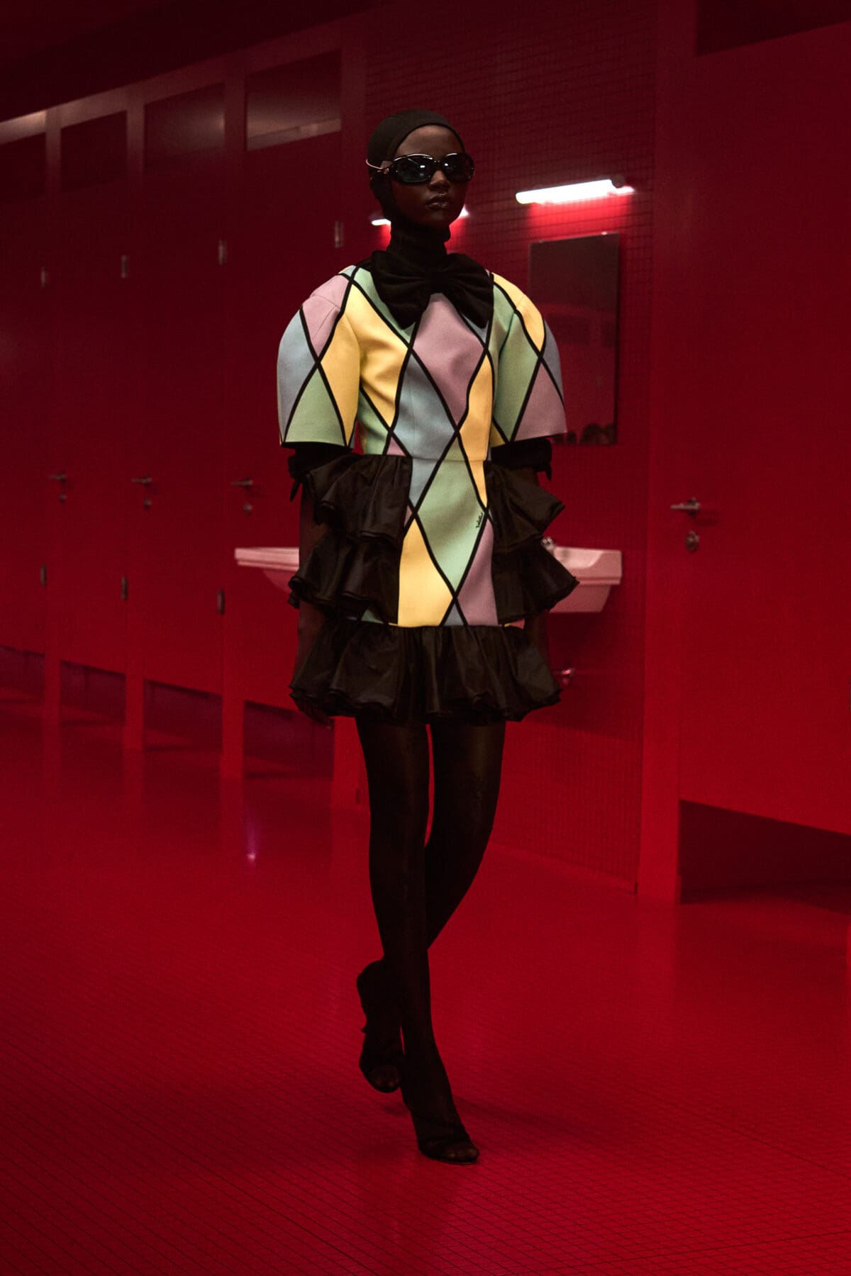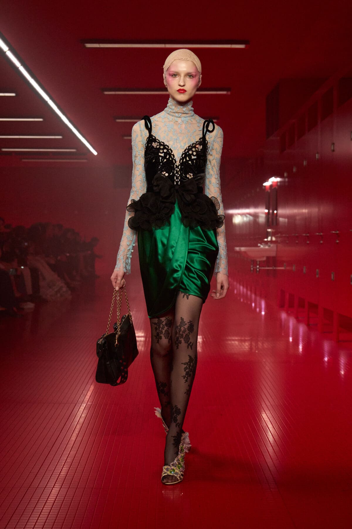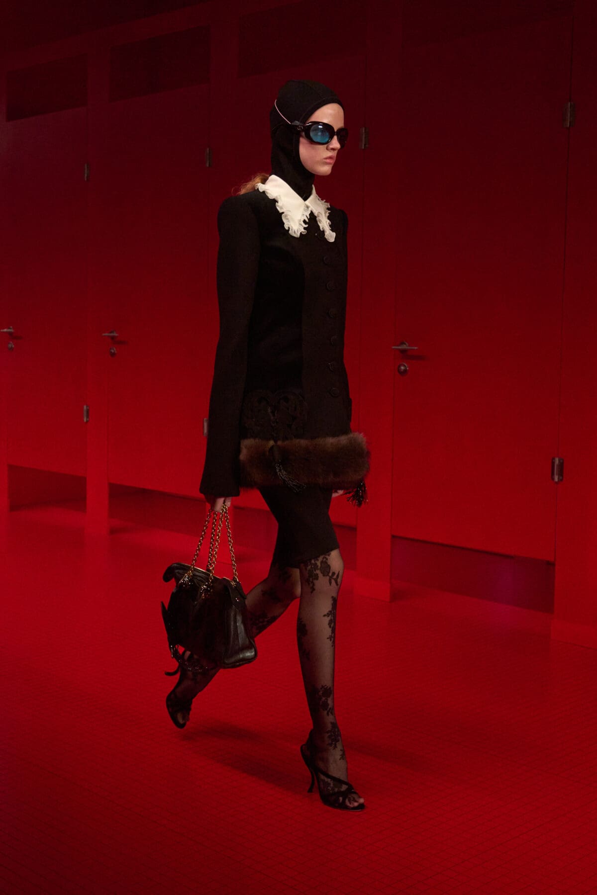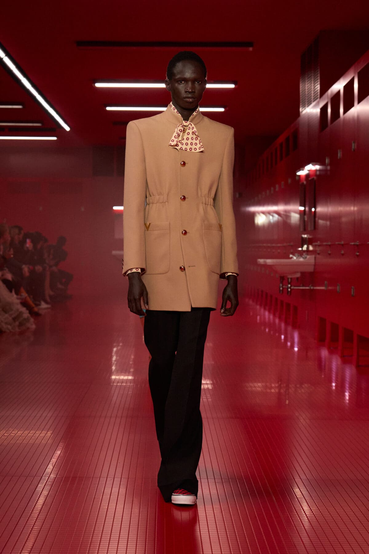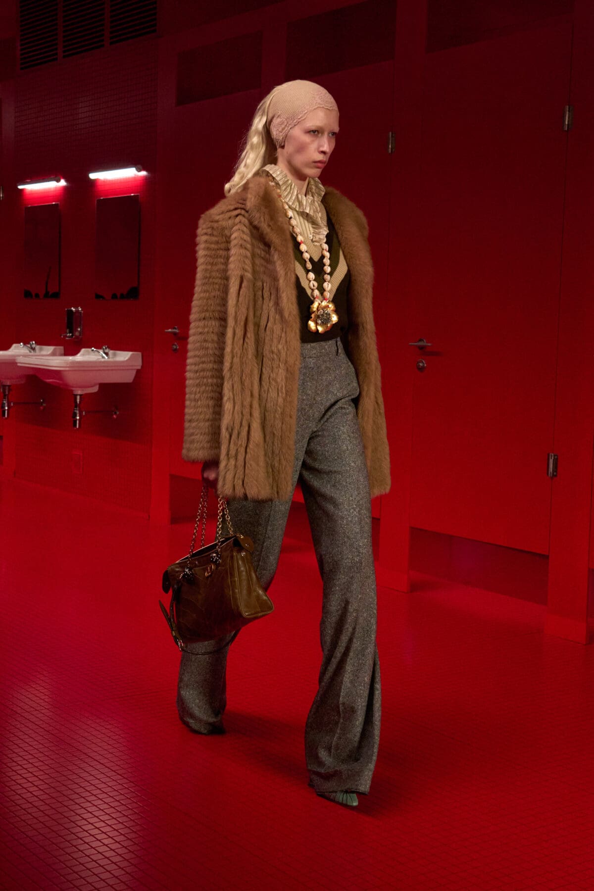 We’ll never look at Valentino red the same way again. That’s the thought that came to mind stepping through the bathroom doors into Alessandro Michele’s show space, an enormous public restroom bathed in lurid red light—a gender neutral restroom, as this was a co-ed show. Michele himself described the set as Lynchian, as in the late movie director David Lynch, but I saw The Shining, by Stanley Kubrick, via The Substance.