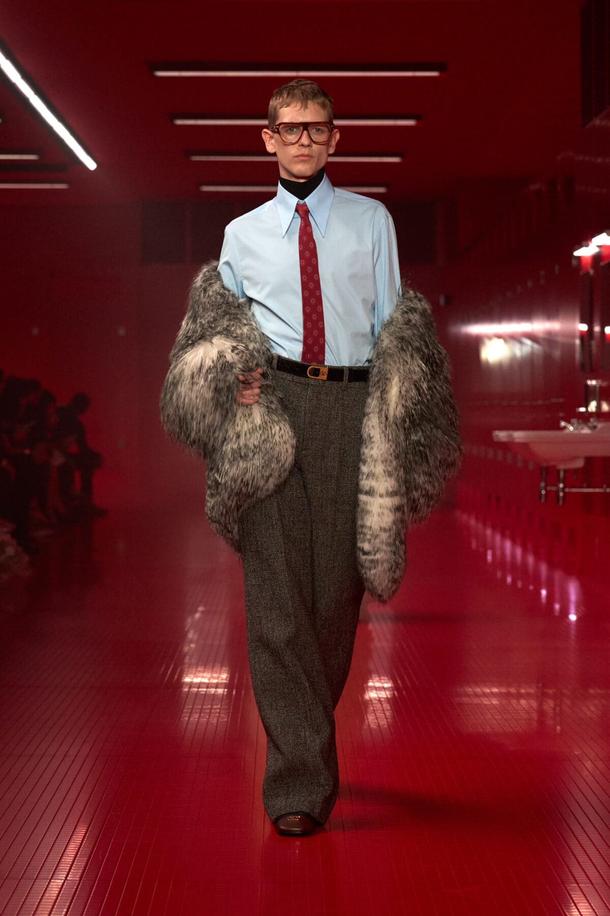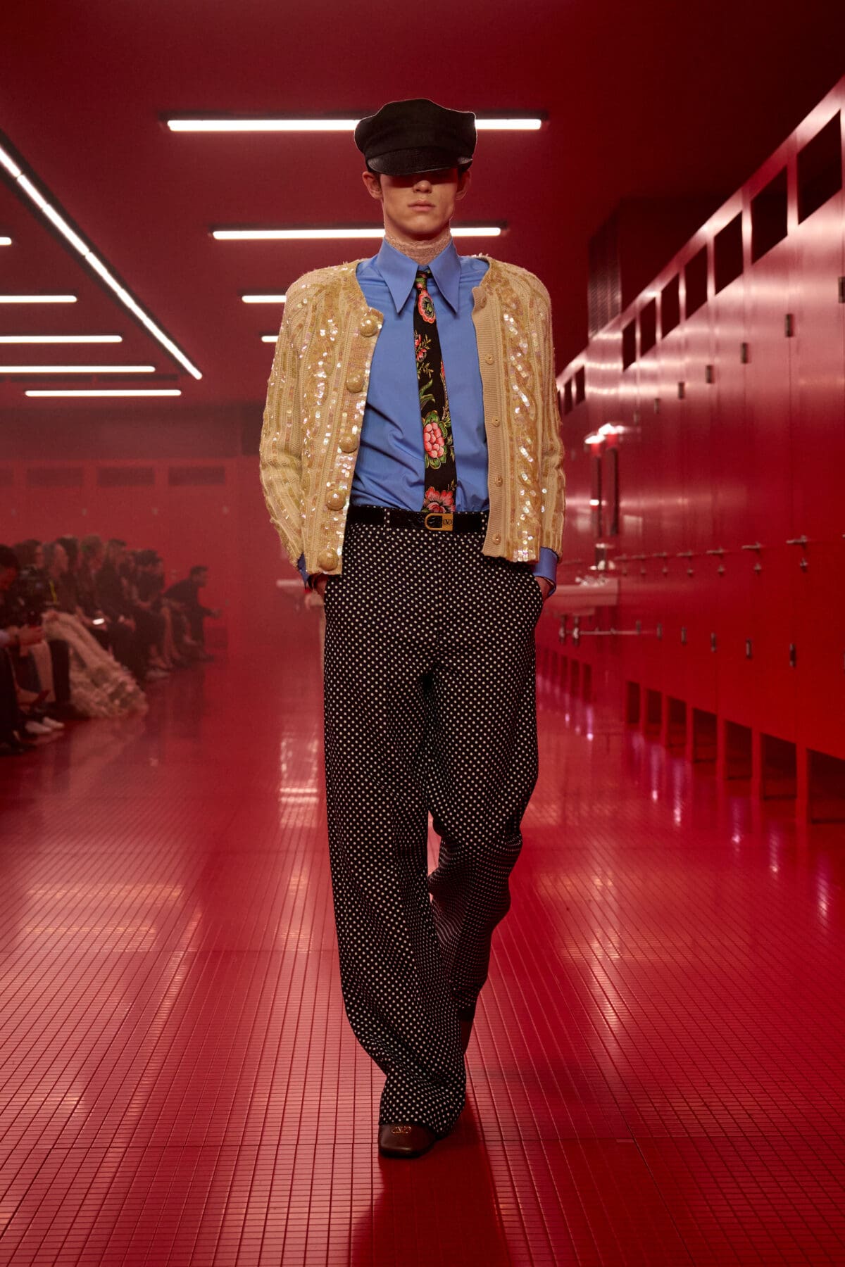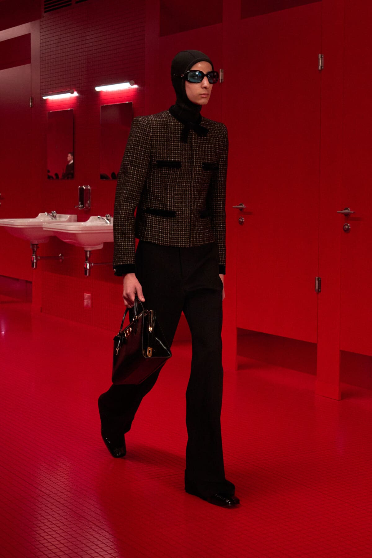 This was Michele’s second ready-to-wear show for the brand. The reaction to his first was mixed, with some suggesting that the former Gucci creative director wasn’t trying hard enough to reinvent. The sound of a toilet flushing told us all we needed to know regarding how he felt about that criticism. Officially, the show was about exploring the performative nature of intimacy (hence the public private space of the lavatory). But as one of fashion’s thought leaders on gender fluidity— Michele’s very first Gucci show having given us the men’s pussy bow blouse—he could also have been providing a sharp commentary on the rising tide of anti-trans hate.