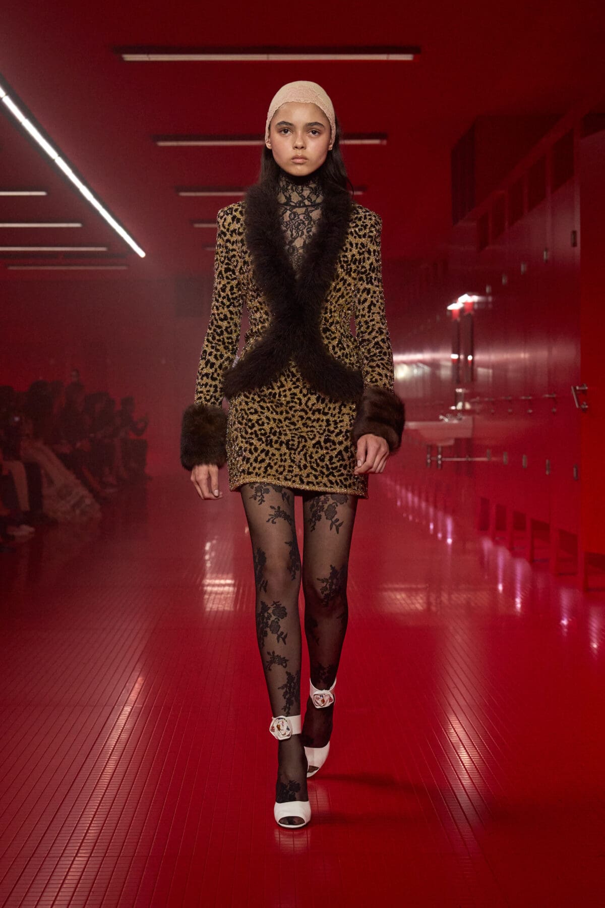 At a preview in Valentino’s Place Vendôme headquarters, Michele focused on the challenge of updating the house’s legacy. “It’s complicated here: You have to find a balance between contemporary maximalism and making it relevant because otherwise you risk the brand being frozen. So I’m trying to manipulate the past to make it now.” He did that by grounding the collection in a more familiar reality. Look 2’s slouchy tweed pants, v-neck sweater, and faux fur jacket could easily slide into a street style photo gallery, and look 8’s peekaboo bustier top and high-waisted ’70s jeans wouldn’t be out of place at Caviar Kaspia late night. Michele also worked on a collaboration with Vans, but his efforts extended beyond the denim and the sneakers to the show’s undone, almost work-in-progress spirit. The hems on all the pants had been let down and models wore their hair back in knit headbands and balaclavas. No blowouts here. And then there were the bodysuits, unsnapped over lacy tights.