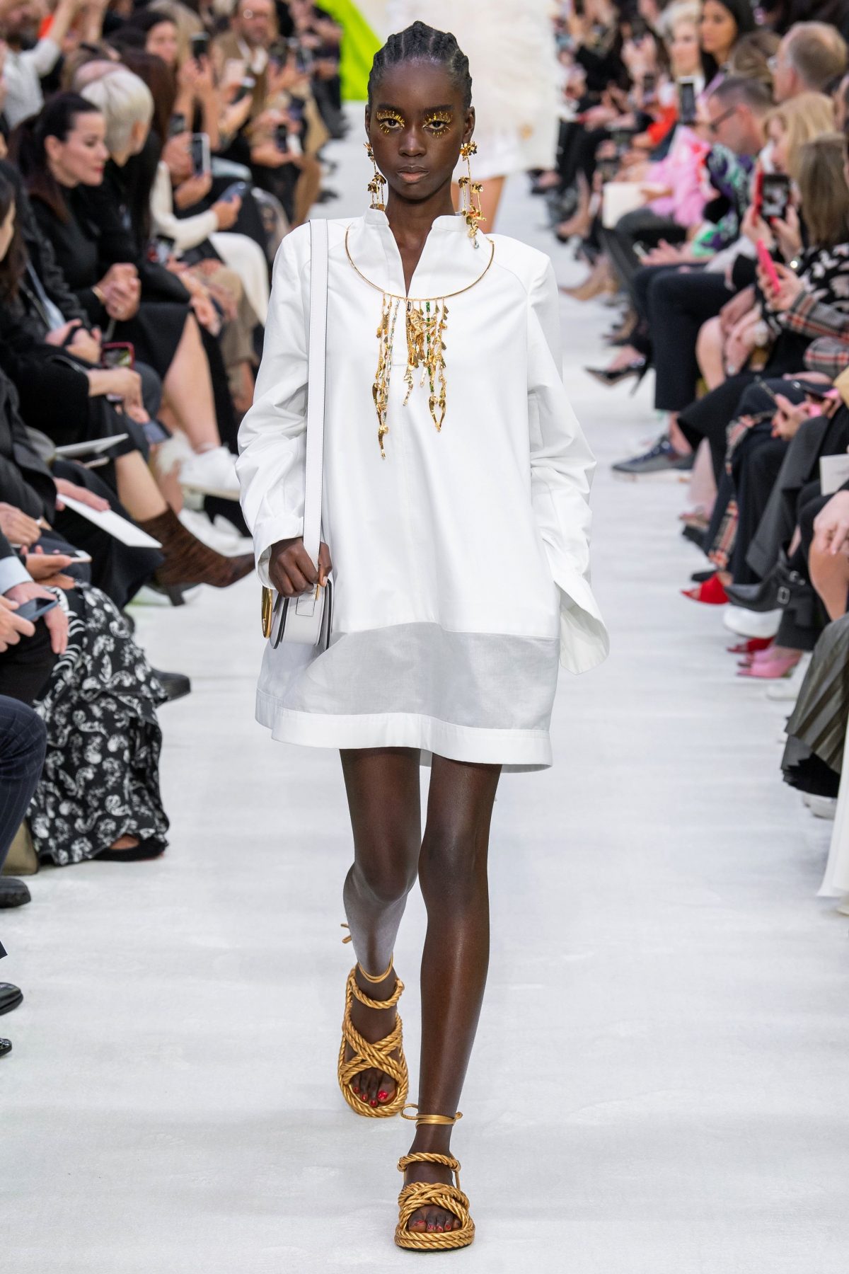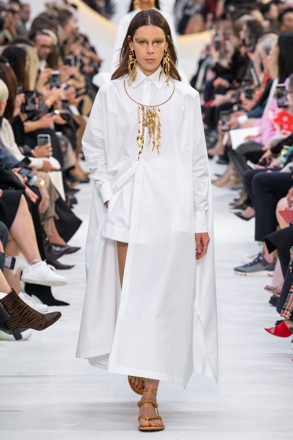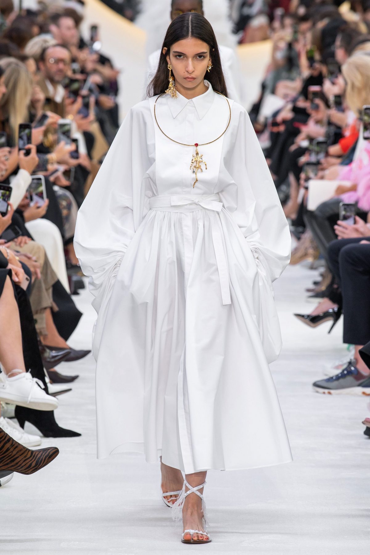Dresses of fantastical colour and volume have become the hallmark of Pierpaolo Piccioli’s Valentino, but for Spring/Summer 2020, the creative director exercised the art of “taking away” with an opening meditation on the humble white shirt. “I wanted to work on something universal, to get back to the essence of shape and volume,” he said. And so the show opened, set to the honeyed tune of Frank Ocean’s cover of “Moon River,” with twelve all-white looks built on “ordinary” pieces like the shirtdress, the Bermuda shorts, the pencil skirt, all rendered in cotton poplin and with couture-like artistry.