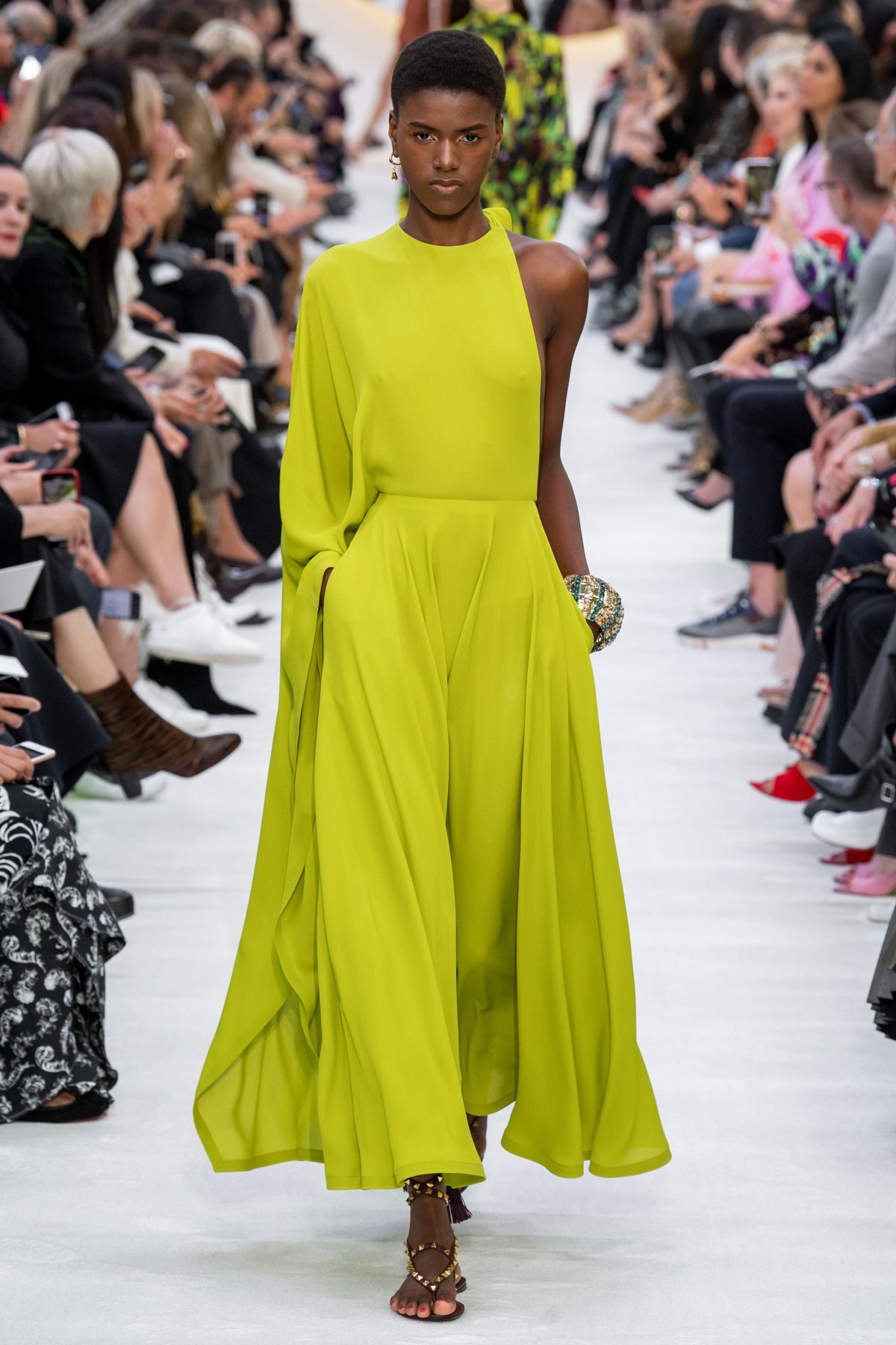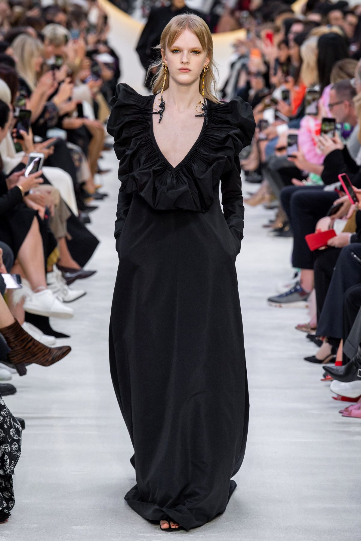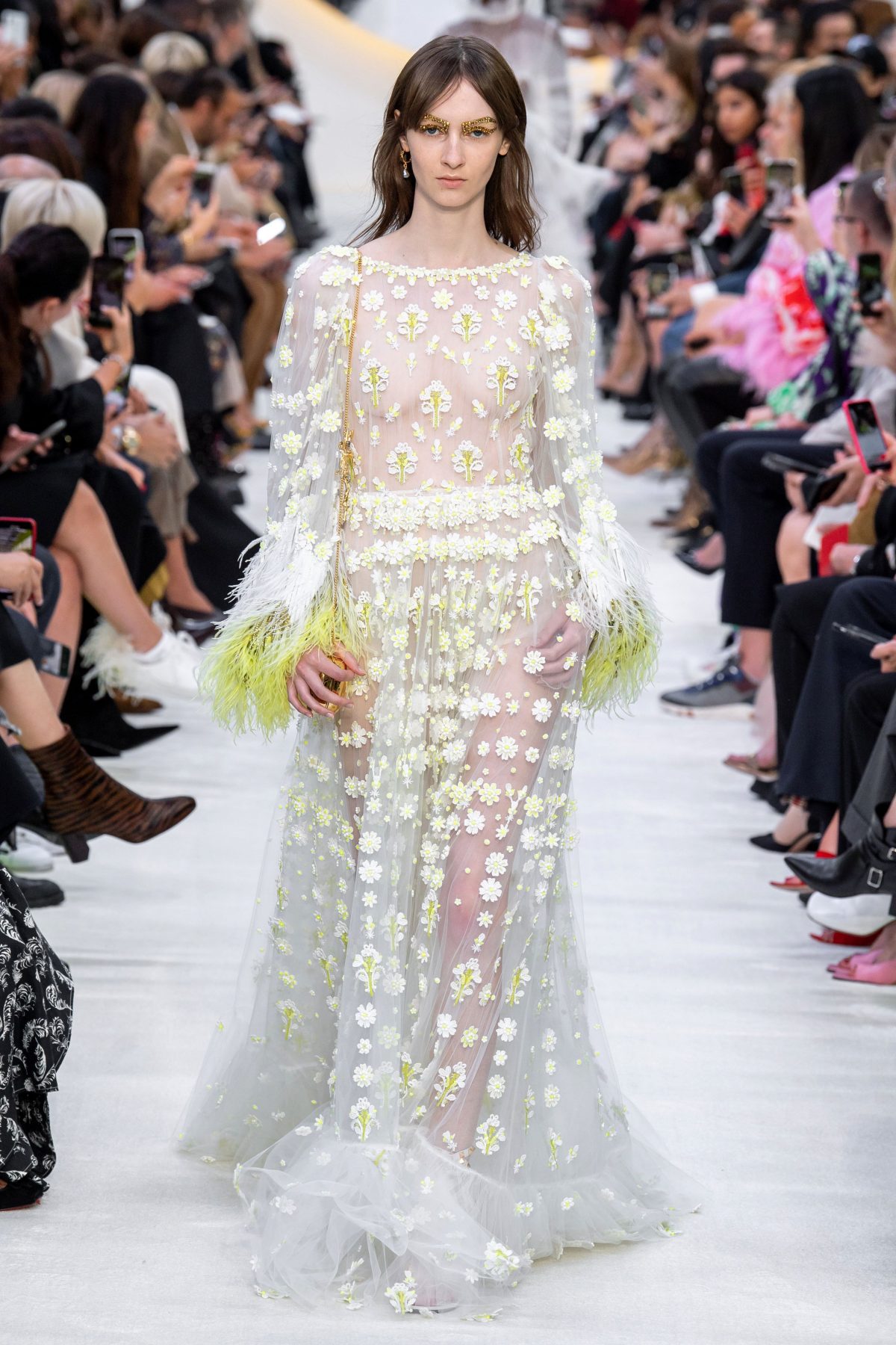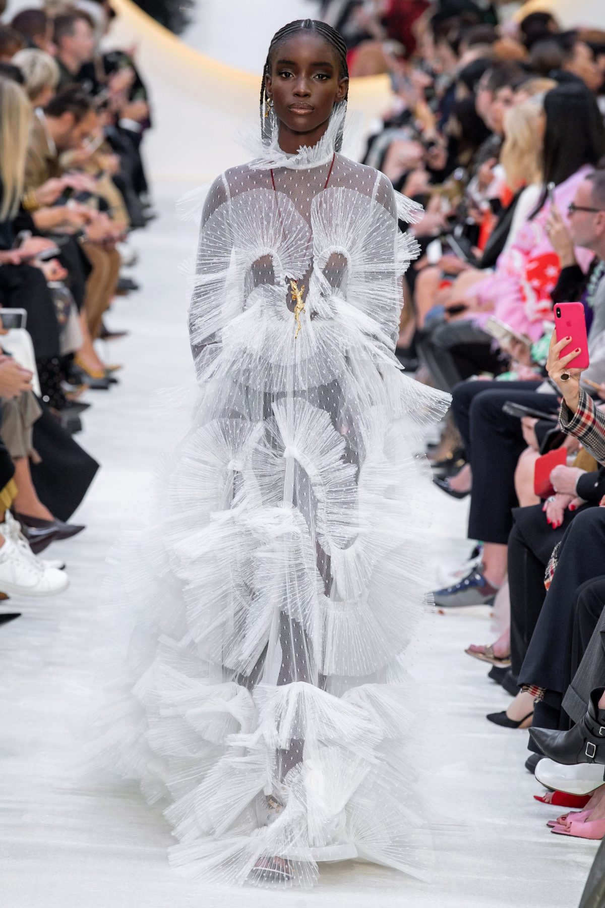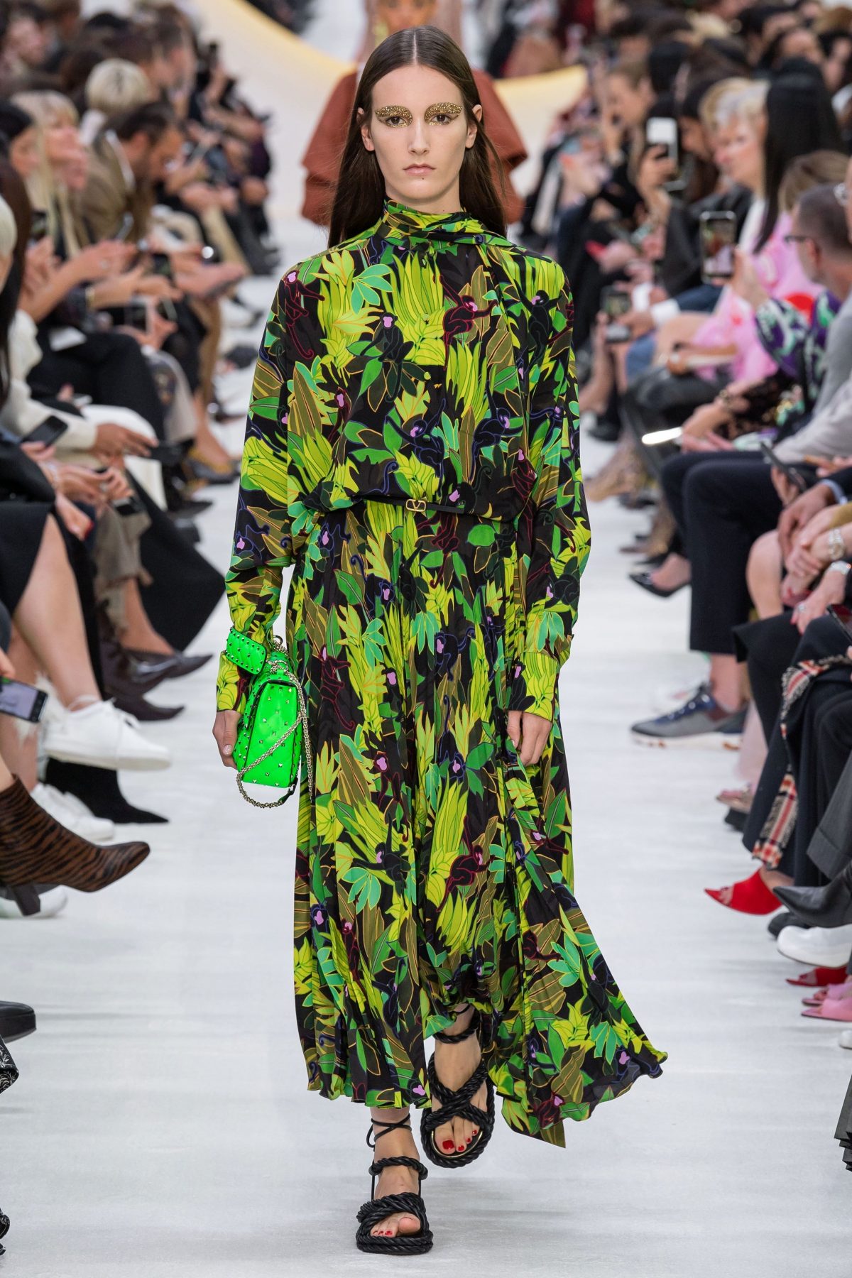The purity of form was offset only by subtle glints of gold jewellery and shimmer-y makeup before compact bursts of fluorescent colour charged forth as single-tone dresses. Then came bold prints of the jungle variety, increasing in complexity with layers of sequins and embellishments, before the saturation paled once more, returning to the painting technique of grisaille. “It brings the attention from the dress per se to the personality that gives life to it, from the object to the individual” Piccioli mentioned in his show notes. The show closed with an all-white sheer polka-dot tulle gown, iced with meandering pleated ruffles of immaculate craftsmanship like a paper-thin sculpture. And then the audience was brought to their feet once more for a standing ovation as Minnie Ripperton’s “Lovin’ You” fluttered in the background.