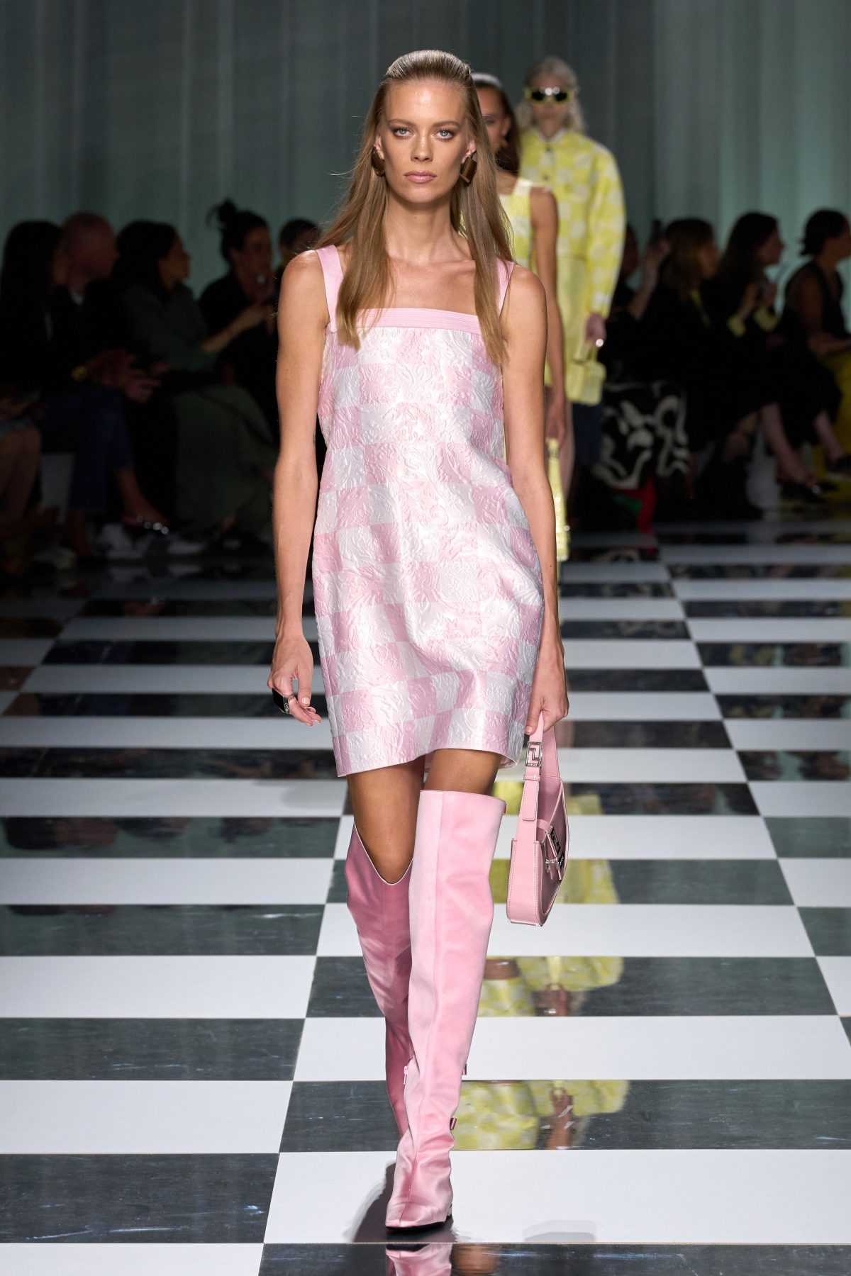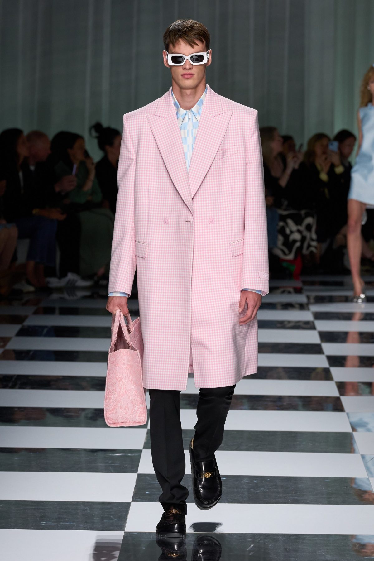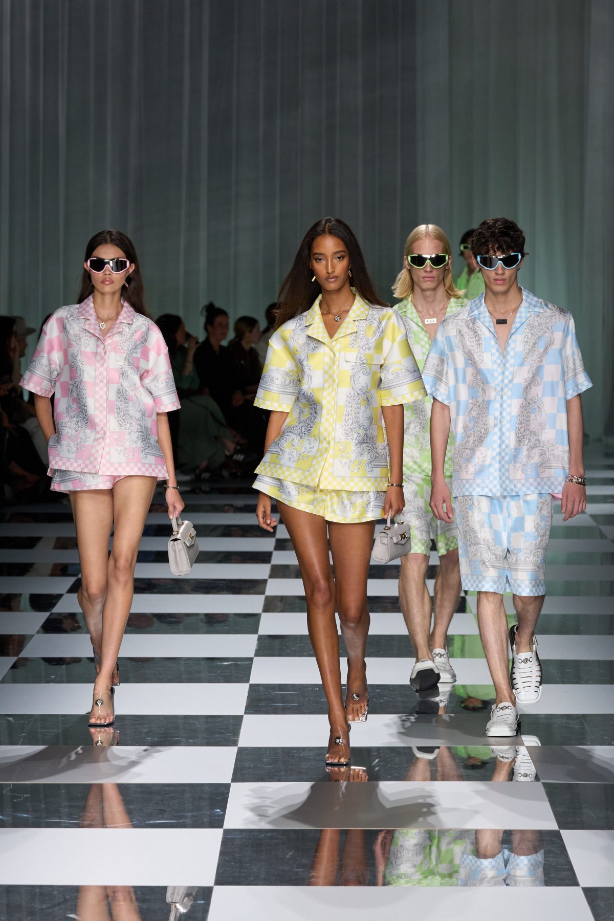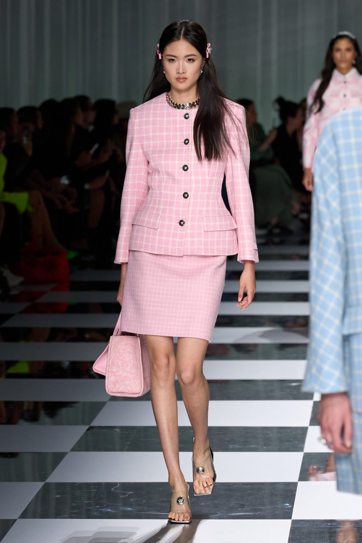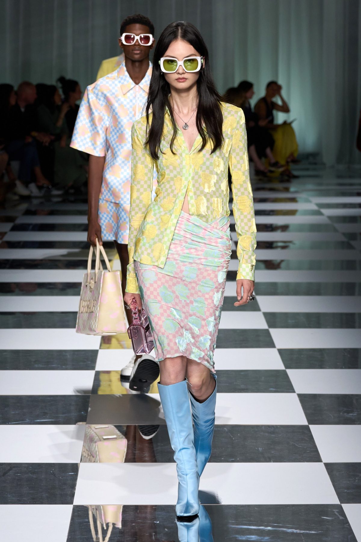“It’s a powerful woman with a touch of sweetness,” Donatella Versace said in a preview, surrounded by sorbet-coloured cotton tweed suits and chainmail dresses adorned with her brother Gianni’s chequerboard motif from spring/summer 1982. “There’s a sweetness in the menswear, too. He shows his personality through softness,” she added. The collection presented a shared wardrobe that felt like a cementation of the times we’ve been living through lately. After a pastel-clad Barbiecore summer of bubblegum-chewing Gen Zs and the generations in their wake, Versace’s girlie skirt-suits and cartoon tailoring were a walking manifesto to the zeitgeist. Of course, her brother did all of this for spring/summer 1995, but what’s 30 years between fashion proposals and mainstream evolution?