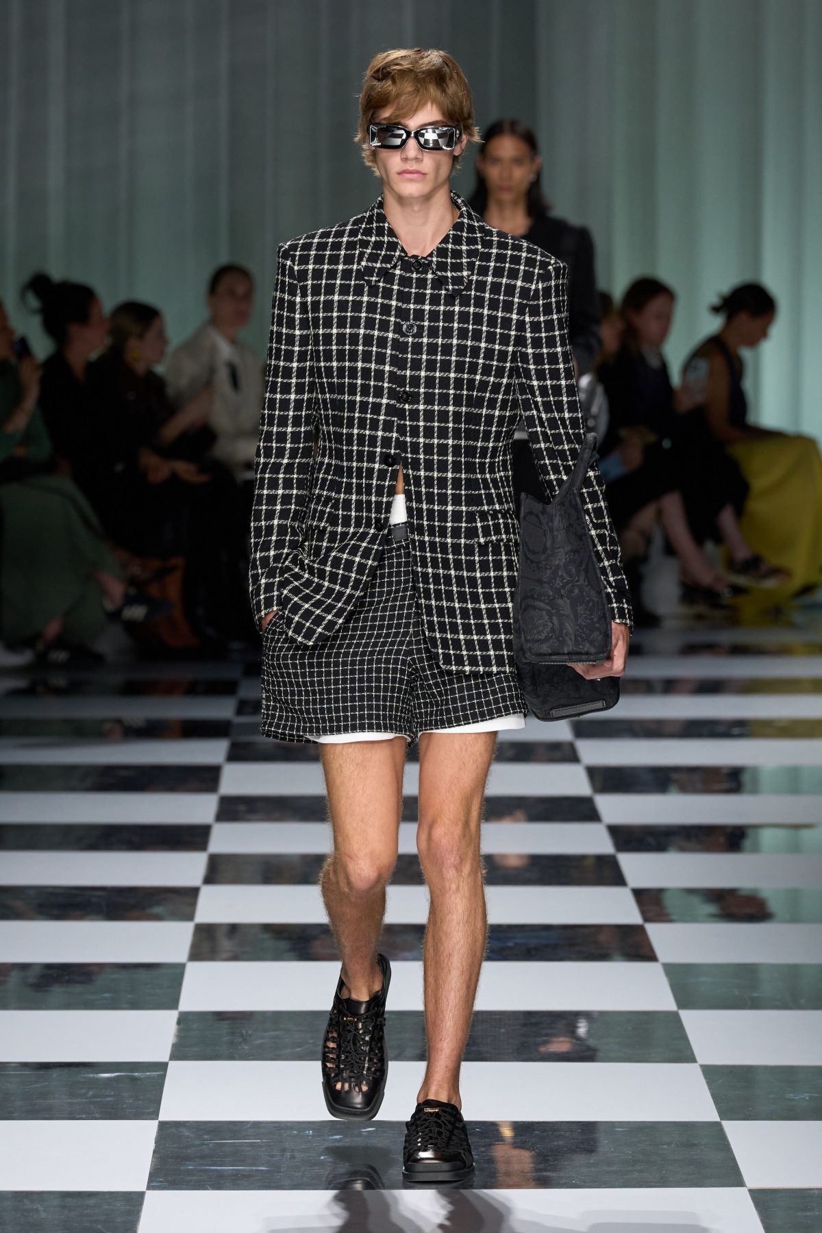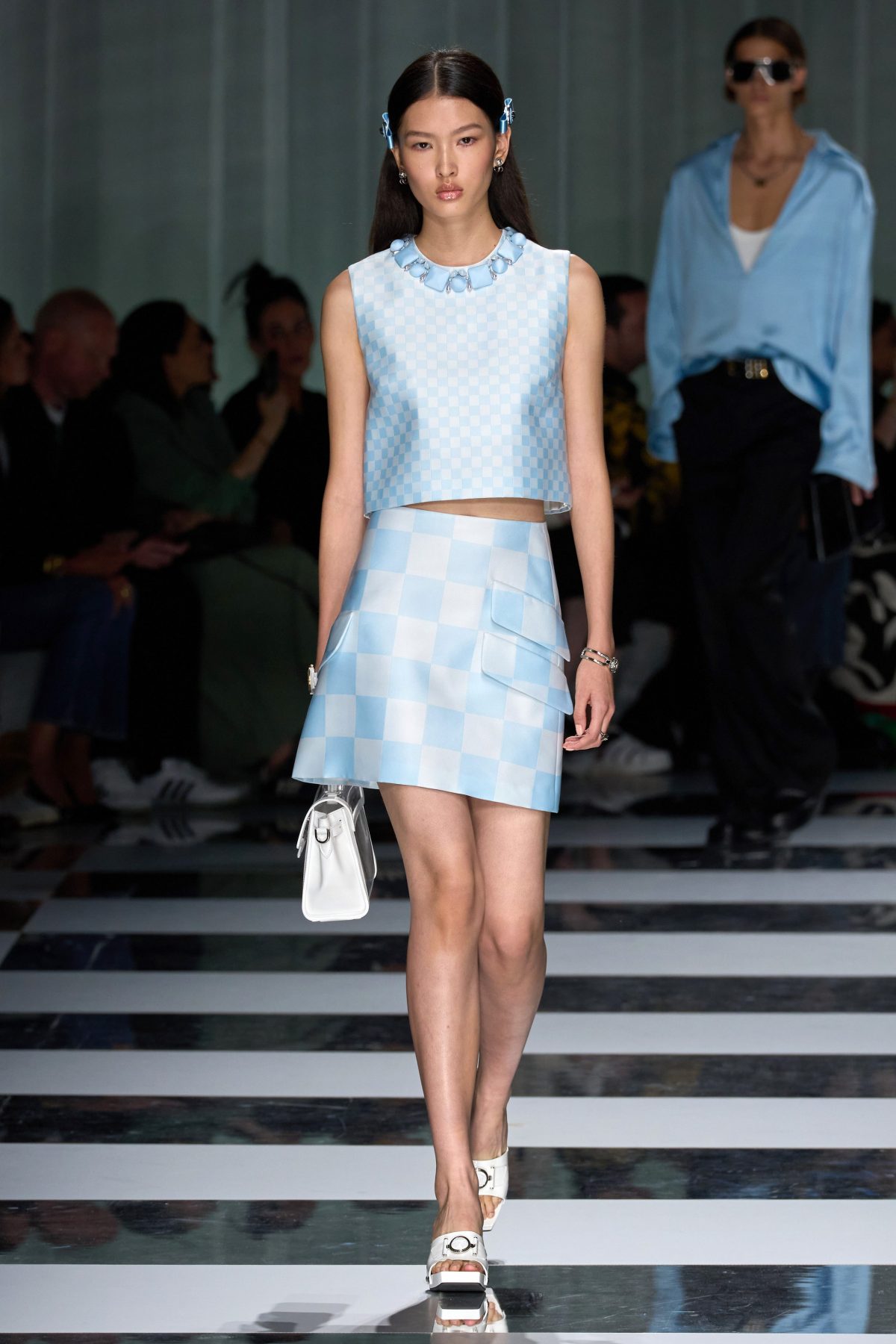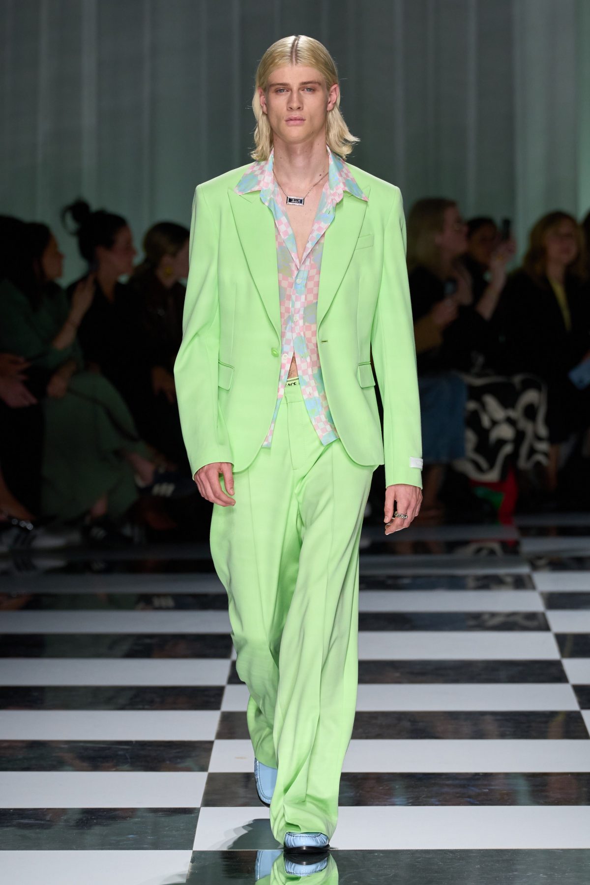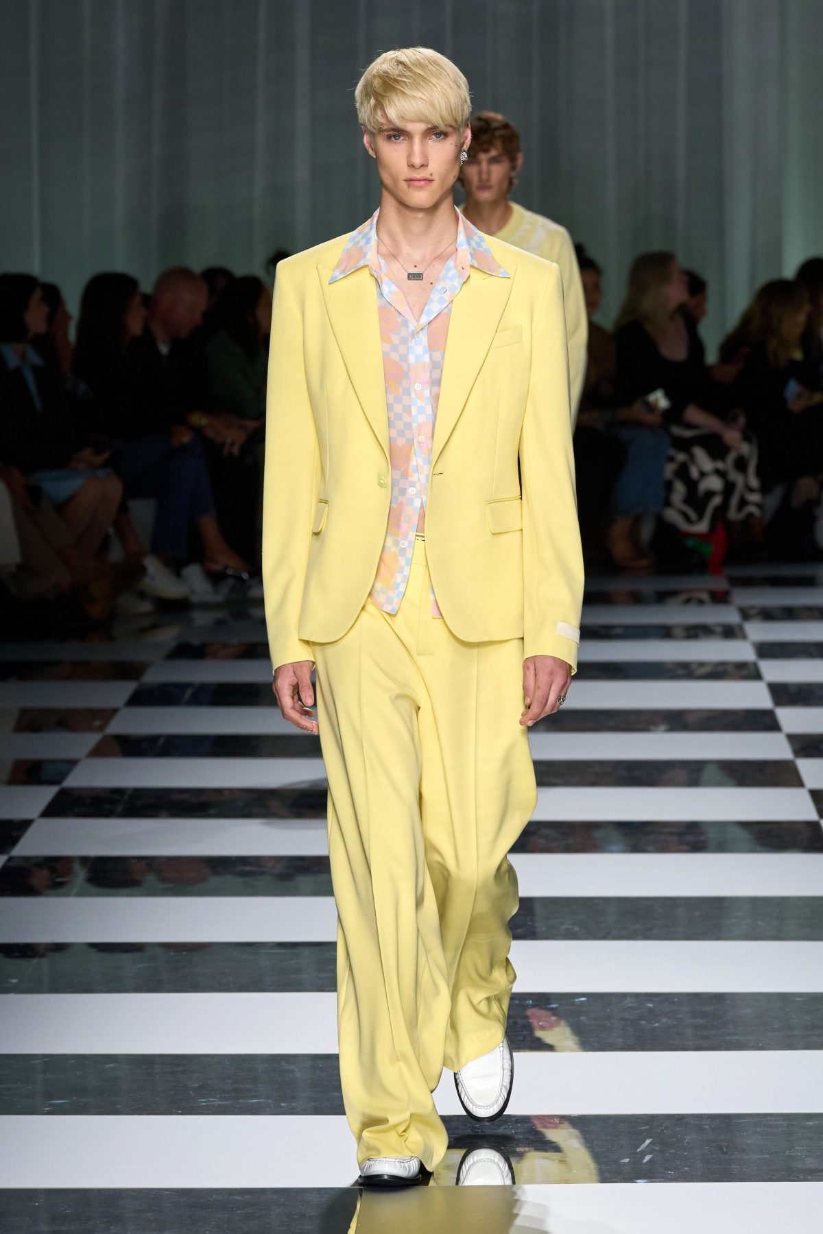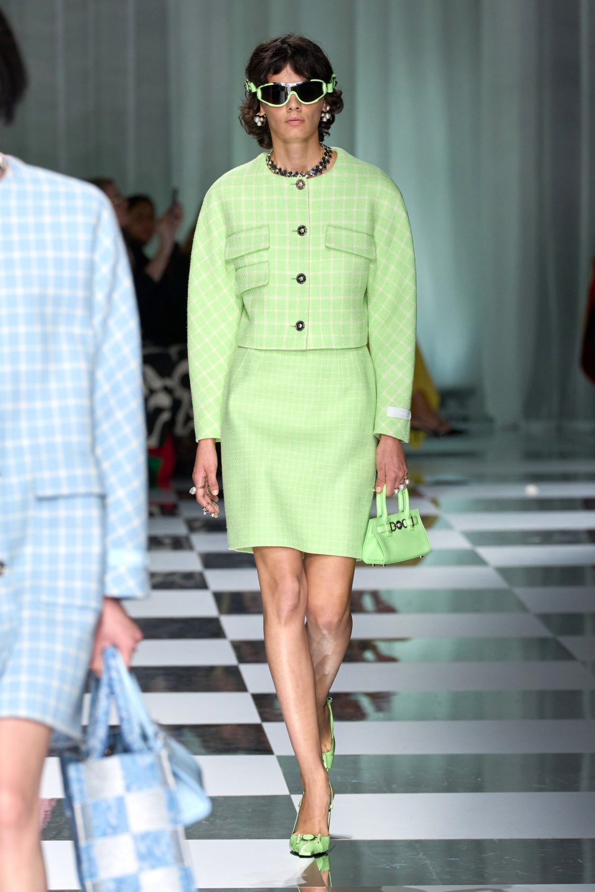 “It’s a powerful woman with a touch of sweetness,” Donatella Versace said in a preview, surrounded by sorbet-coloured cotton tweed suits and chainmail dresses adorned with her brother Gianni’s chequerboard motif from spring/summer 1982. “There’s a sweetness in the menswear, too. He shows his personality through softness,” she added. The collection presented a shared wardrobe that felt like a cementation of the times we’ve been living through lately. After a pastel-clad Barbiecore summer of bubblegum-chewing Gen Zs and the generations in their wake, Versace’s girlie skirt-suits and cartoon tailoring were a walking manifesto to the zeitgeist. Of course, her brother did all of this for spring/summer 1995, but what’s 30 years between fashion proposals and mainstream evolution?