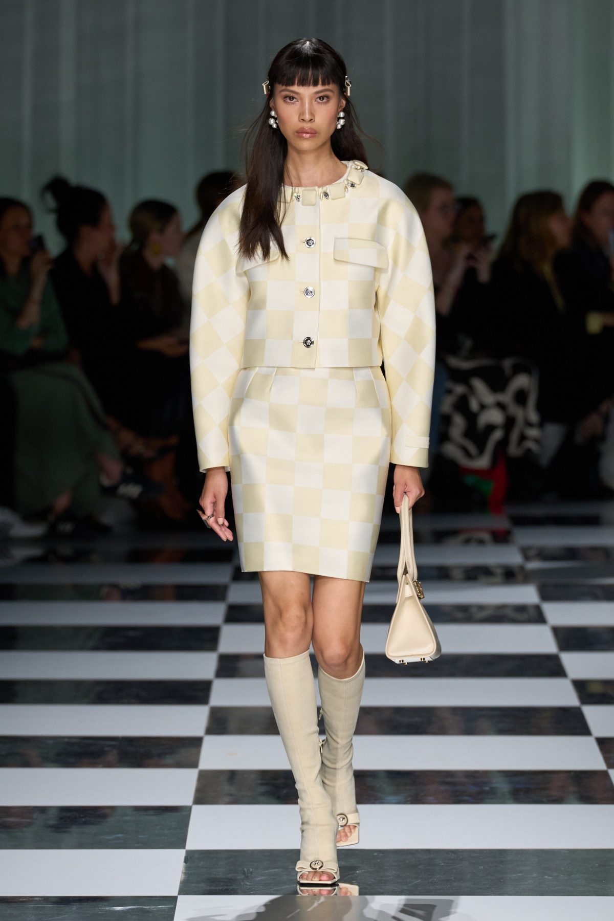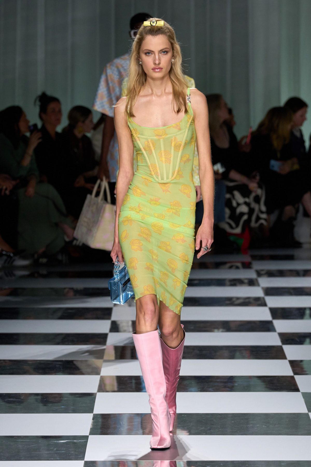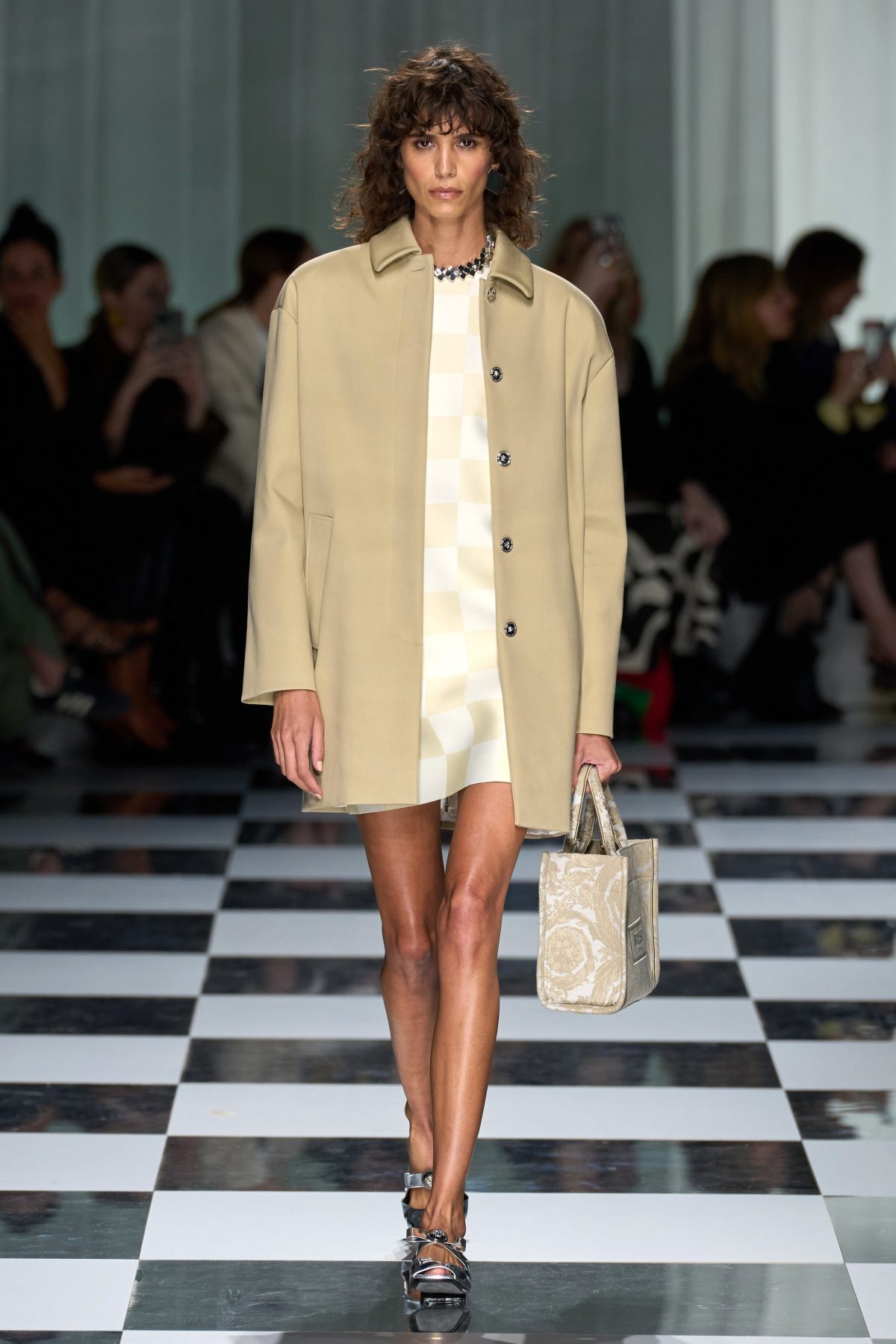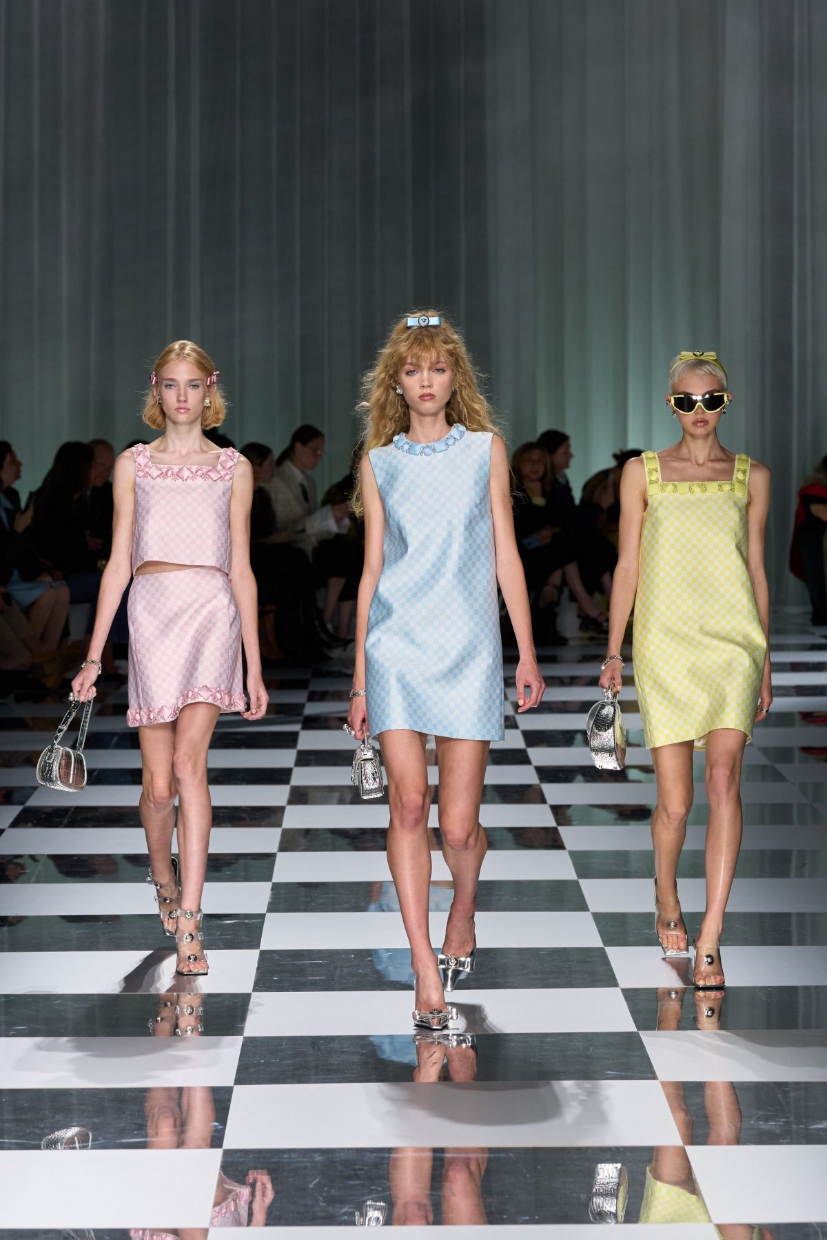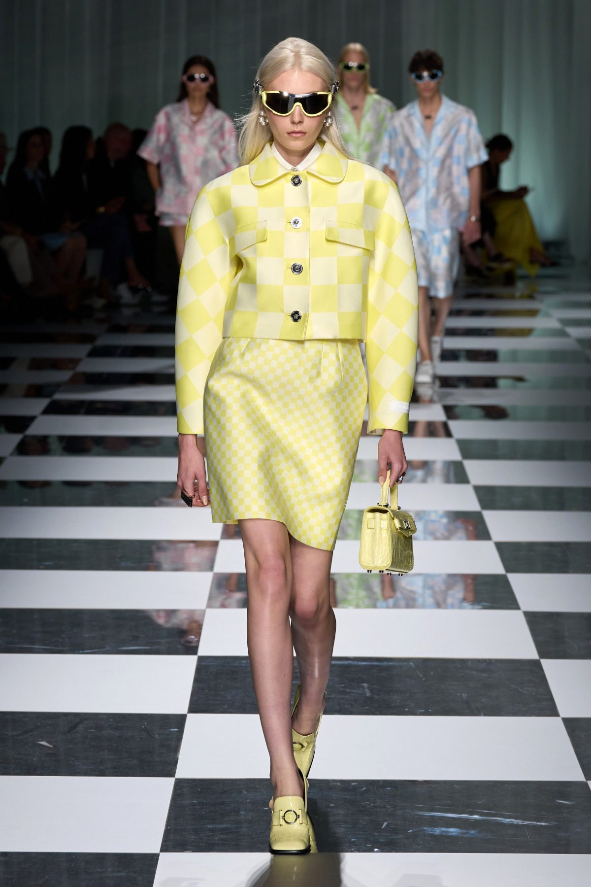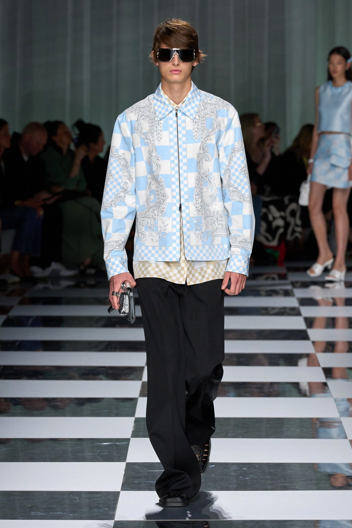 “It’s a powerful woman with a touch of sweetness,” Donatella Versace said in a preview, surrounded by sorbet-coloured cotton tweed suits and chainmail dresses adorned with her brother Gianni’s chequerboard motif from spring/summer 1982. “There’s a sweetness in the menswear, too. He shows his personality through softness,” she added. The collection presented a shared wardrobe that felt like a cementation of the times we’ve been living through lately. After a pastel-clad Barbiecore summer of bubblegum-chewing Gen Zs and the generations in their wake, Versace’s girlie skirt-suits and cartoon tailoring were a walking manifesto to the zeitgeist. Of course, her brother did all of this for spring/summer 1995, but what’s 30 years between fashion proposals and mainstream evolution?