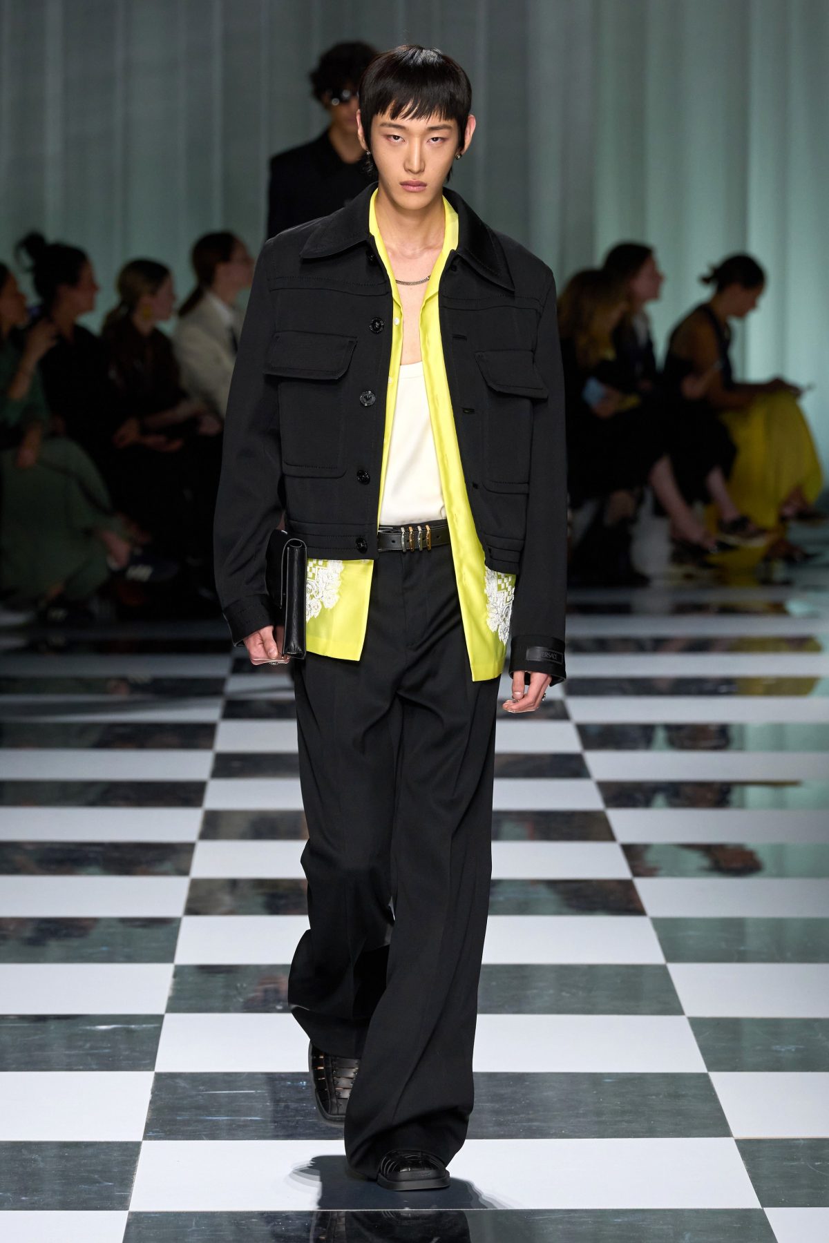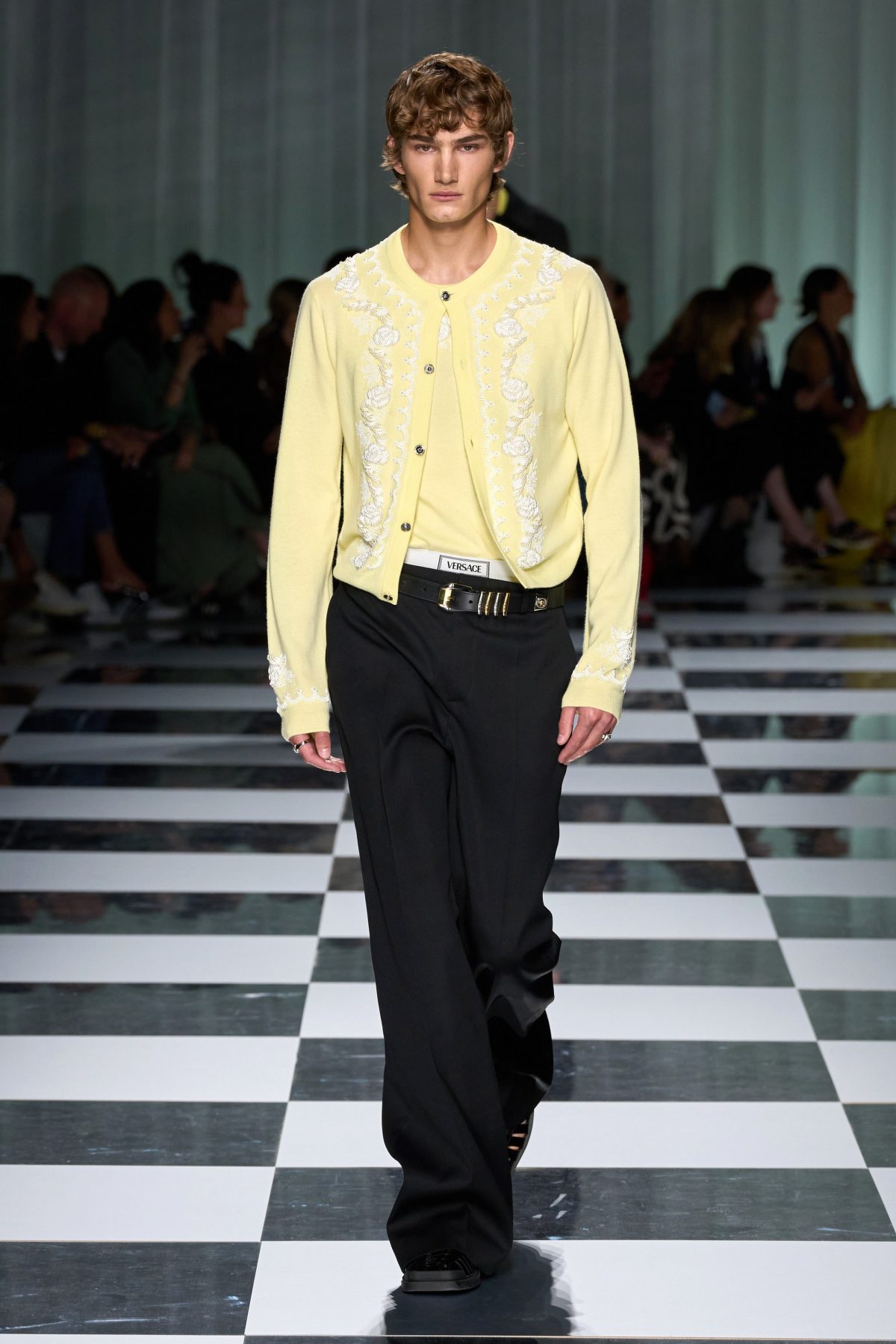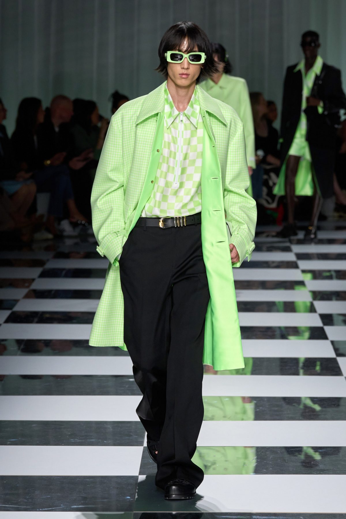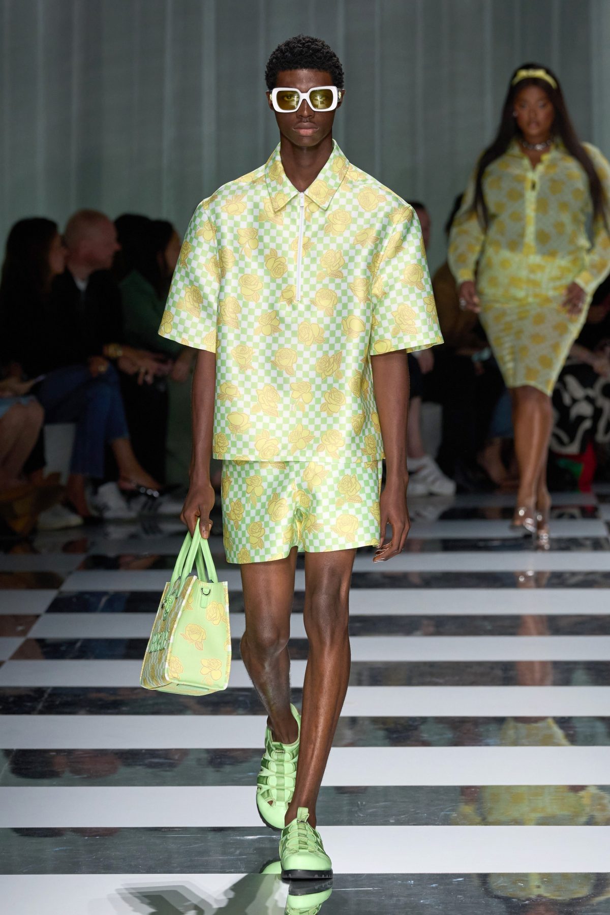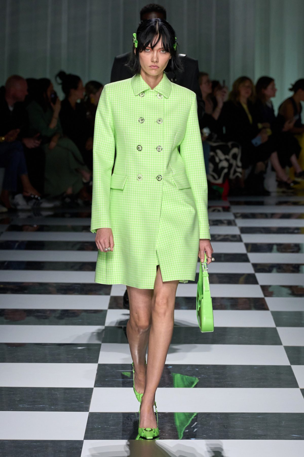“It’s a powerful woman with a touch of sweetness,” Donatella Versace said in a preview, surrounded by sorbet-coloured cotton tweed suits and chainmail dresses adorned with her brother Gianni’s chequerboard motif from spring/summer 1982. “There’s a sweetness in the menswear, too. He shows his personality through softness,” she added. The collection presented a shared wardrobe that felt like a cementation of the times we’ve been living through lately. After a pastel-clad Barbiecore summer of bubblegum-chewing Gen Zs and the generations in their wake, Versace’s girlie skirt-suits and cartoon tailoring were a walking manifesto to the zeitgeist. Of course, her brother did all of this for spring/summer 1995, but what’s 30 years between fashion proposals and mainstream evolution?