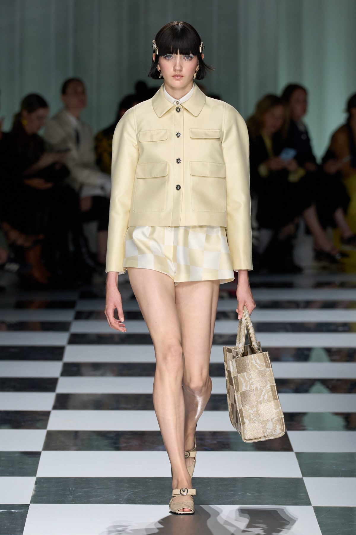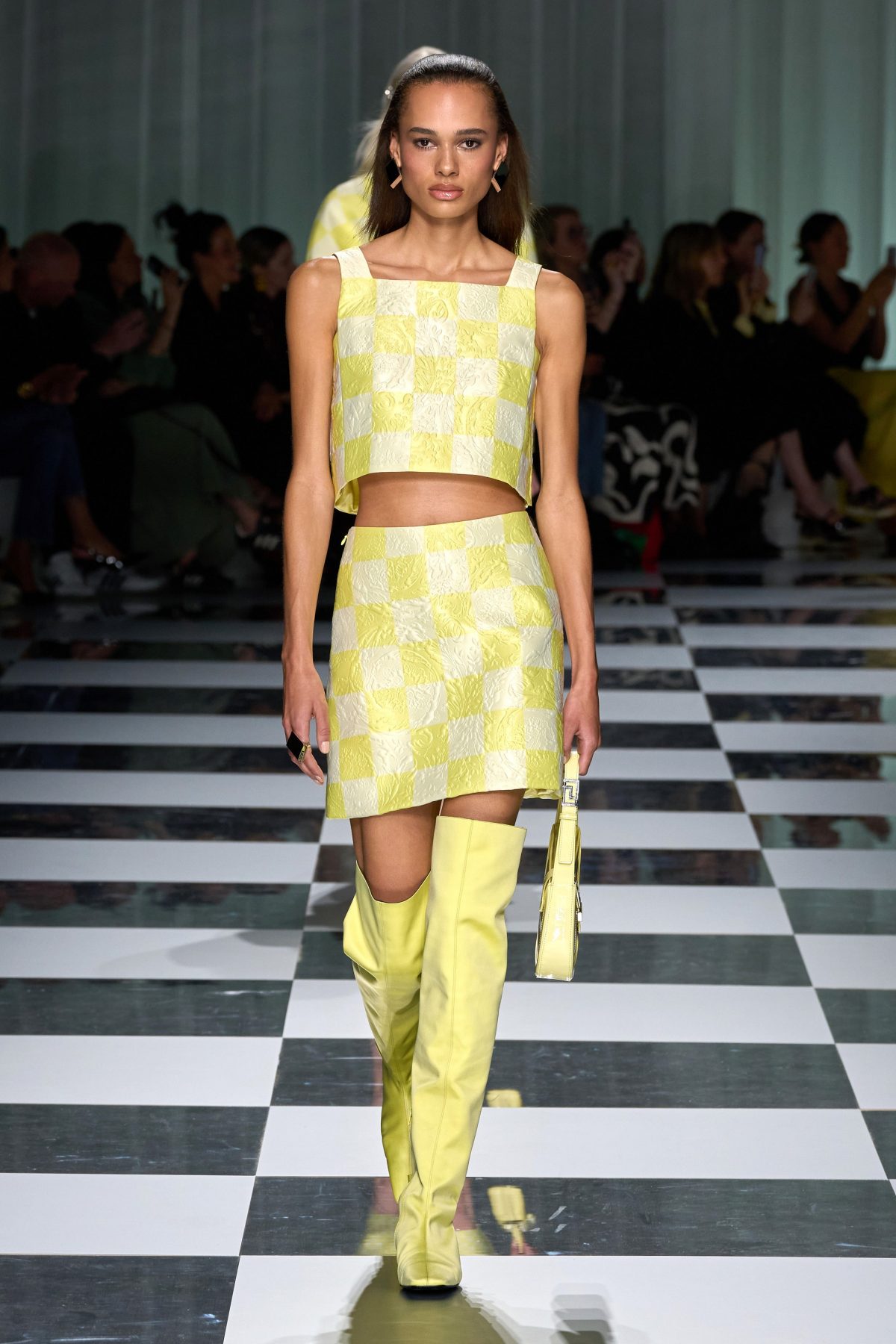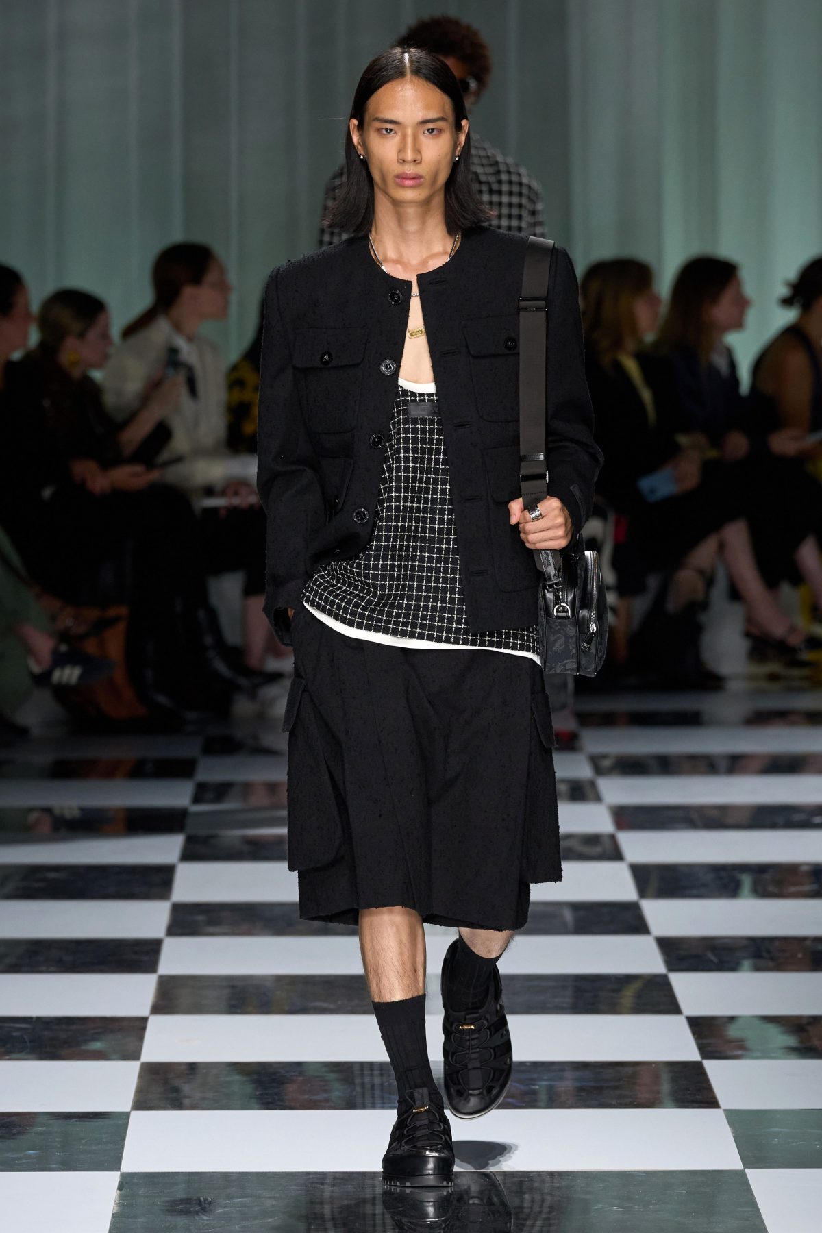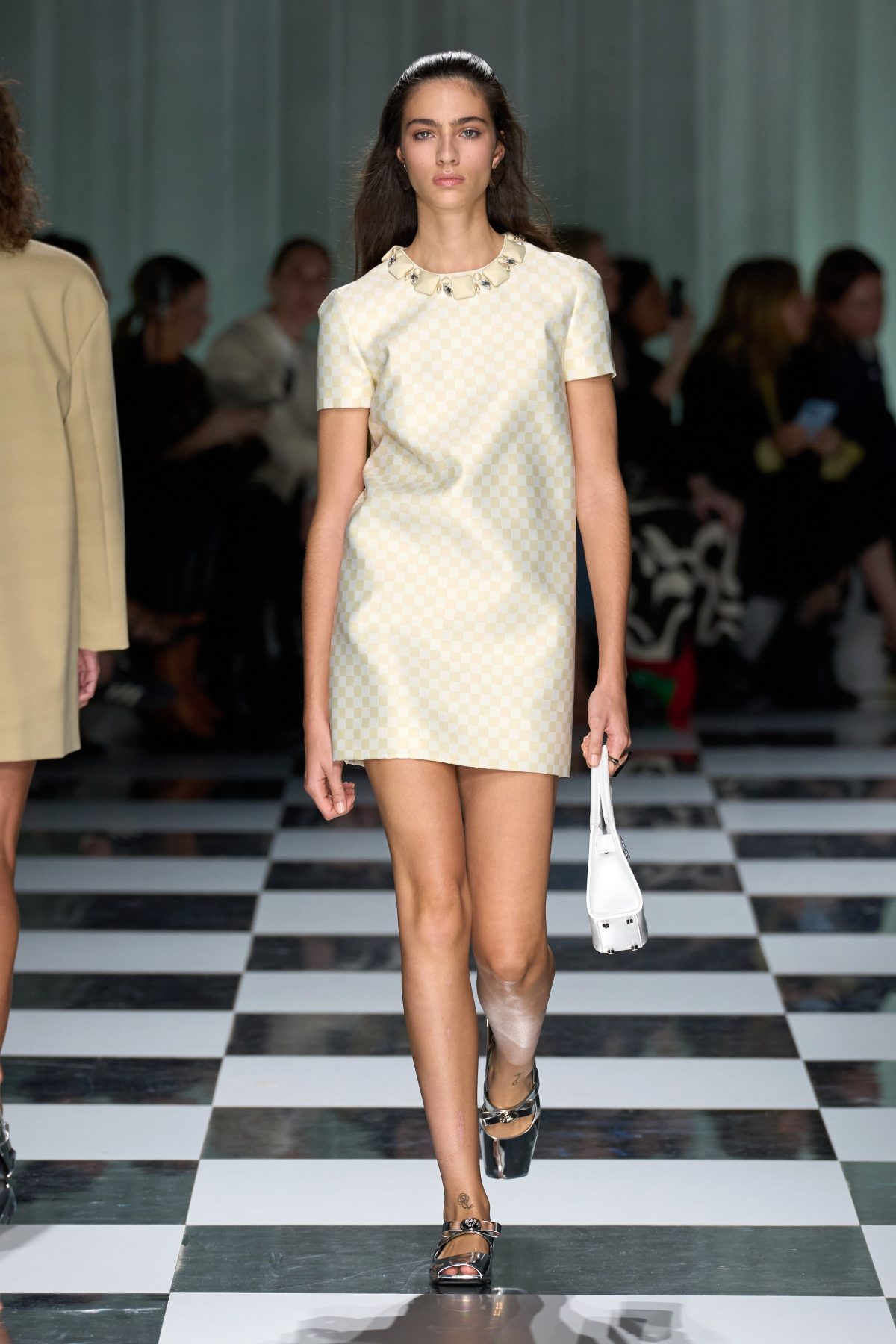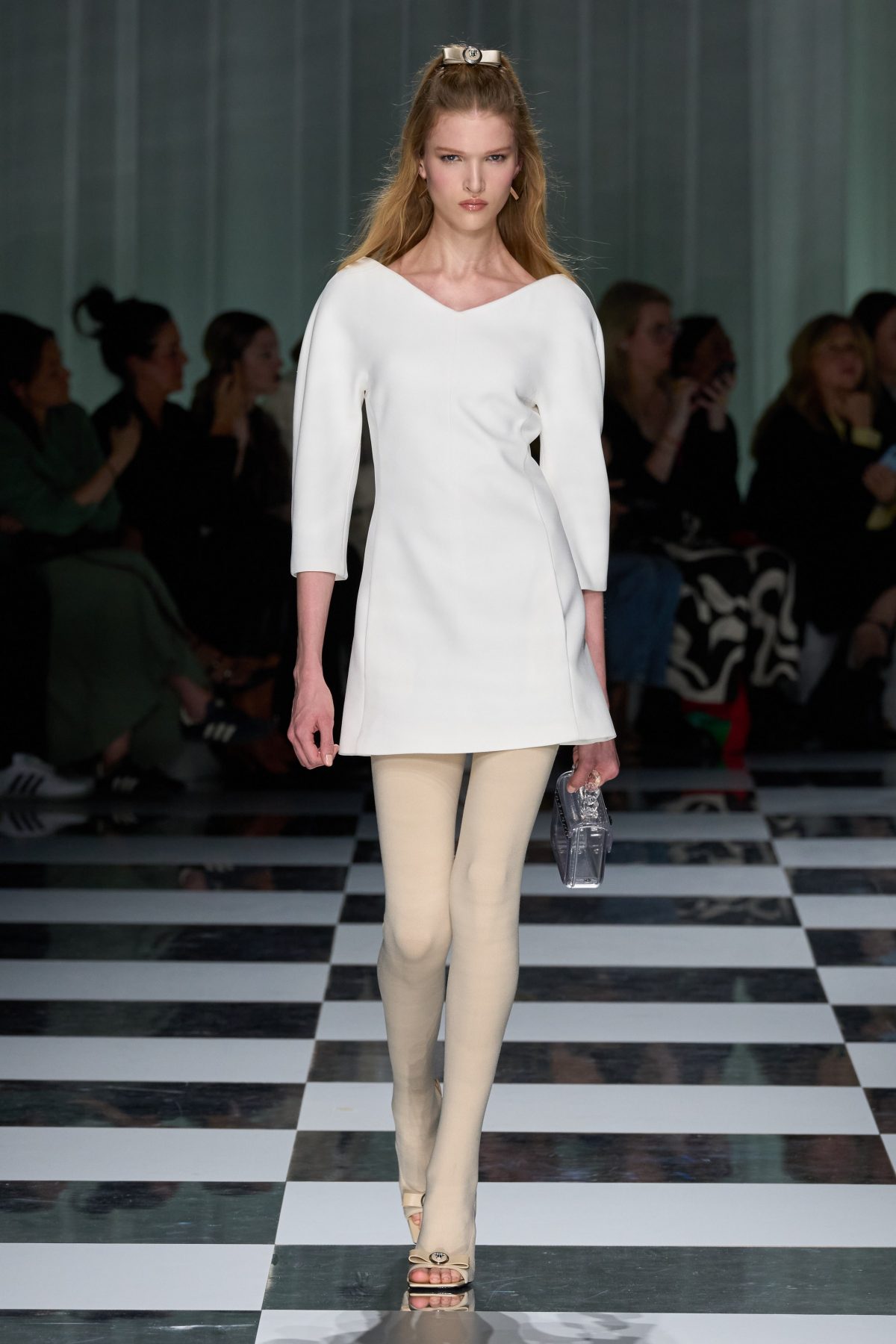 “It’s a powerful woman with a touch of sweetness,” Donatella Versace said in a preview, surrounded by sorbet-coloured cotton tweed suits and chainmail dresses adorned with her brother Gianni’s chequerboard motif from spring/summer 1982. “There’s a sweetness in the menswear, too. He shows his personality through softness,” she added. The collection presented a shared wardrobe that felt like a cementation of the times we’ve been living through lately. After a pastel-clad Barbiecore summer of bubblegum-chewing Gen Zs and the generations in their wake, Versace’s girlie skirt-suits and cartoon tailoring were a walking manifesto to the zeitgeist. Of course, her brother did all of this for spring/summer 1995, but what’s 30 years between fashion proposals and mainstream evolution?