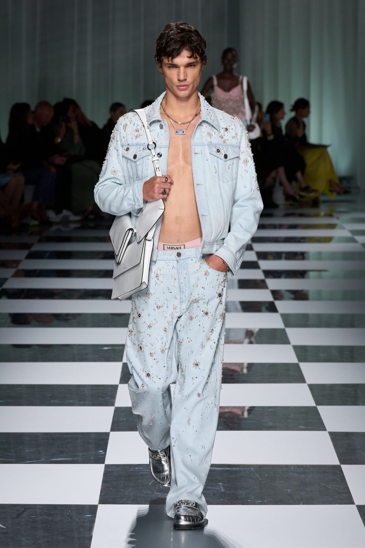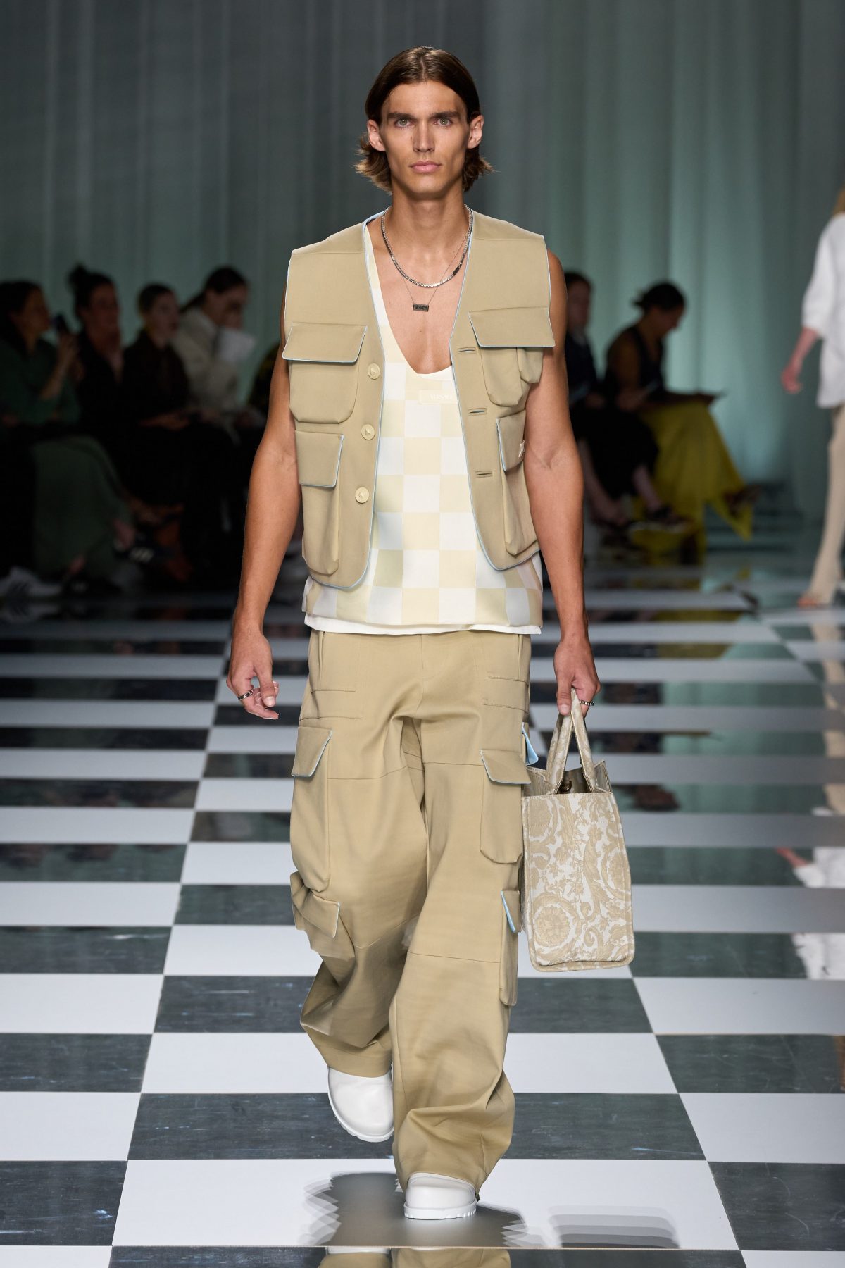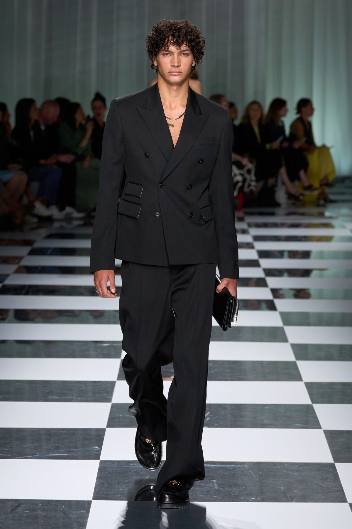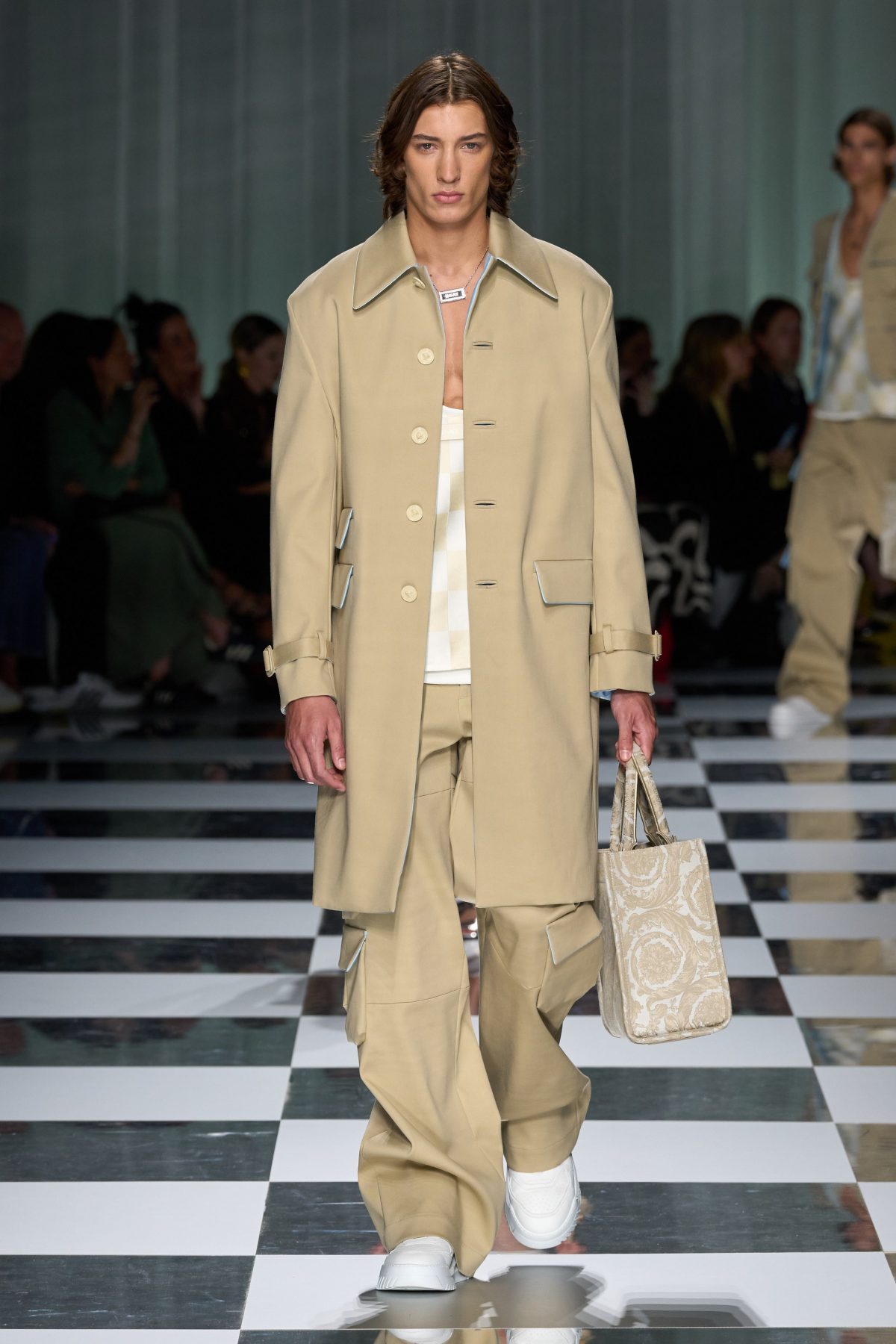 Versace took the opportunity to premiere two new bags: the Athena, a large tote bag in chequerboard or tonal Barocco jacquard adorned with a big old Versace logo, and the Medusa ’95 handbag, which riffed on the hardware launched by Gianna Versace as bag decorations that year. It was complemented by a men’s slingback shoe of the same name, as well as shoes with ribbon bows and some very ’90s cork-sole sandals.
