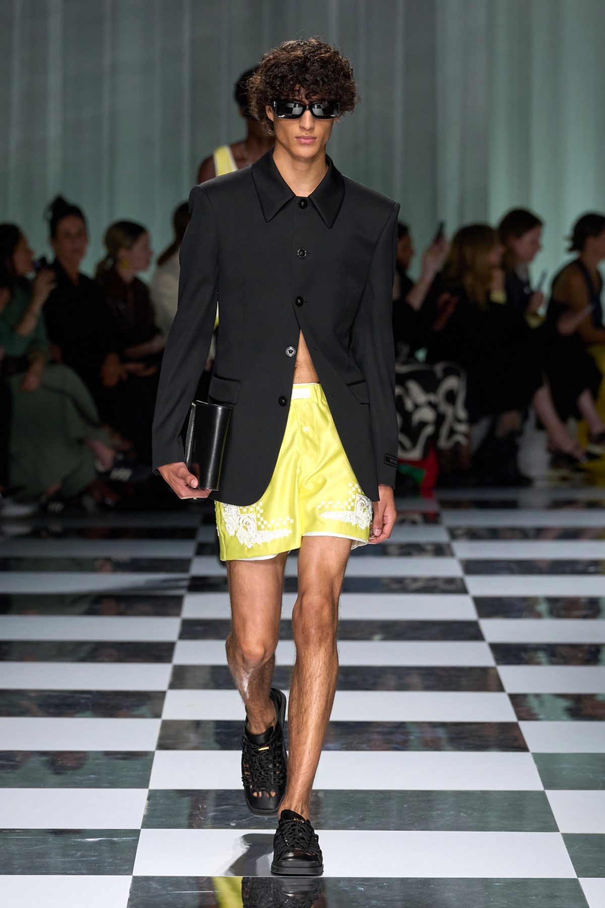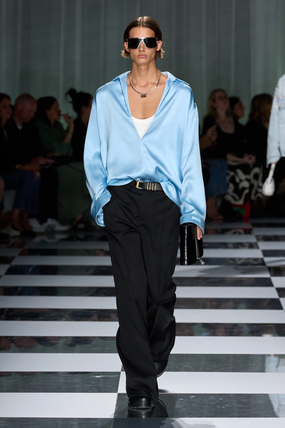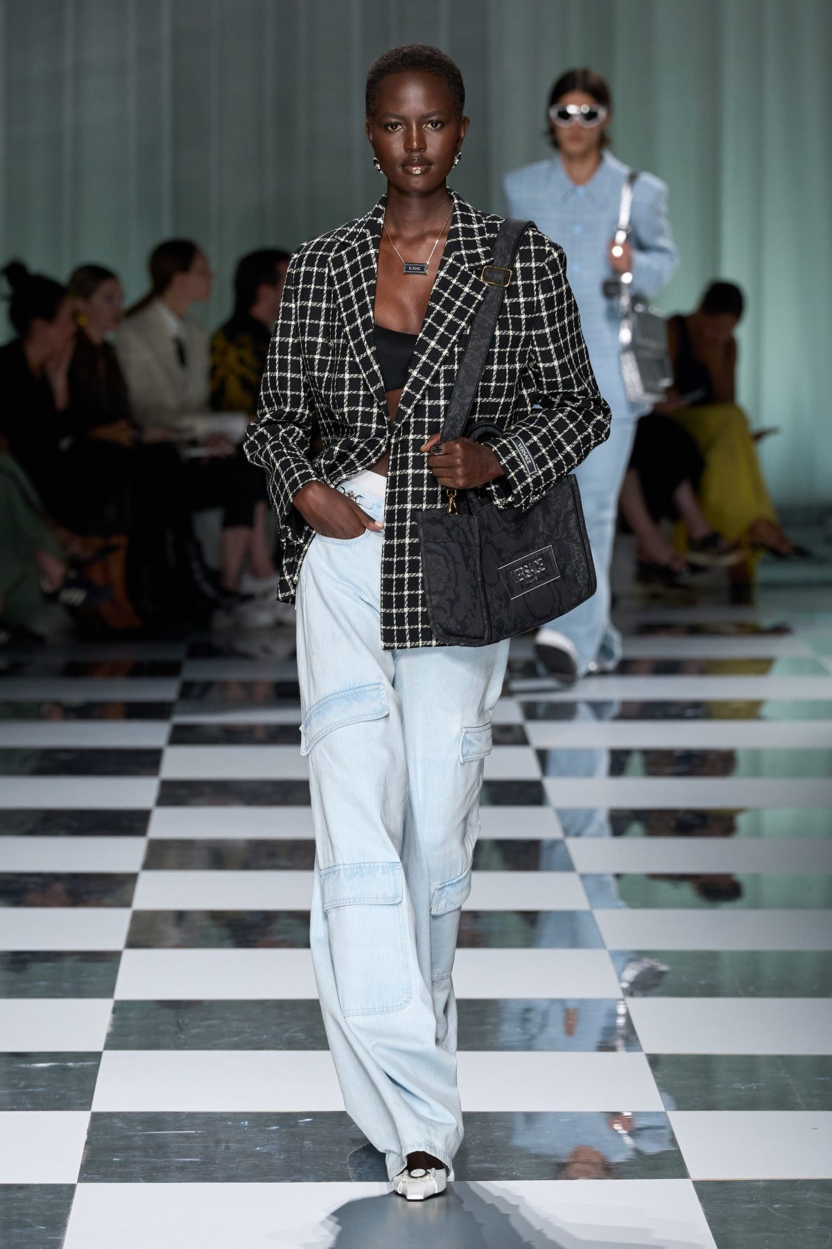 Versace took the opportunity to premiere two new bags: the Athena, a large tote bag in chequerboard or tonal Barocco jacquard adorned with a big old Versace logo, and the Medusa ’95 handbag, which riffed on the hardware launched by Gianna Versace as bag decorations that year. It was complemented by a men’s slingback shoe of the same name, as well as shoes with ribbon bows and some very ’90s cork-sole sandals.