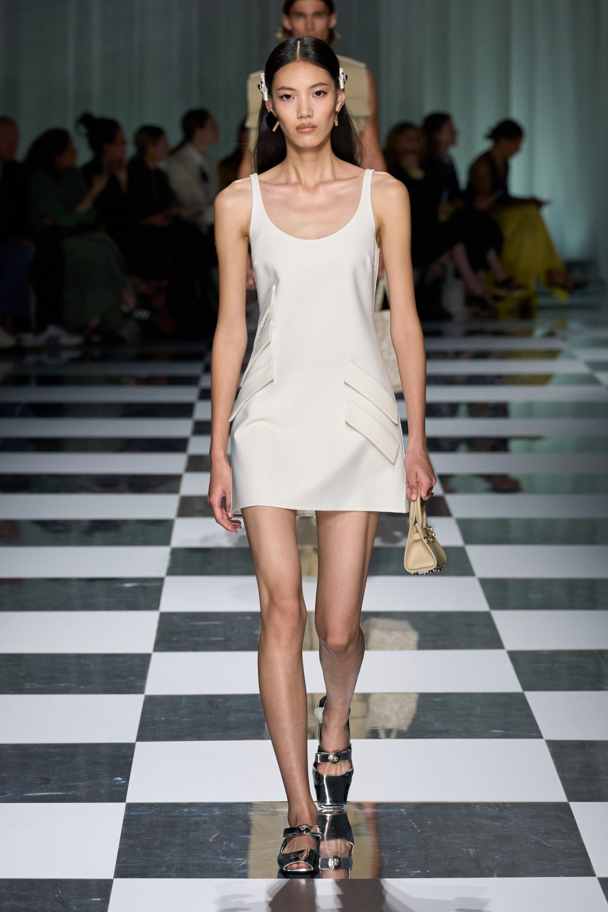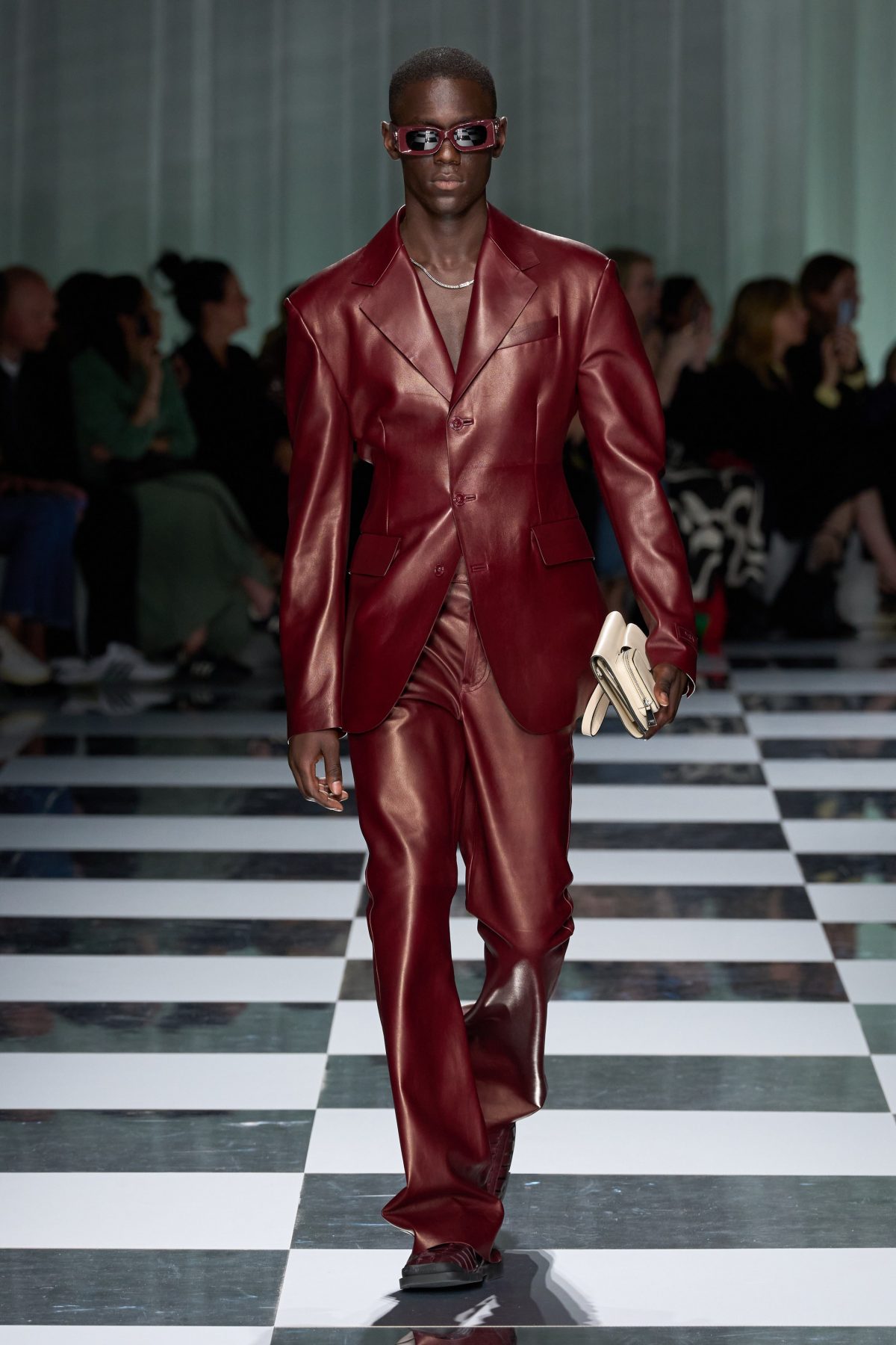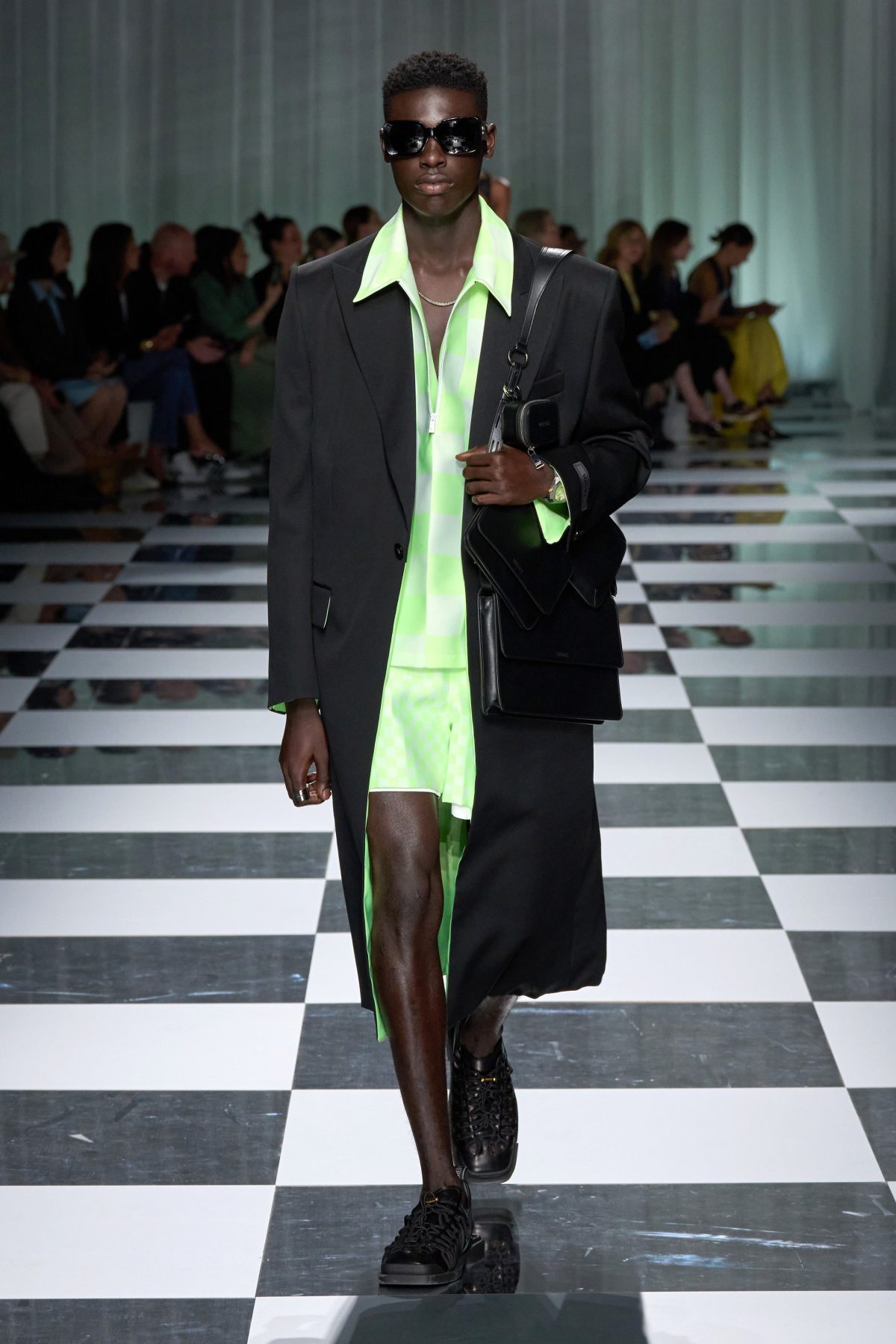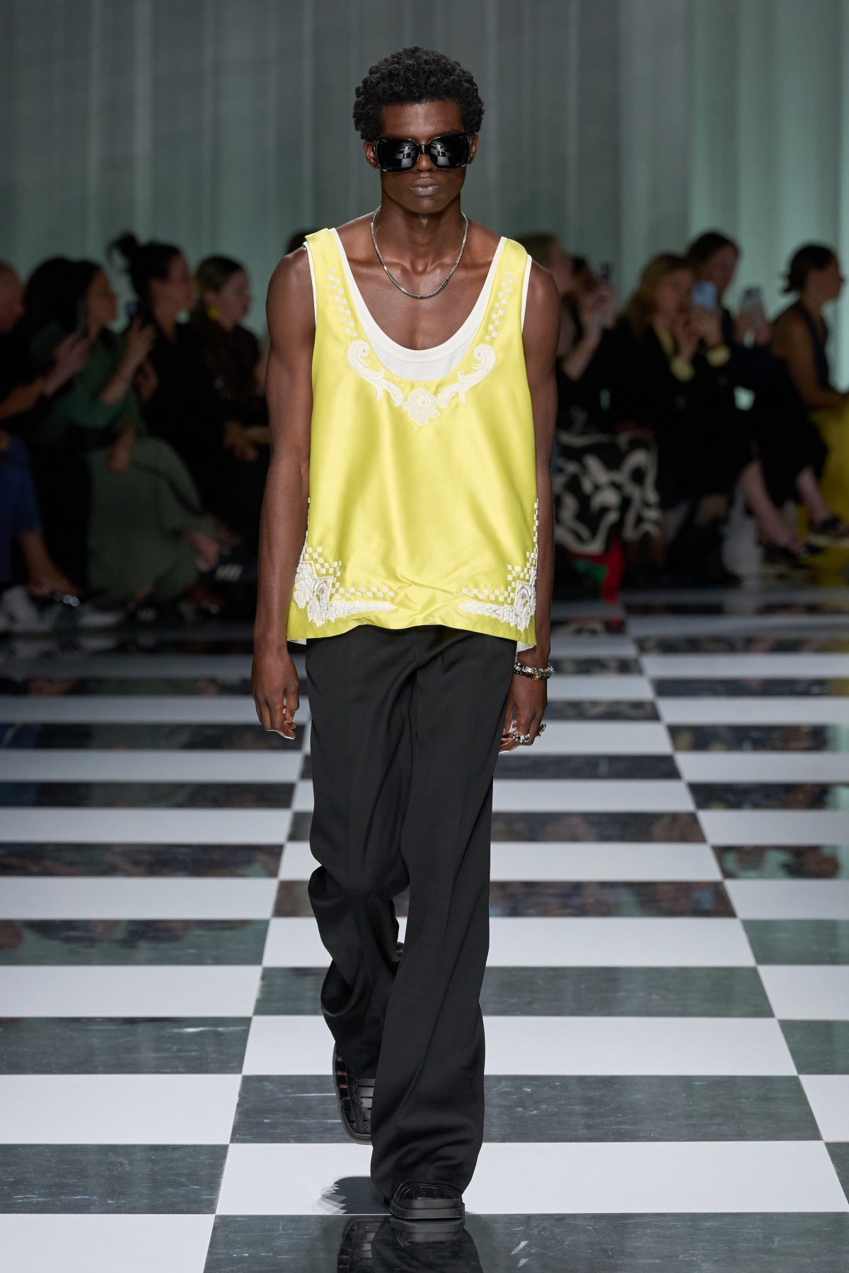 Versace took the opportunity to premiere two new bags: the Athena, a large tote bag in chequerboard or tonal Barocco jacquard adorned with a big old Versace logo, and the Medusa ’95 handbag, which riffed on the hardware launched by Gianna Versace as bag decorations that year. It was complemented by a men’s slingback shoe of the same name, as well as shoes with ribbon bows and some very ’90s cork-sole sandals.