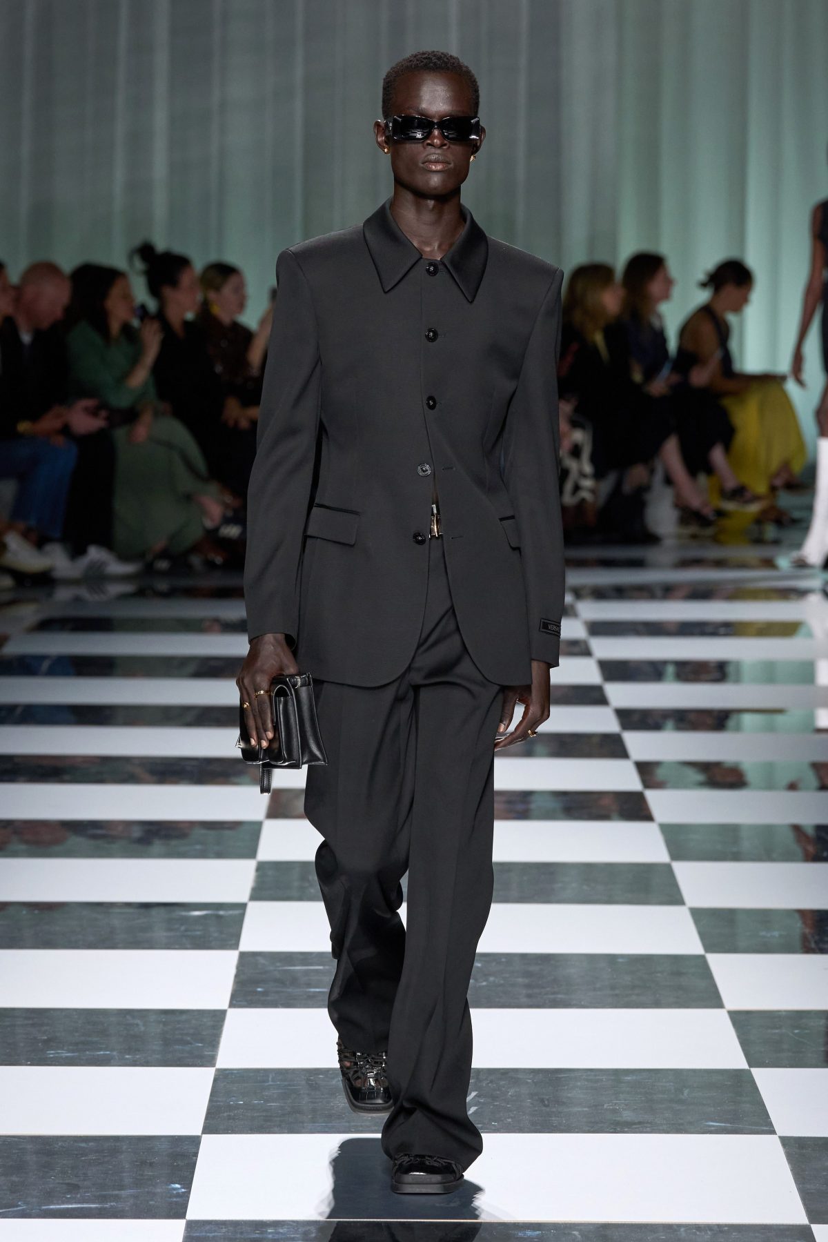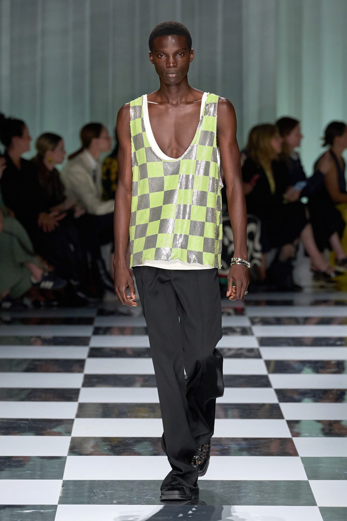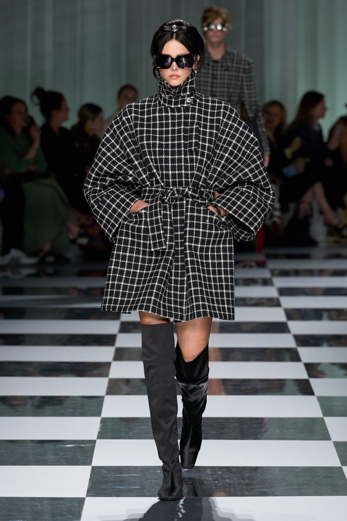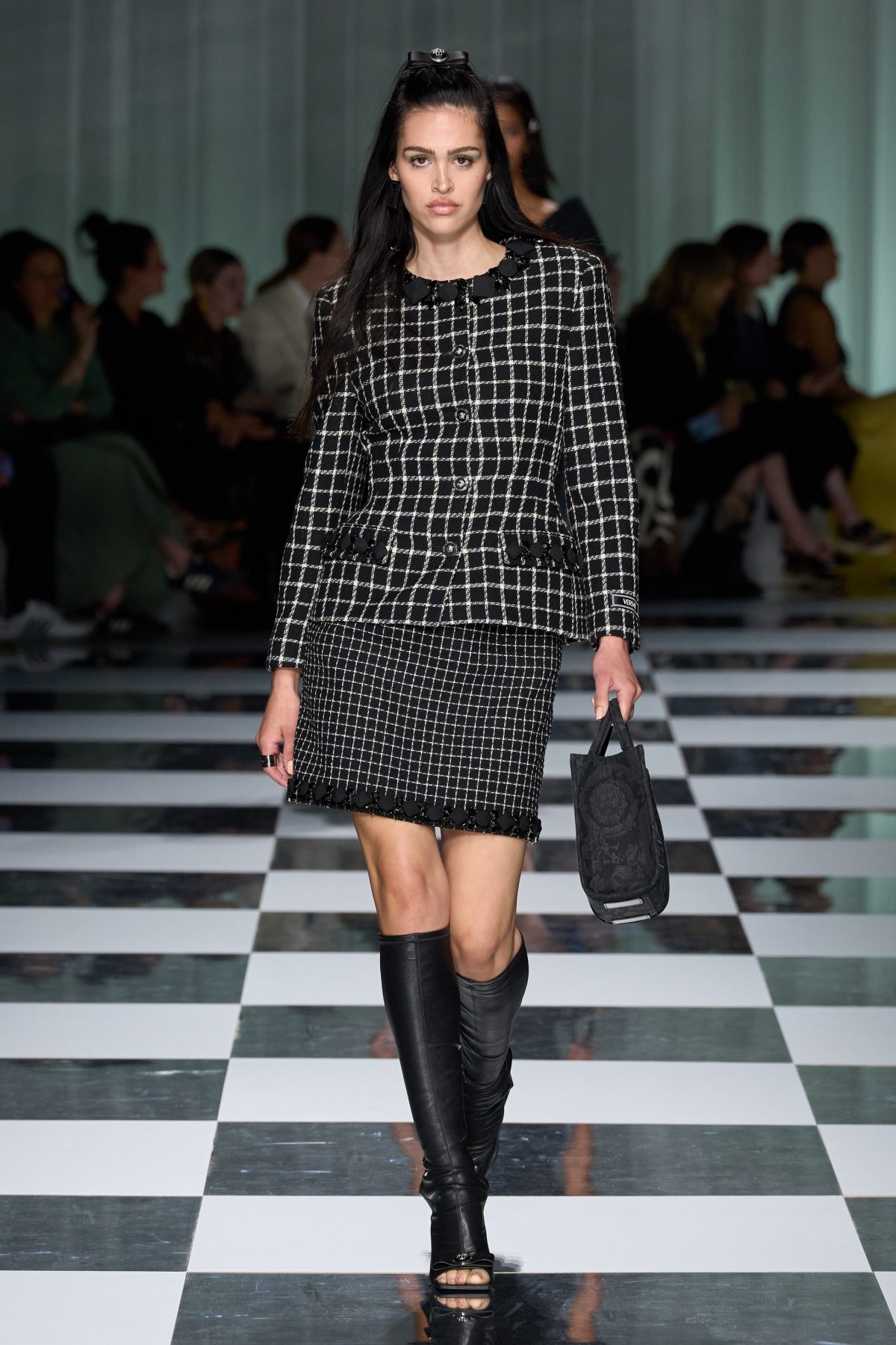 The chequerboard motif from ’82 was the emblem of the collection. Echoed in the floor of Versace’s swirly mega runway, it provided the heightened graphic value Donatella said she had been feeling for the season. Applied to kicky ’60s dresses and sculpted skirt-suits, and new takes on the bowling suit for men, its geometry paved the way for an exploration of checks in little ladylike suits and was echoed in the construction of chainmail creations that turned up the volume on Versace’s sass factor. “The collection is joyful and sharp,” she said. “The Versace woman is free and vibrant. The Versace man is confident and daring.” Sampling Madonna’s “Justify My Love” from 1990 – which is very much back in rotation after also being played during seating at Tom Ford the night before – the soundtrack underlined those sentiments.