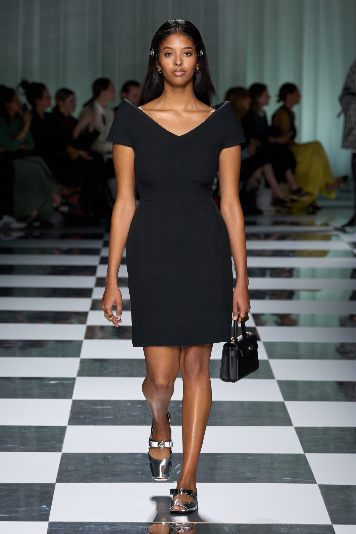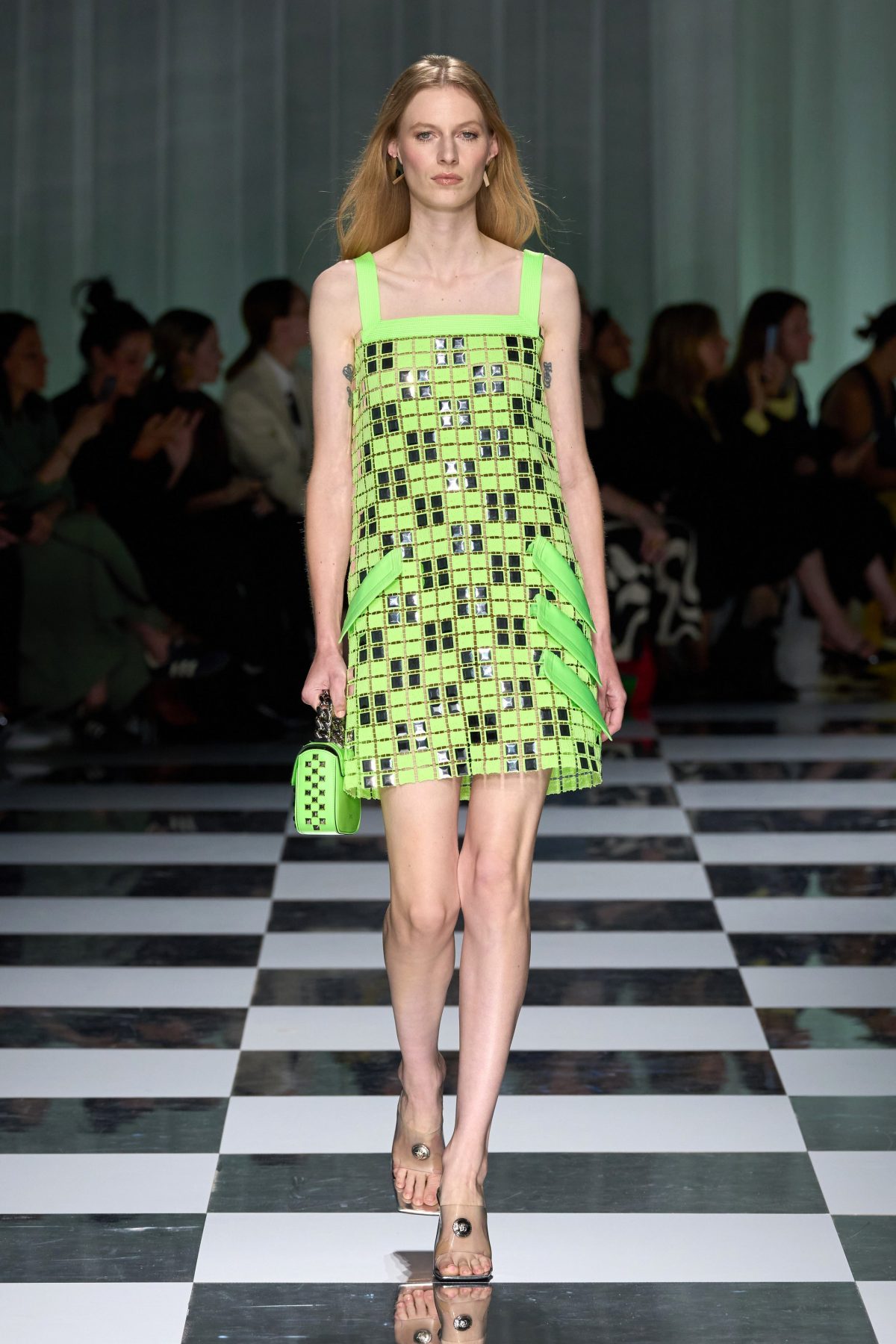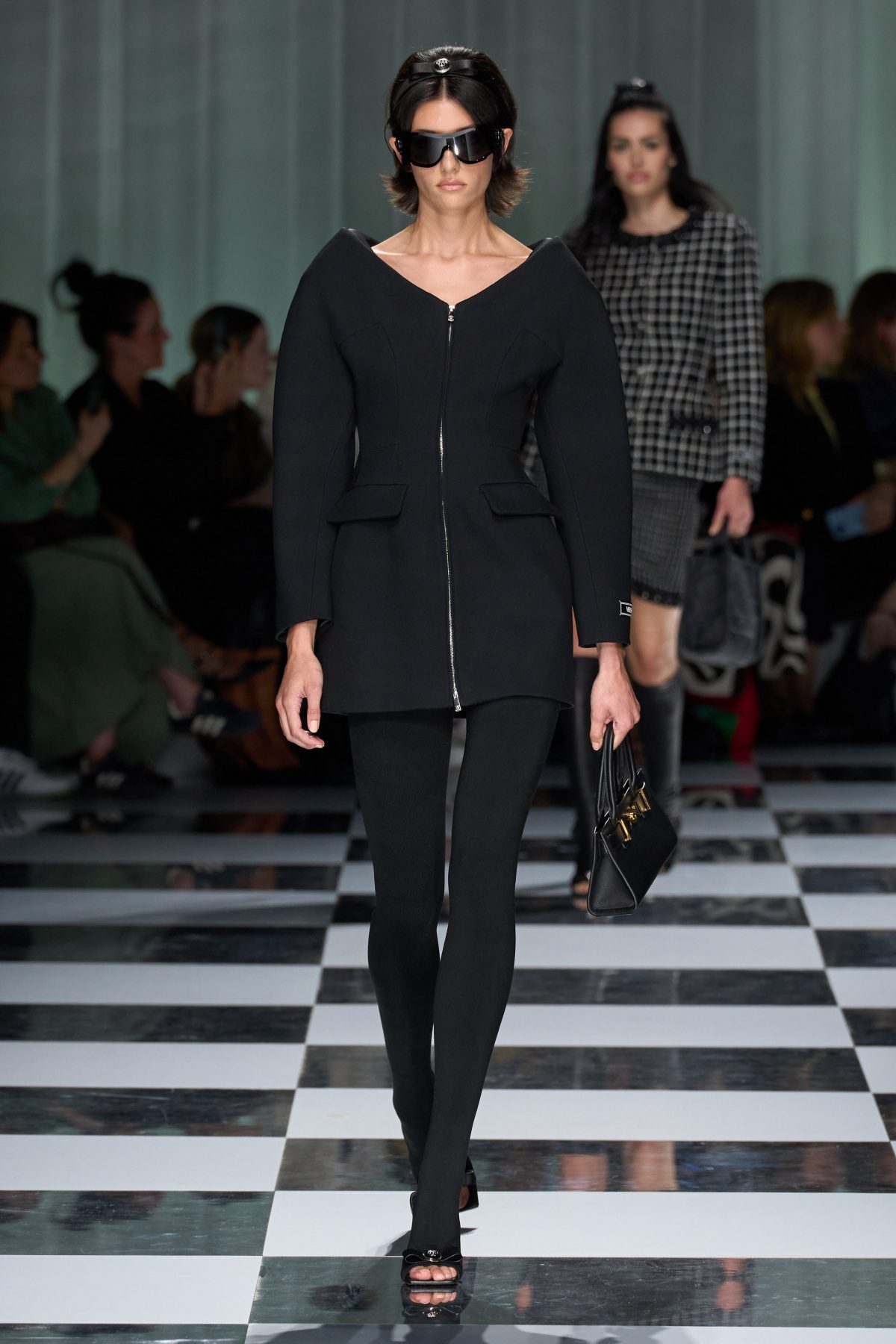 The chequerboard motif from ’82 was the emblem of the collection. Echoed in the floor of Versace’s swirly mega runway, it provided the heightened graphic value Donatella said she had been feeling for the season. Applied to kicky ’60s dresses and sculpted skirt-suits, and new takes on the bowling suit for men, its geometry paved the way for an exploration of checks in little ladylike suits and was echoed in the construction of chainmail creations that turned up the volume on Versace’s sass factor. “The collection is joyful and sharp,” she said. “The Versace woman is free and vibrant. The Versace man is confident and daring.” Sampling Madonna’s “Justify My Love” from 1990 – which is very much back in rotation after also being played during seating at Tom Ford the night before – the soundtrack underlined those sentiments.