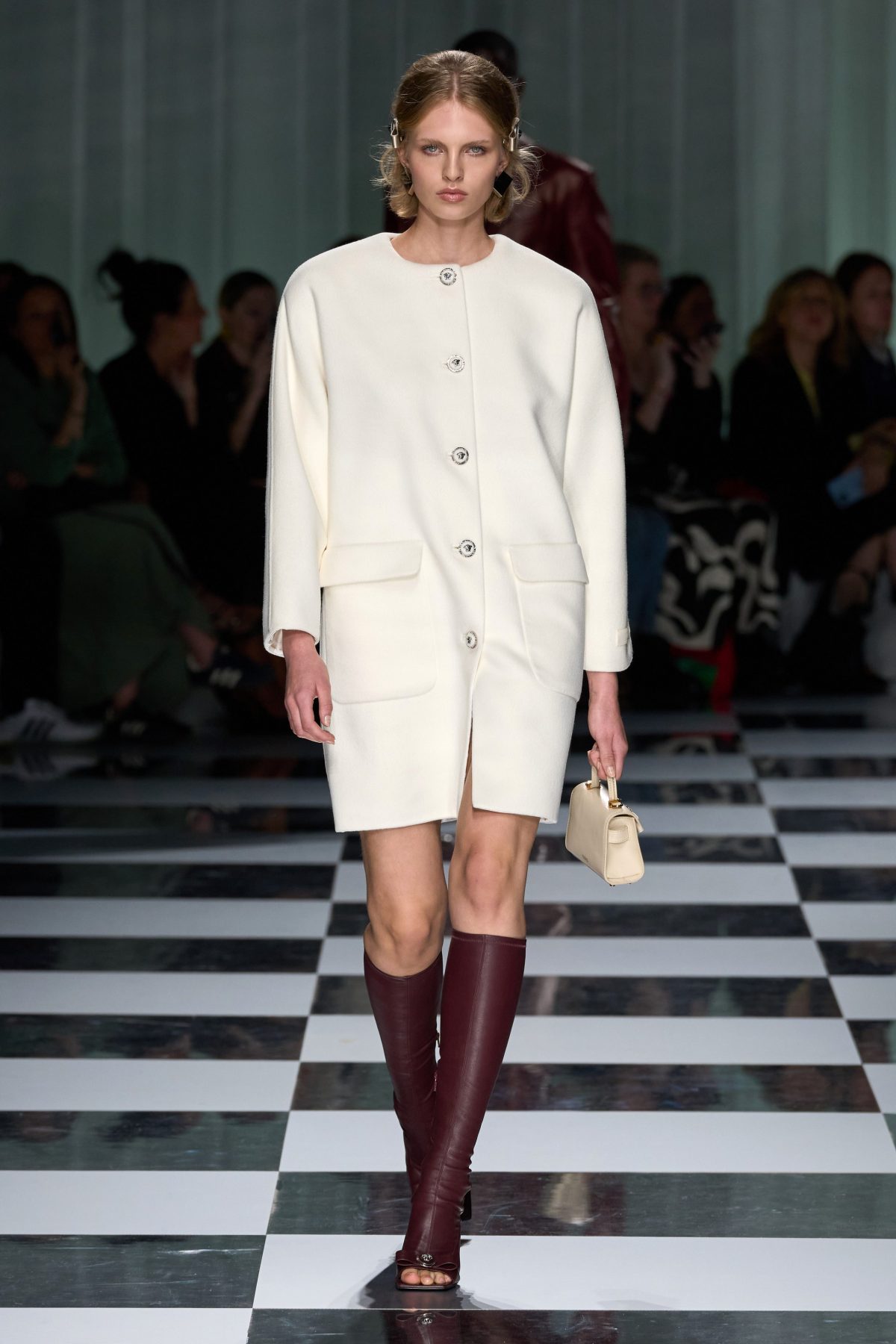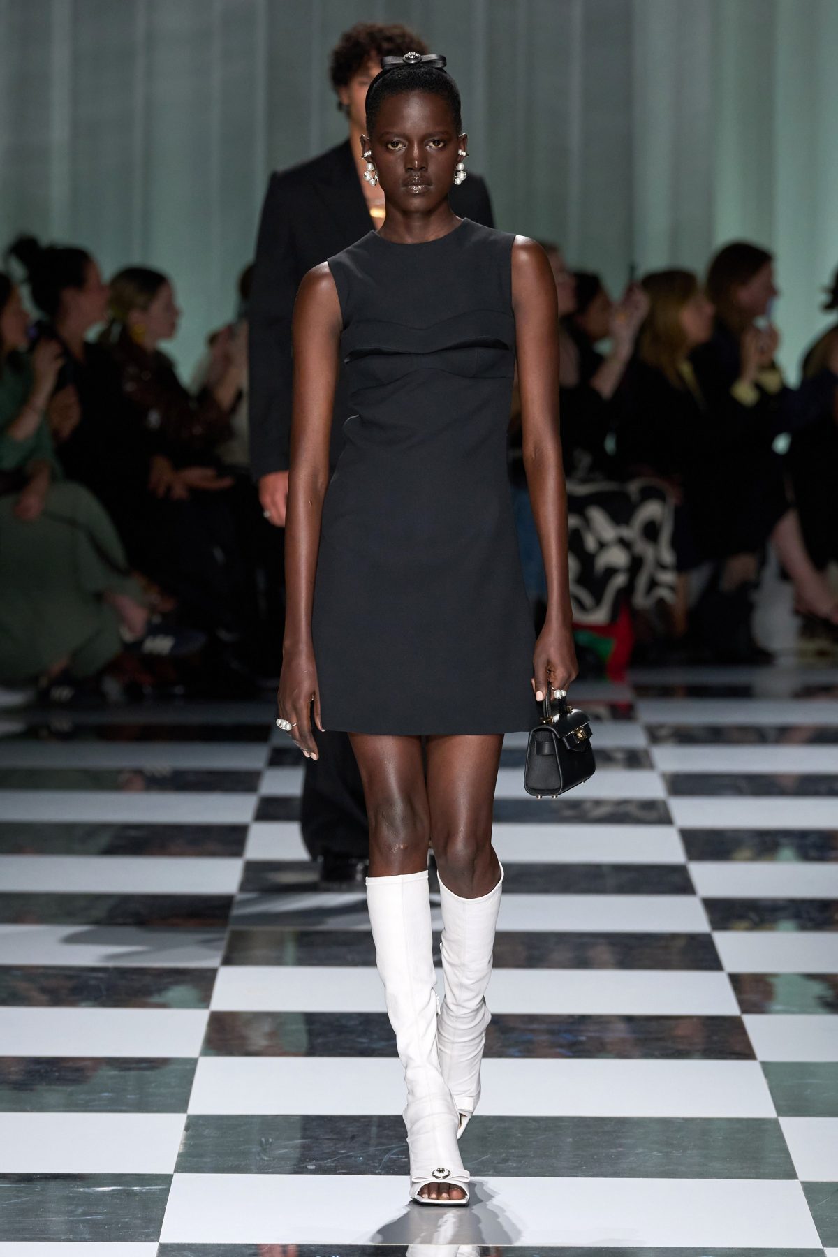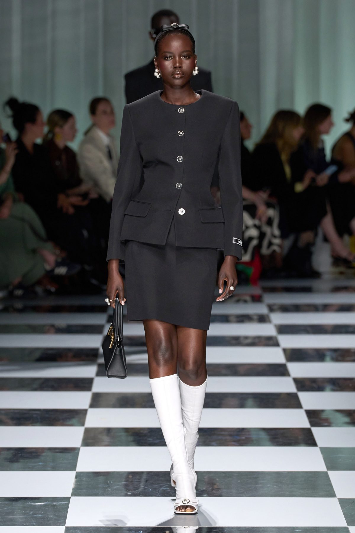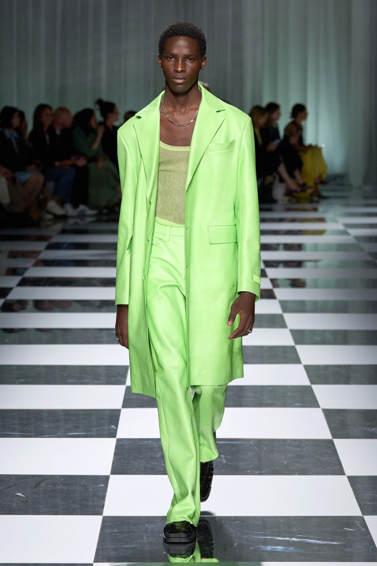 The chequerboard motif from ’82 was the emblem of the collection. Echoed in the floor of Versace’s swirly mega runway, it provided the heightened graphic value Donatella said she had been feeling for the season. Applied to kicky ’60s dresses and sculpted skirt-suits, and new takes on the bowling suit for men, its geometry paved the way for an exploration of checks in little ladylike suits and was echoed in the construction of chainmail creations that turned up the volume on Versace’s sass factor. “The collection is joyful and sharp,” she said. “The Versace woman is free and vibrant. The Versace man is confident and daring.” Sampling Madonna’s “Justify My Love” from 1990 – which is very much back in rotation after also being played during seating at Tom Ford the night before – the soundtrack underlined those sentiments.