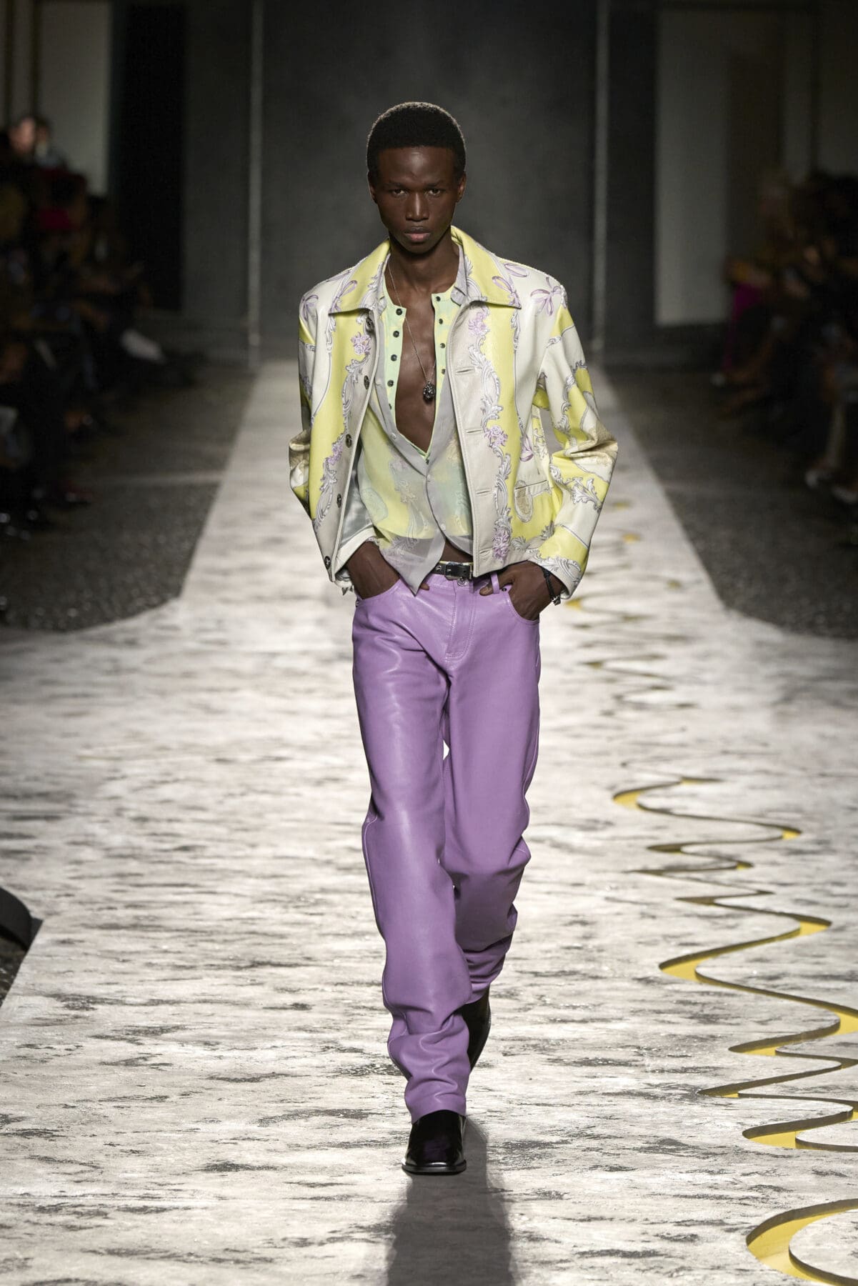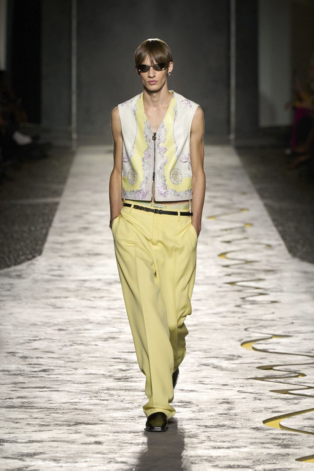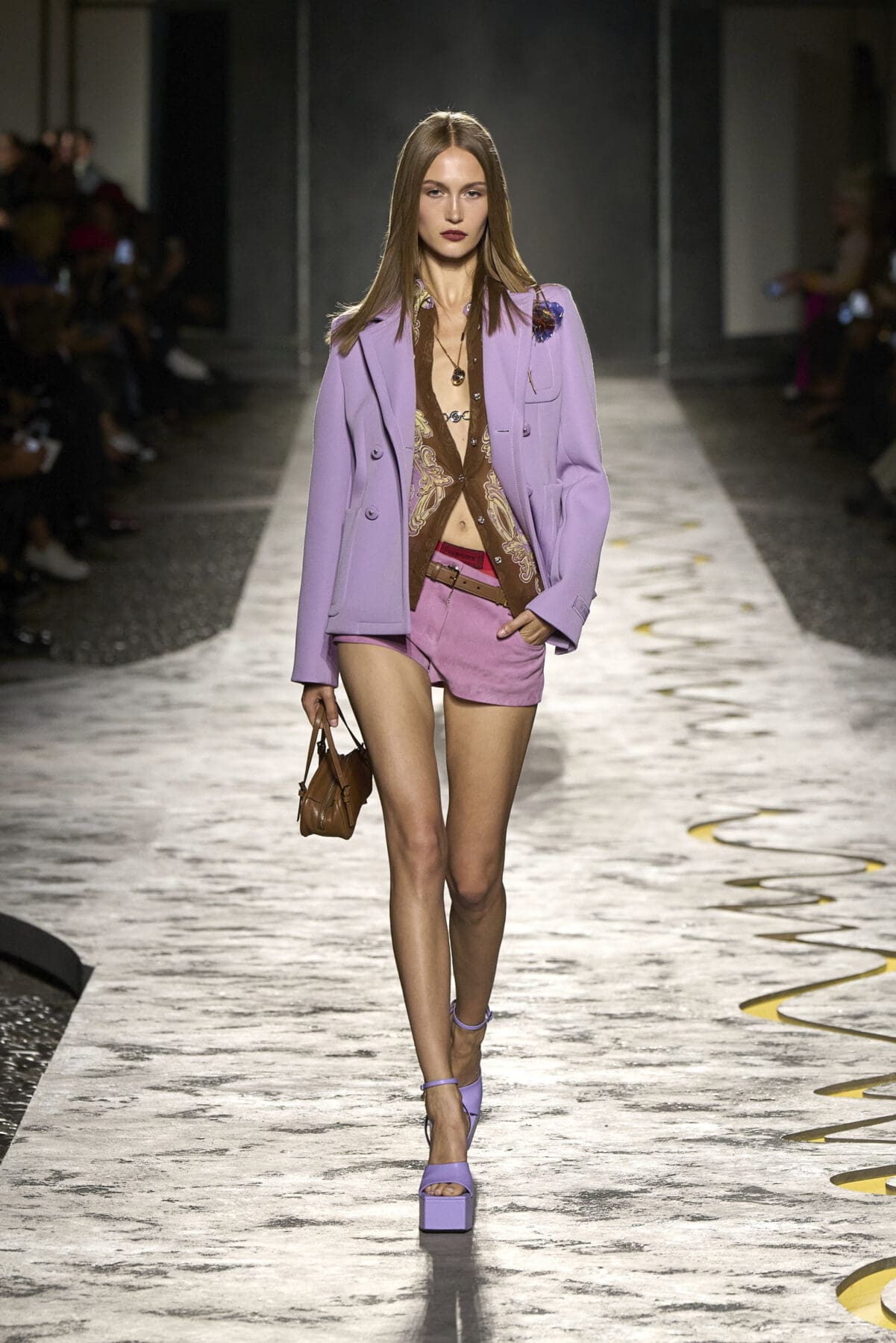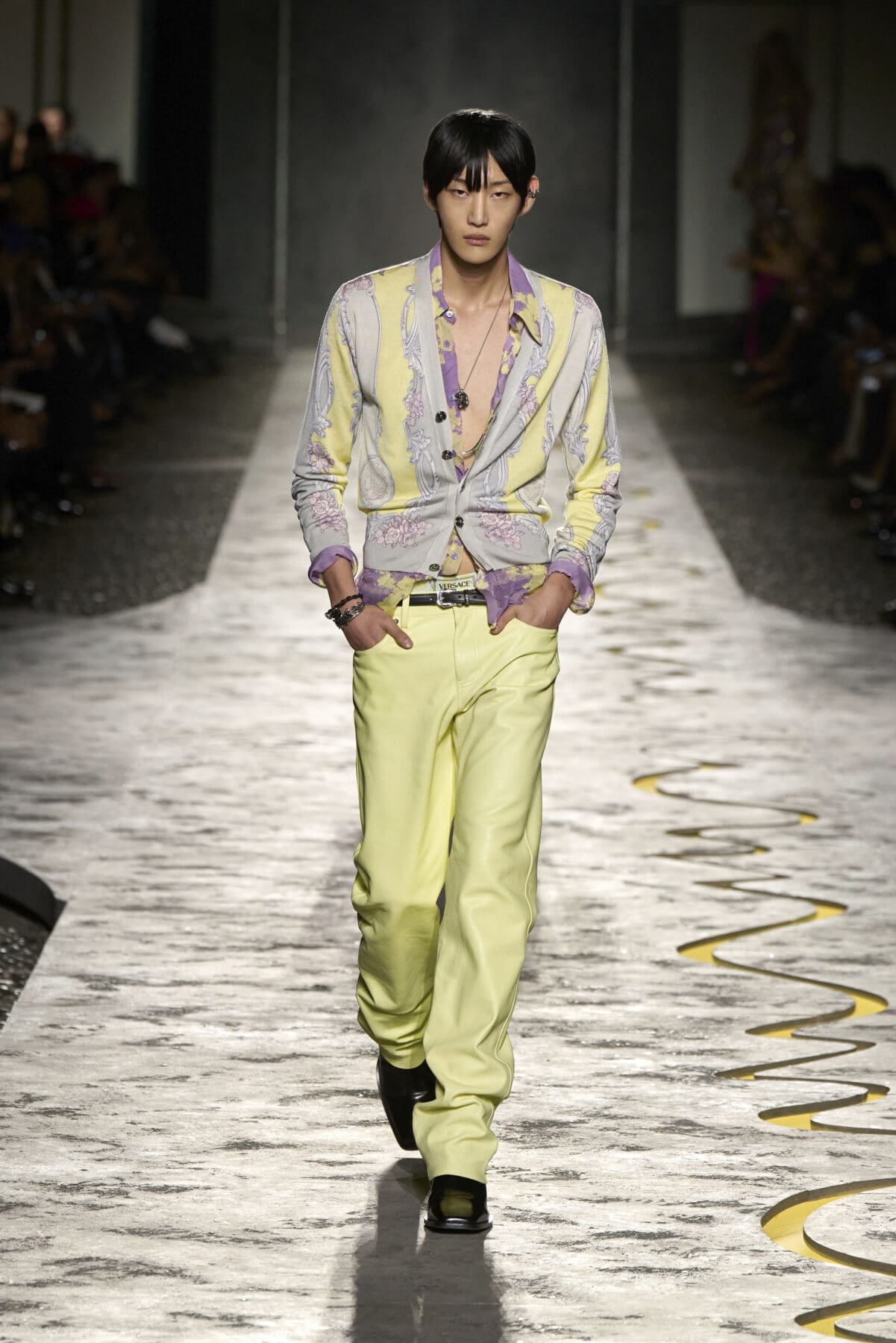 This collection did feel quite youthful by Versace standards, more sweet than sexy with its baby pastels, slip dress and cardigan combos, denim and short-shorts, not to mention the perfume bottle and champagne stem heels. On the other hand, there was a deft and subtle use of color that that old Versus show could never match, nicely exemplified by a man’s caramel-colored camp shirt and lavender trousers, and a woman’s copper tank and lilac skirt. A men’s leather jacket in soft yellow and white worn with violet colored leather pants was another highlight.