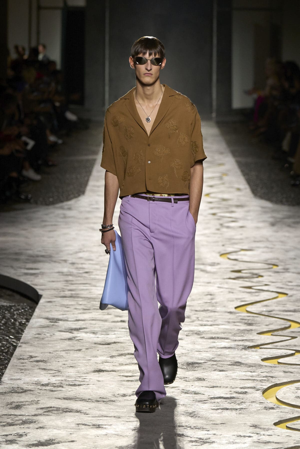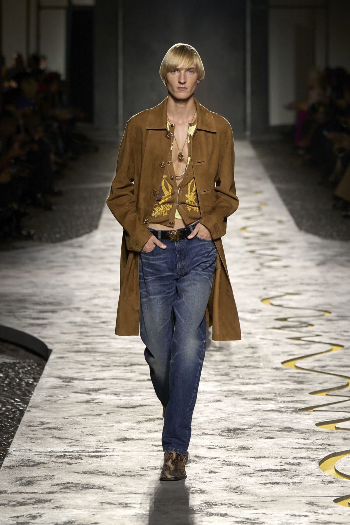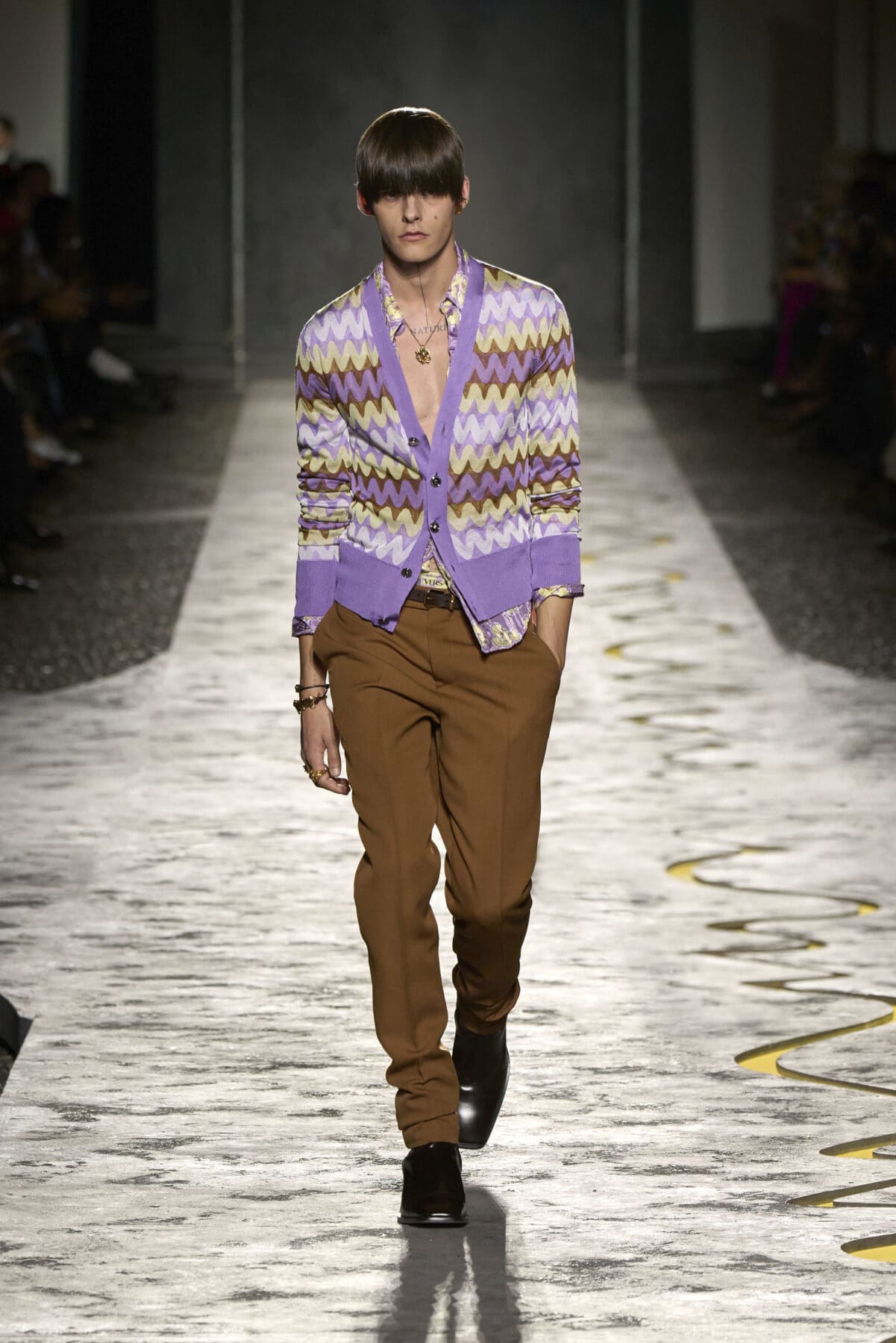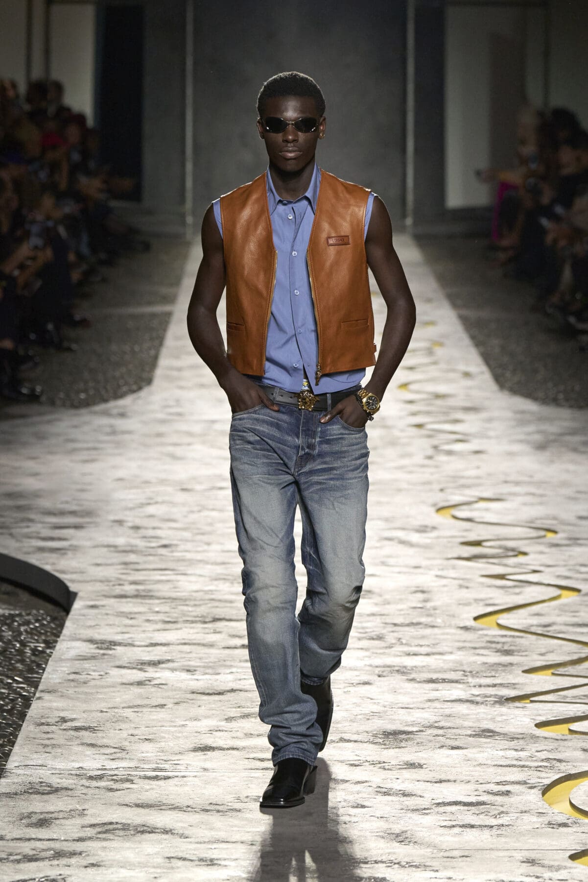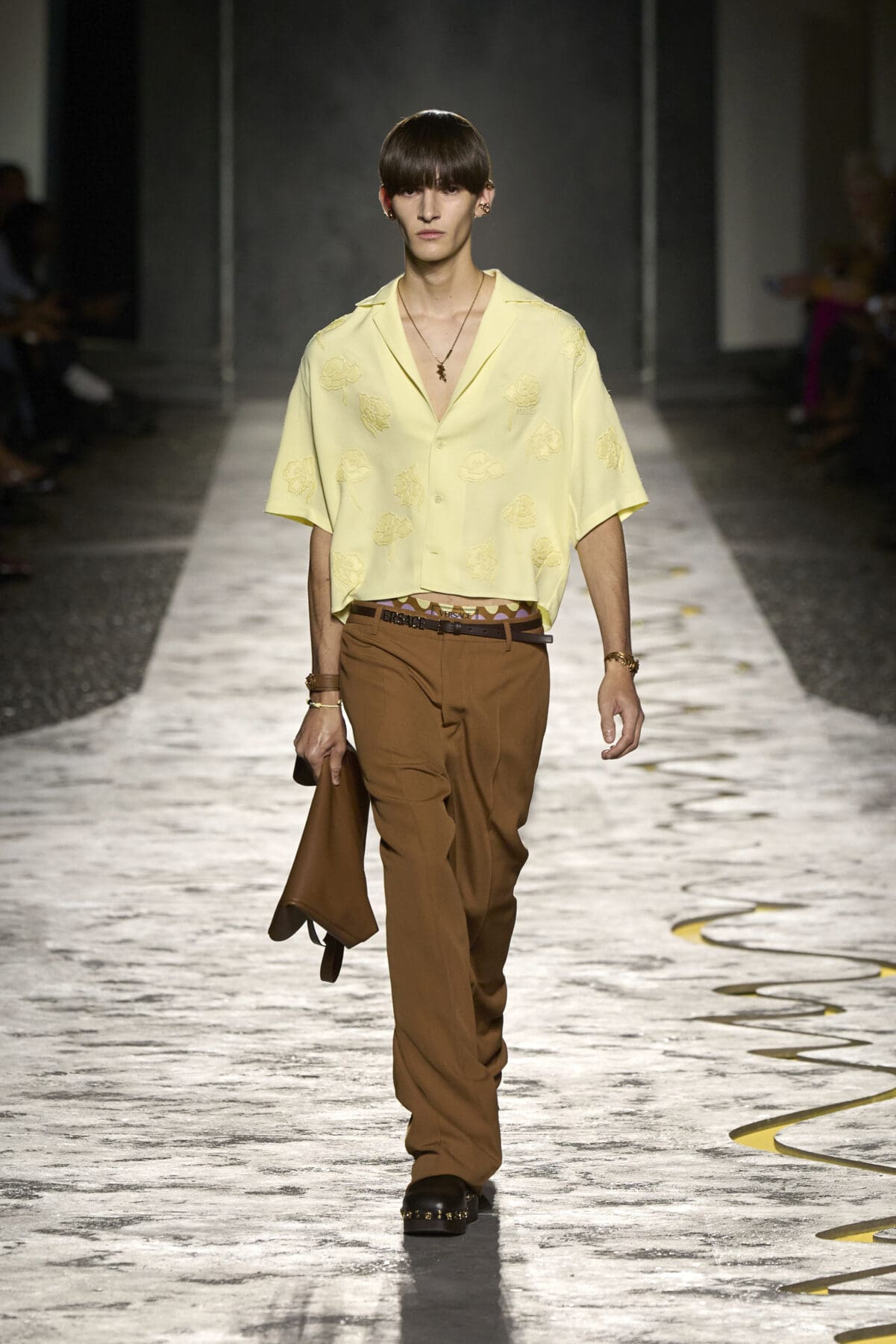This collection did feel quite youthful by Versace standards, more sweet than sexy with its baby pastels, slip dress and cardigan combos, denim and short-shorts, not to mention the perfume bottle and champagne stem heels. On the other hand, there was a deft and subtle use of color that that old Versus show could never match, nicely exemplified by a man’s caramel-colored camp shirt and lavender trousers, and a woman’s copper tank and lilac skirt. A men’s leather jacket in soft yellow and white worn with violet colored leather pants was another highlight.