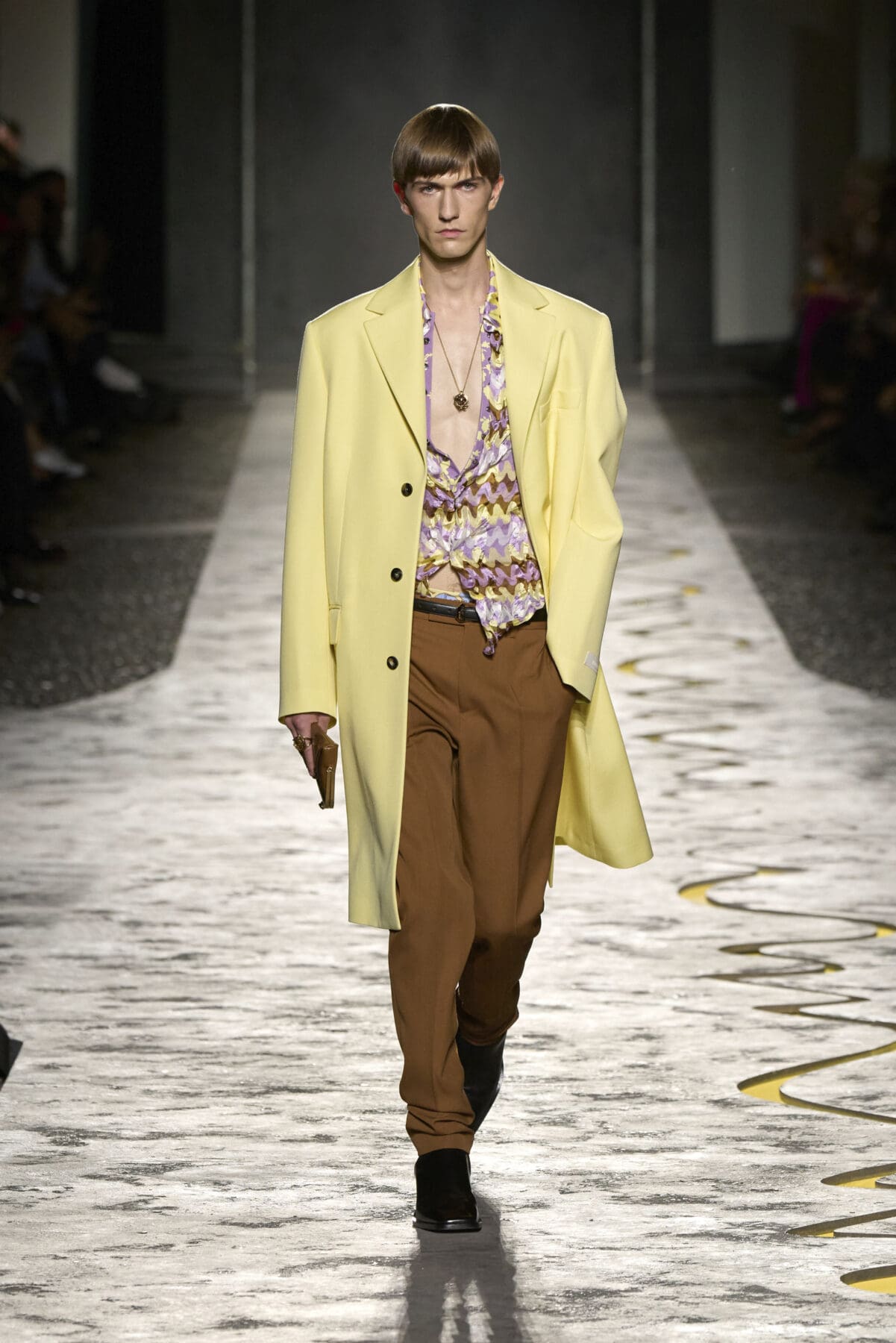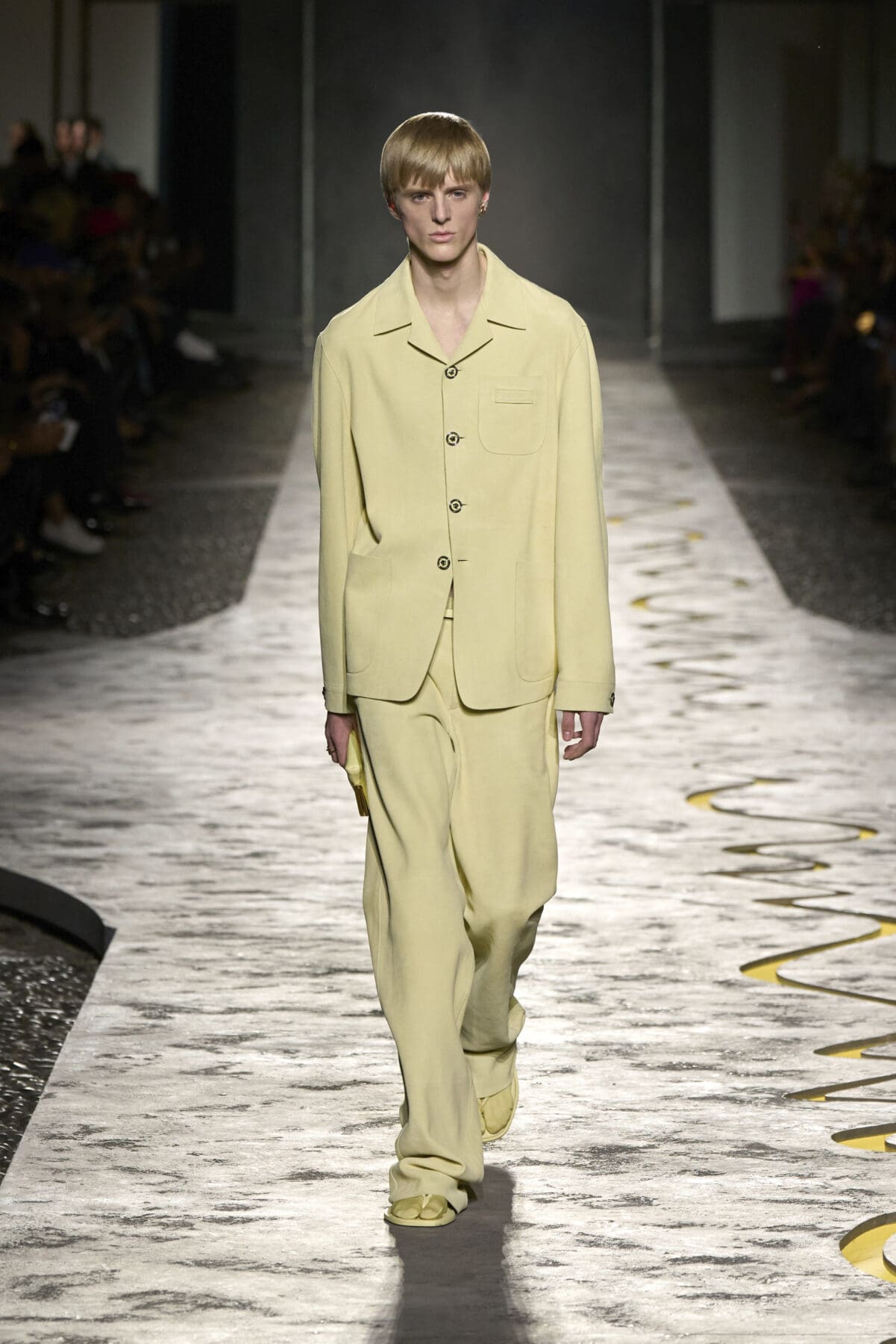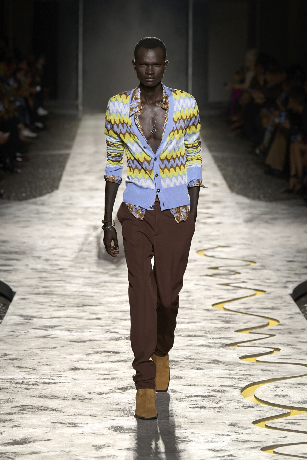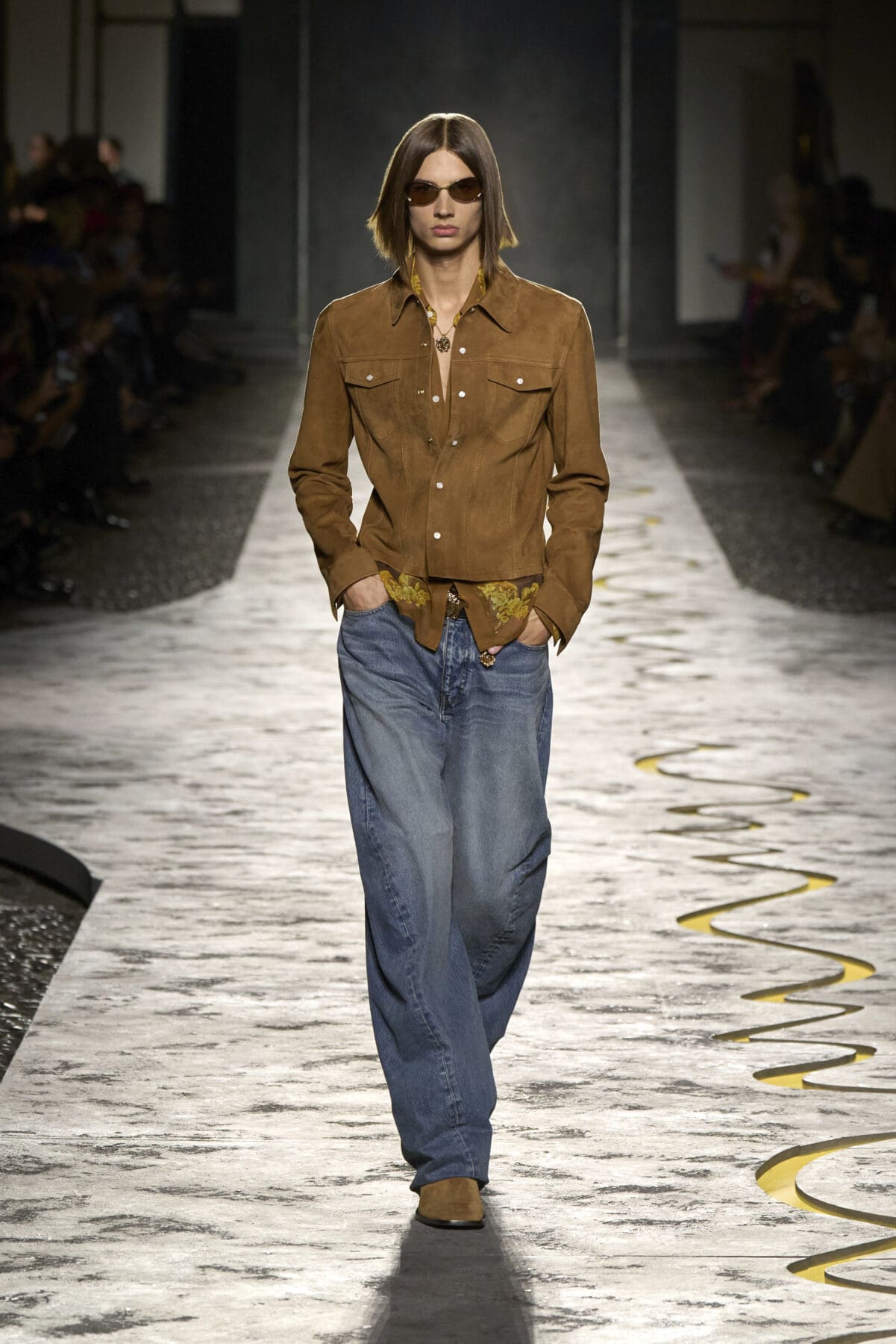 This collection did feel quite youthful by Versace standards, more sweet than sexy with its baby pastels, slip dress and cardigan combos, denim and short-shorts, not to mention the perfume bottle and champagne stem heels. On the other hand, there was a deft and subtle use of color that that old Versus show could never match, nicely exemplified by a man’s caramel-colored camp shirt and lavender trousers, and a woman’s copper tank and lilac skirt. A men’s leather jacket in soft yellow and white worn with violet colored leather pants was another highlight.
