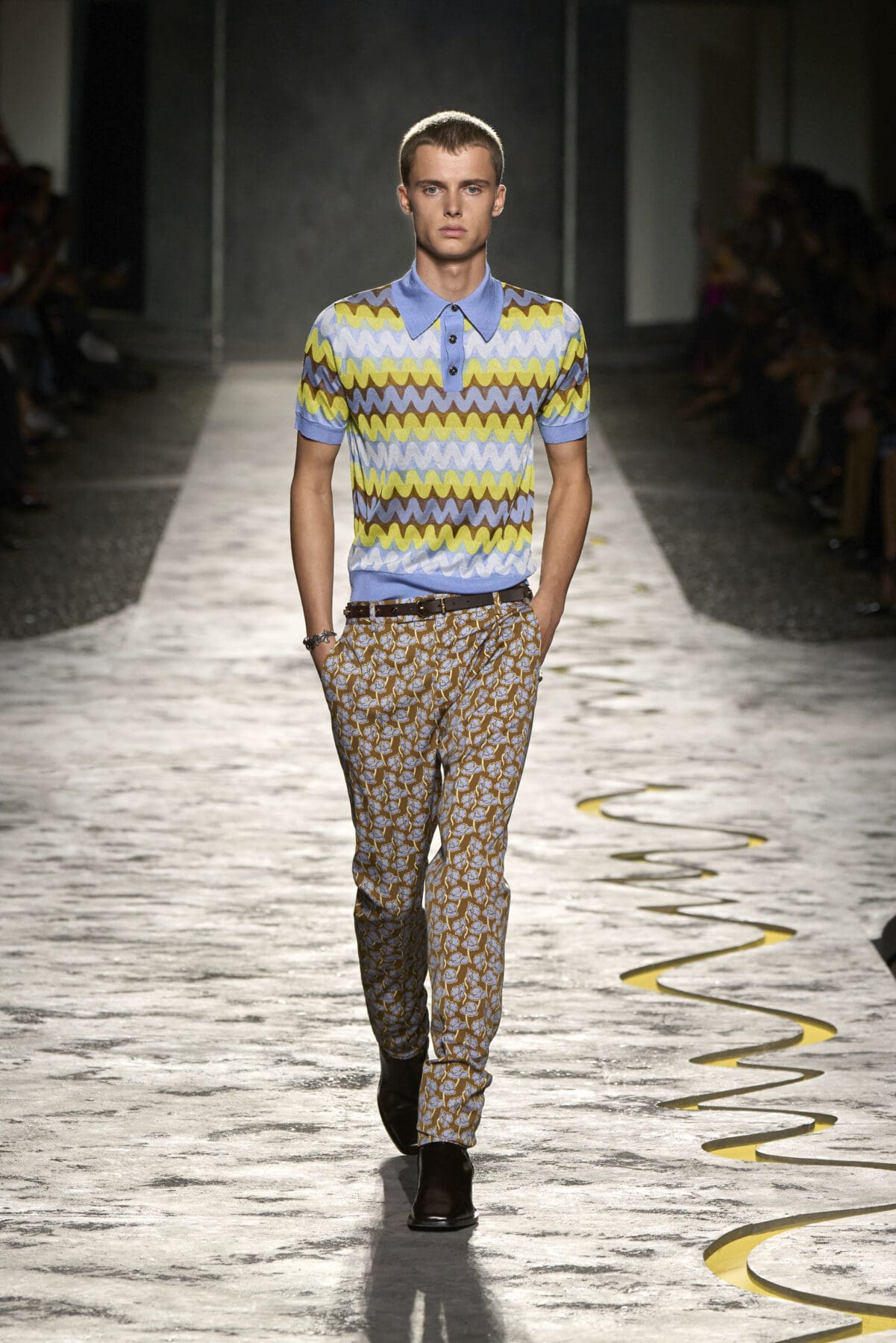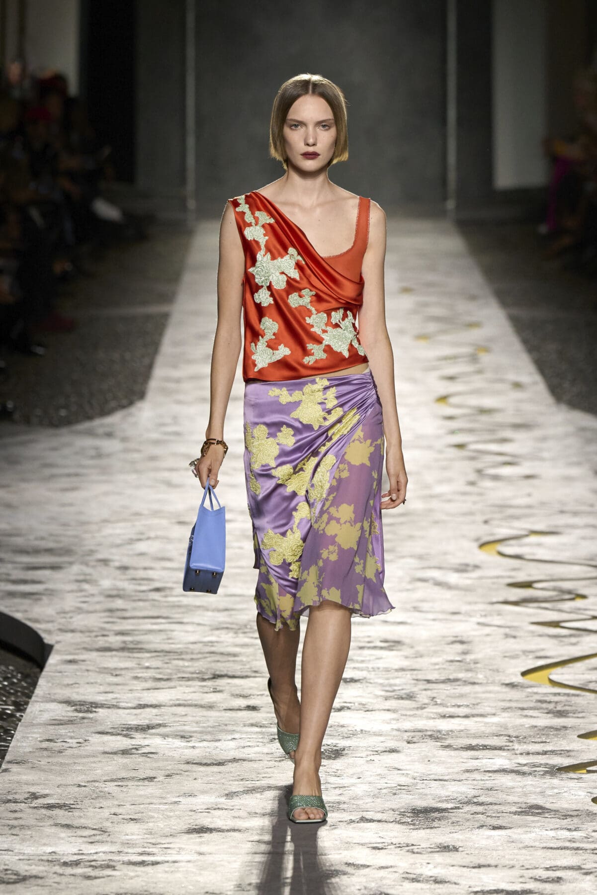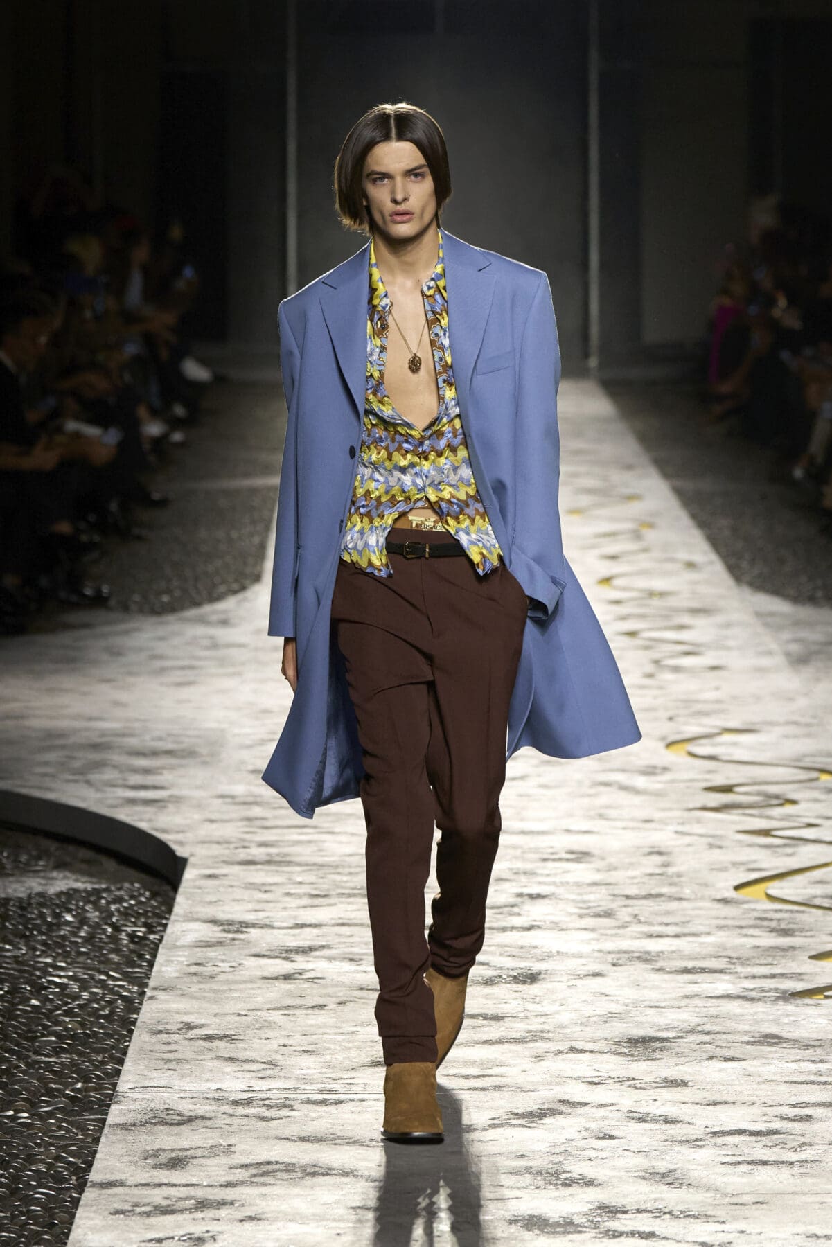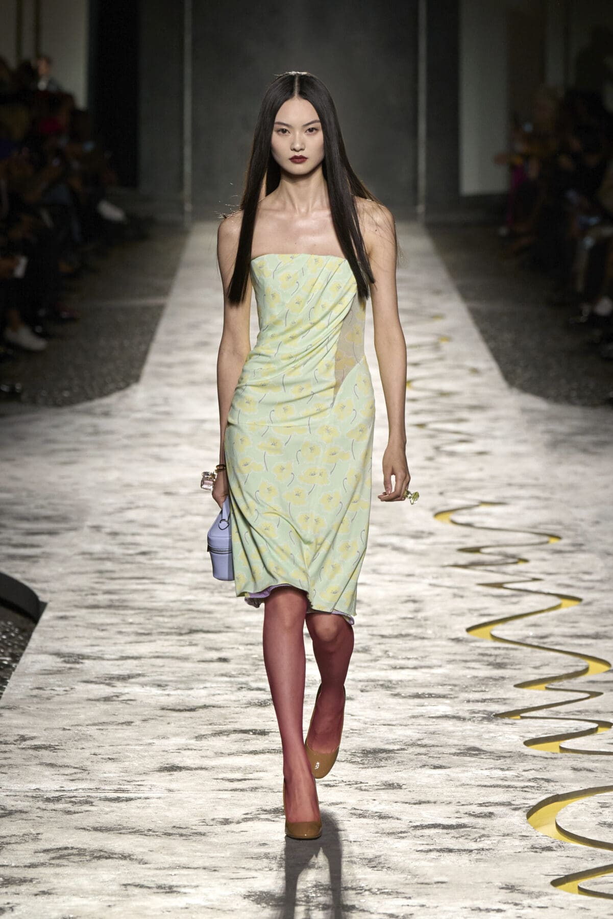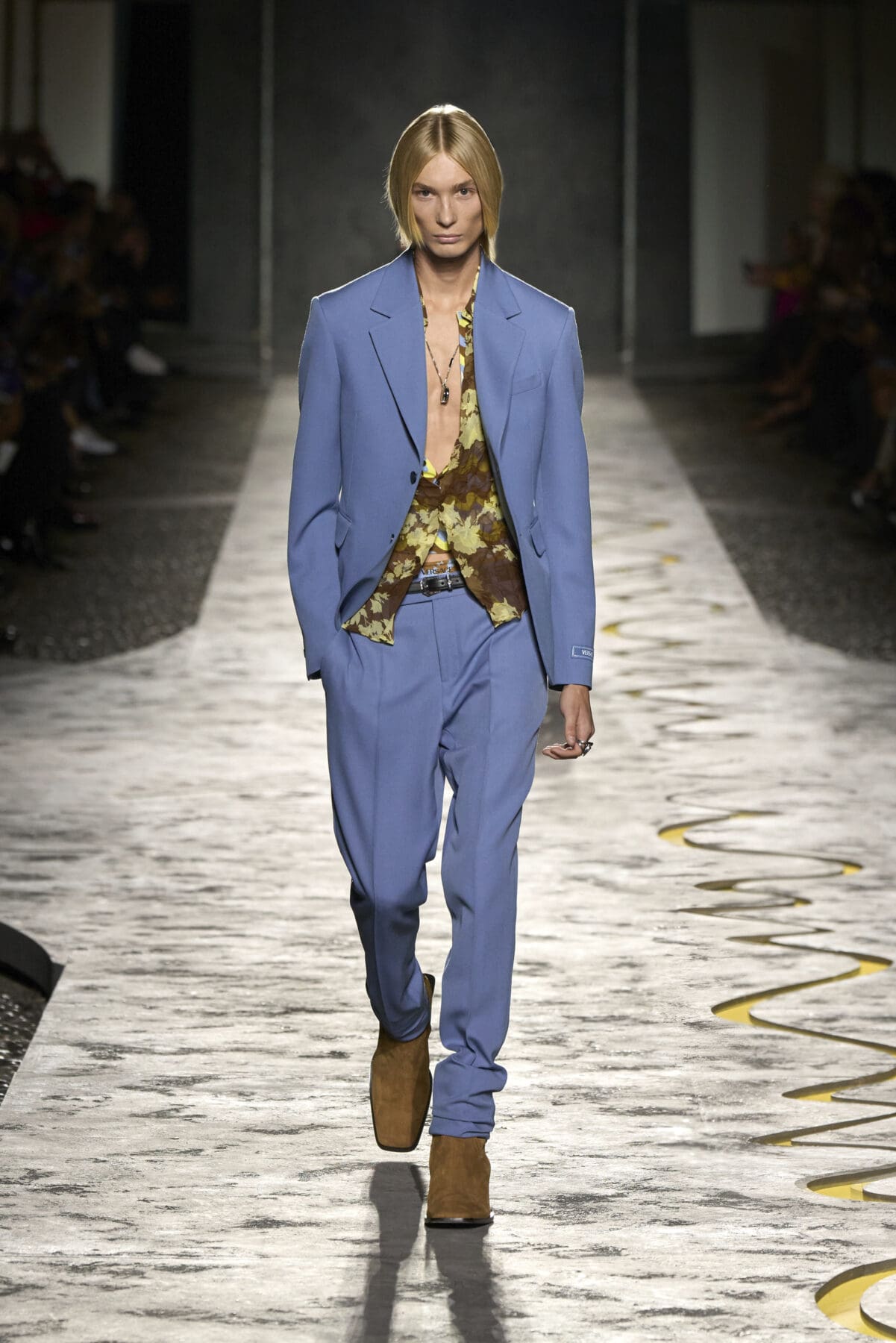 This collection did feel quite youthful by Versace standards, more sweet than sexy with its baby pastels, slip dress and cardigan combos, denim and short-shorts, not to mention the perfume bottle and champagne stem heels. On the other hand, there was a deft and subtle use of color that that old Versus show could never match, nicely exemplified by a man’s caramel-colored camp shirt and lavender trousers, and a woman’s copper tank and lilac skirt. A men’s leather jacket in soft yellow and white worn with violet colored leather pants was another highlight.