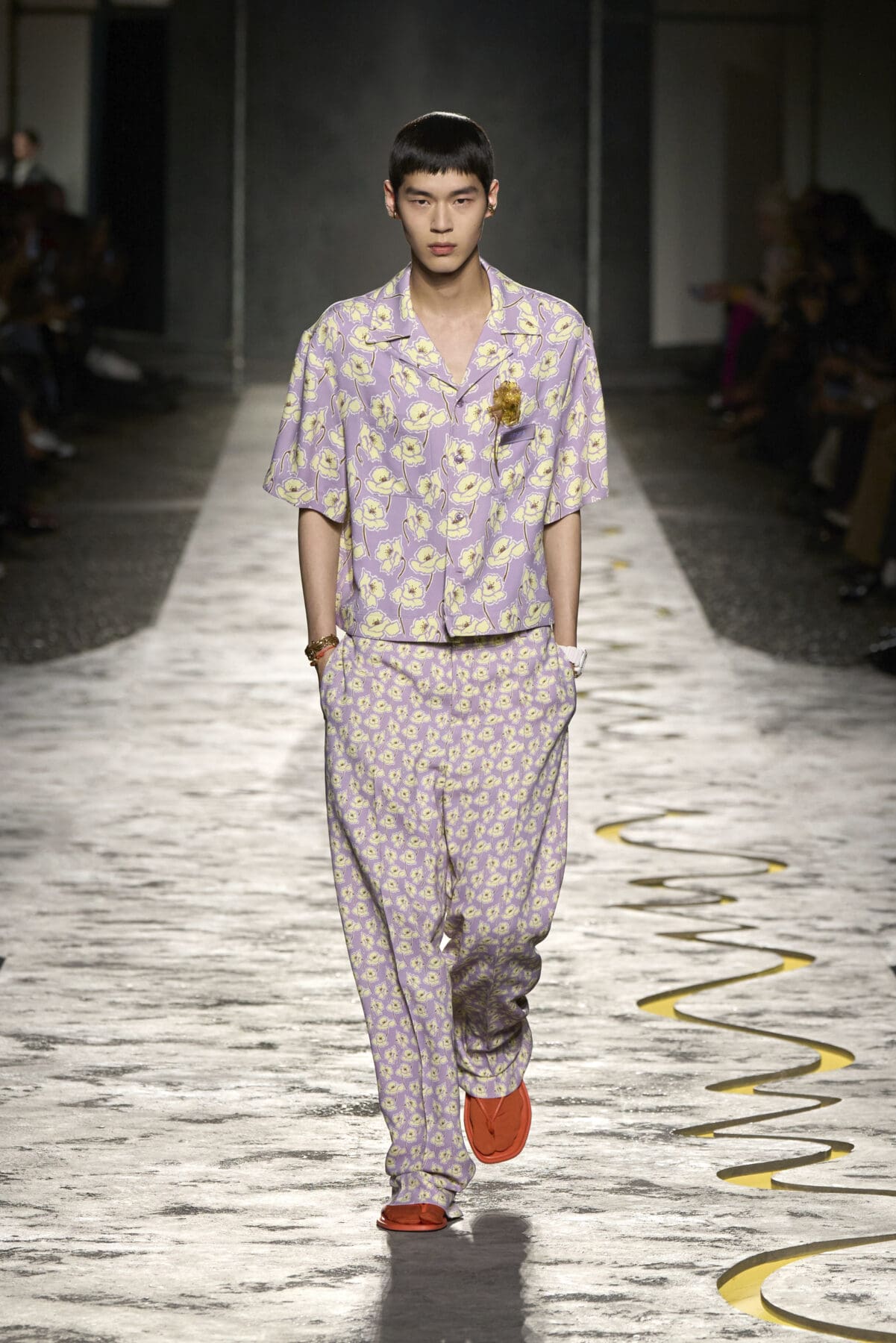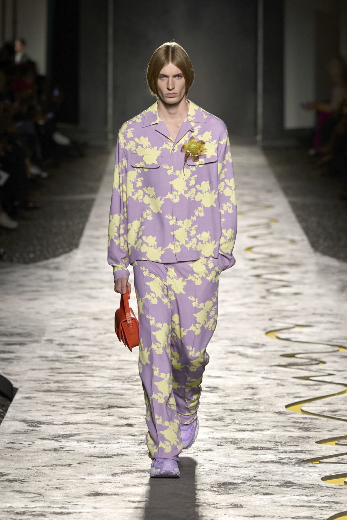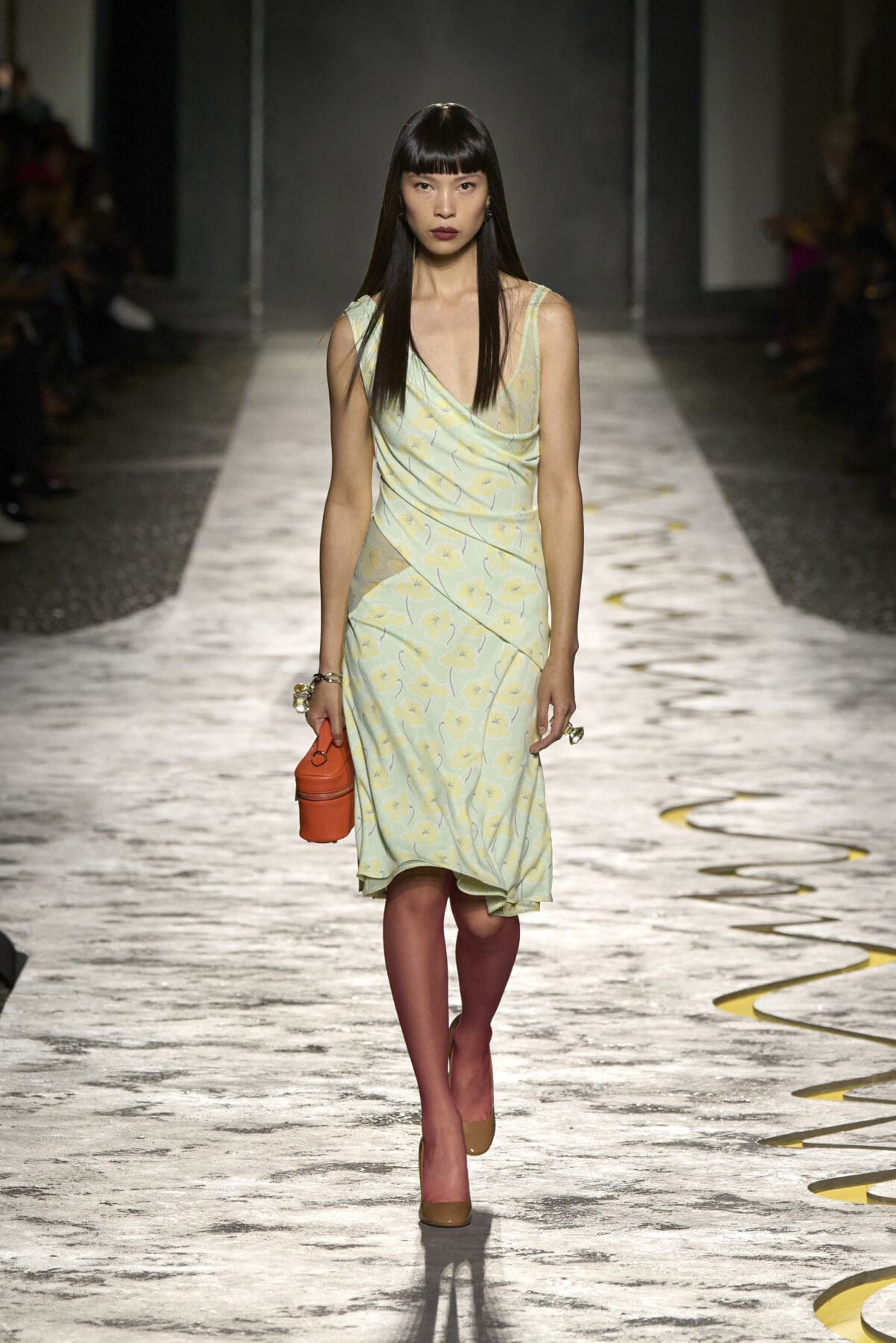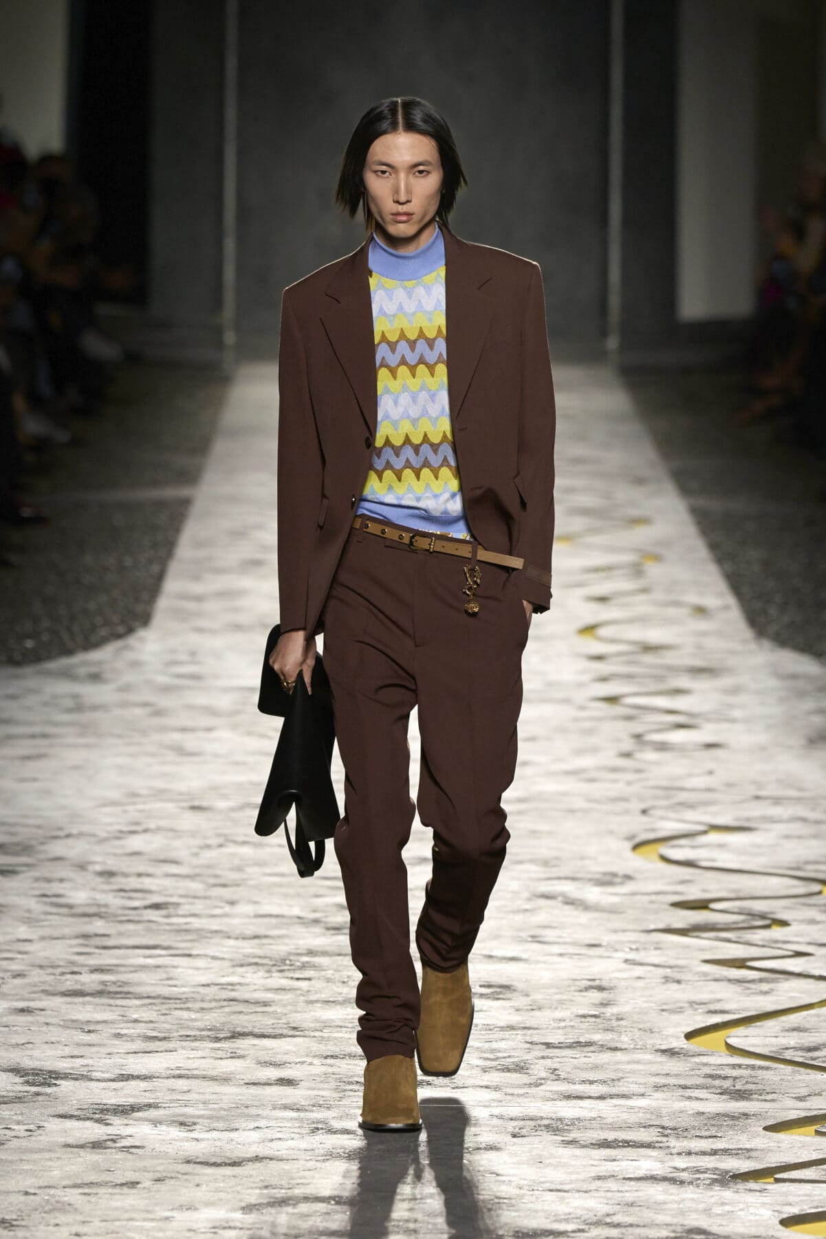 This collection did feel quite youthful by Versace standards, more sweet than sexy with its baby pastels, slip dress and cardigan combos, denim and short-shorts, not to mention the perfume bottle and champagne stem heels. On the other hand, there was a deft and subtle use of color that that old Versus show could never match, nicely exemplified by a man’s caramel-colored camp shirt and lavender trousers, and a woman’s copper tank and lilac skirt. A men’s leather jacket in soft yellow and white worn with violet colored leather pants was another highlight.