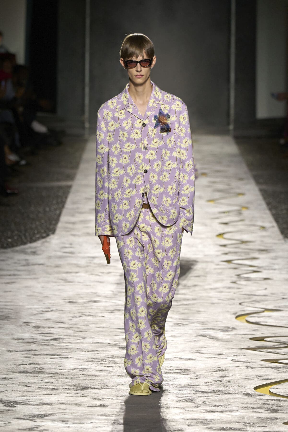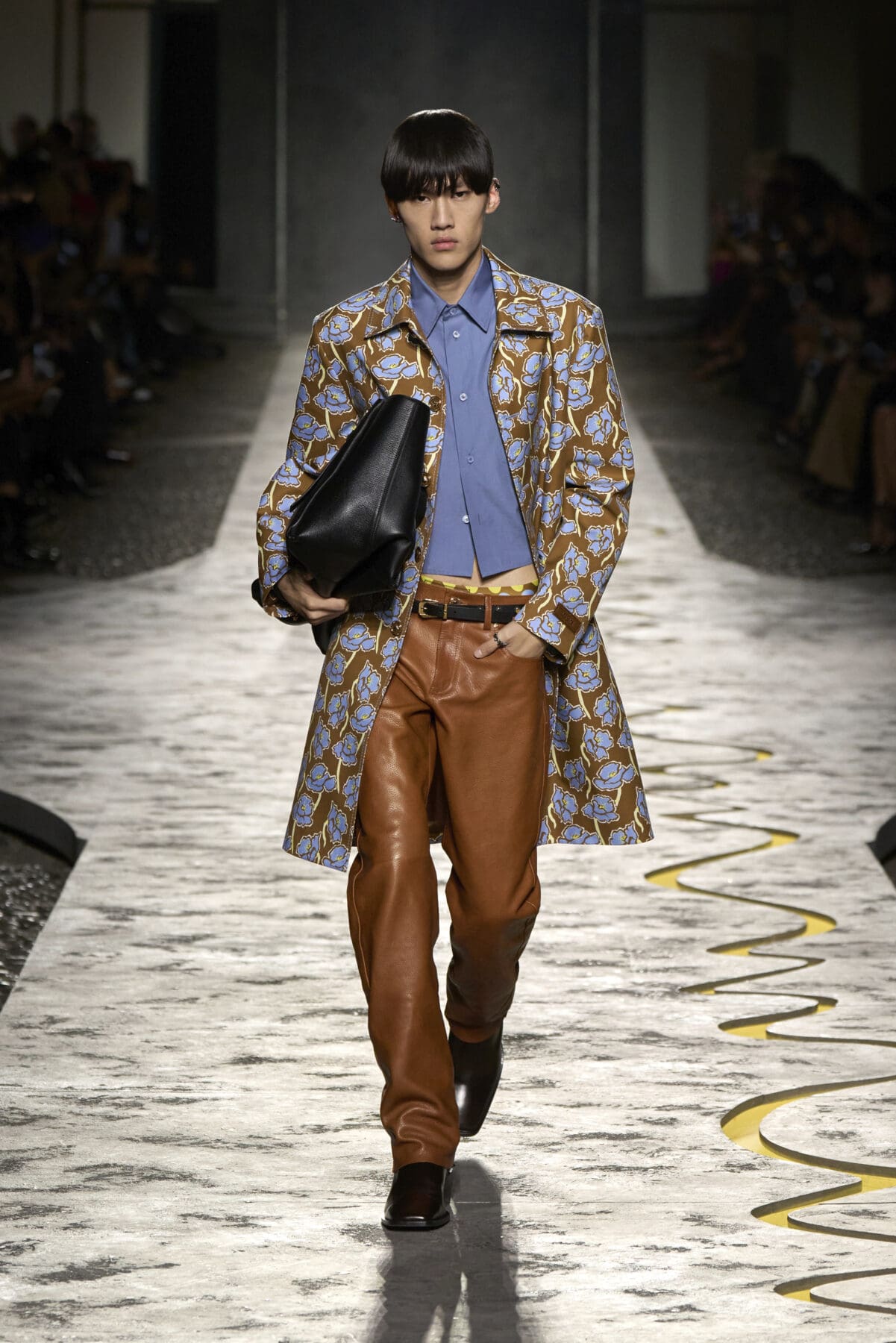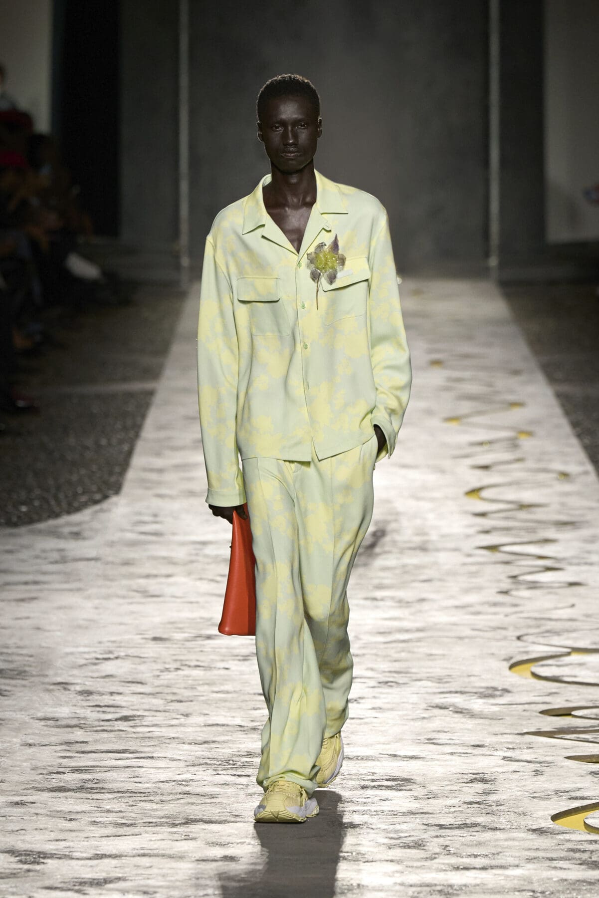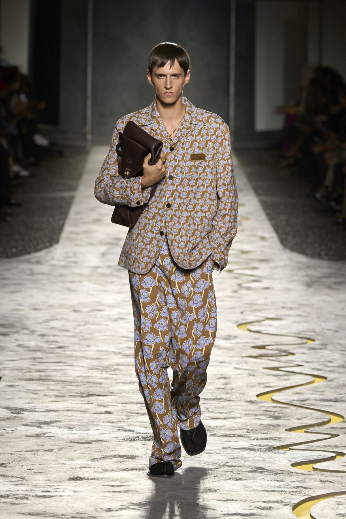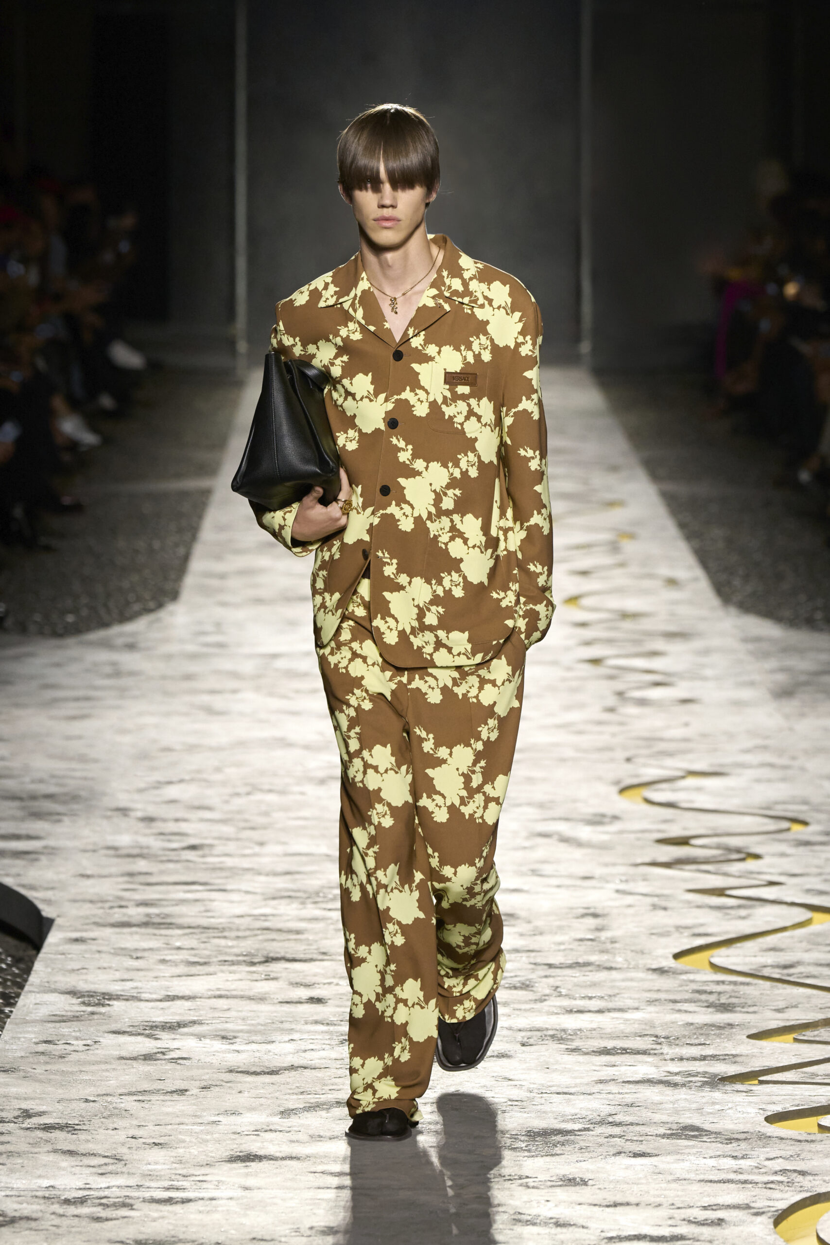 This collection did feel quite youthful by Versace standards, more sweet than sexy with its baby pastels, slip dress and cardigan combos, denim and short-shorts, not to mention the perfume bottle and champagne stem heels. On the other hand, there was a deft and subtle use of color that that old Versus show could never match, nicely exemplified by a man’s caramel-colored camp shirt and lavender trousers, and a woman’s copper tank and lilac skirt. A men’s leather jacket in soft yellow and white worn with violet colored leather pants was another highlight.