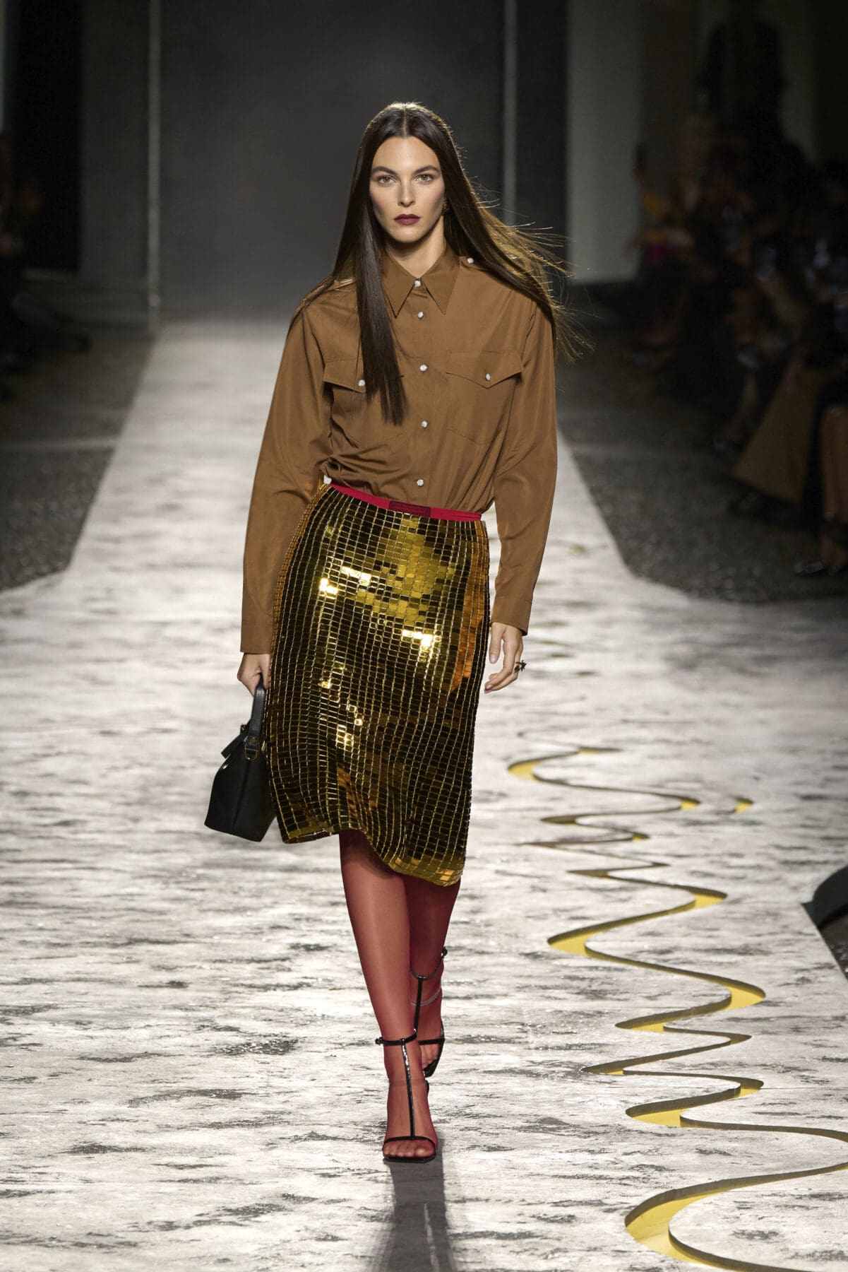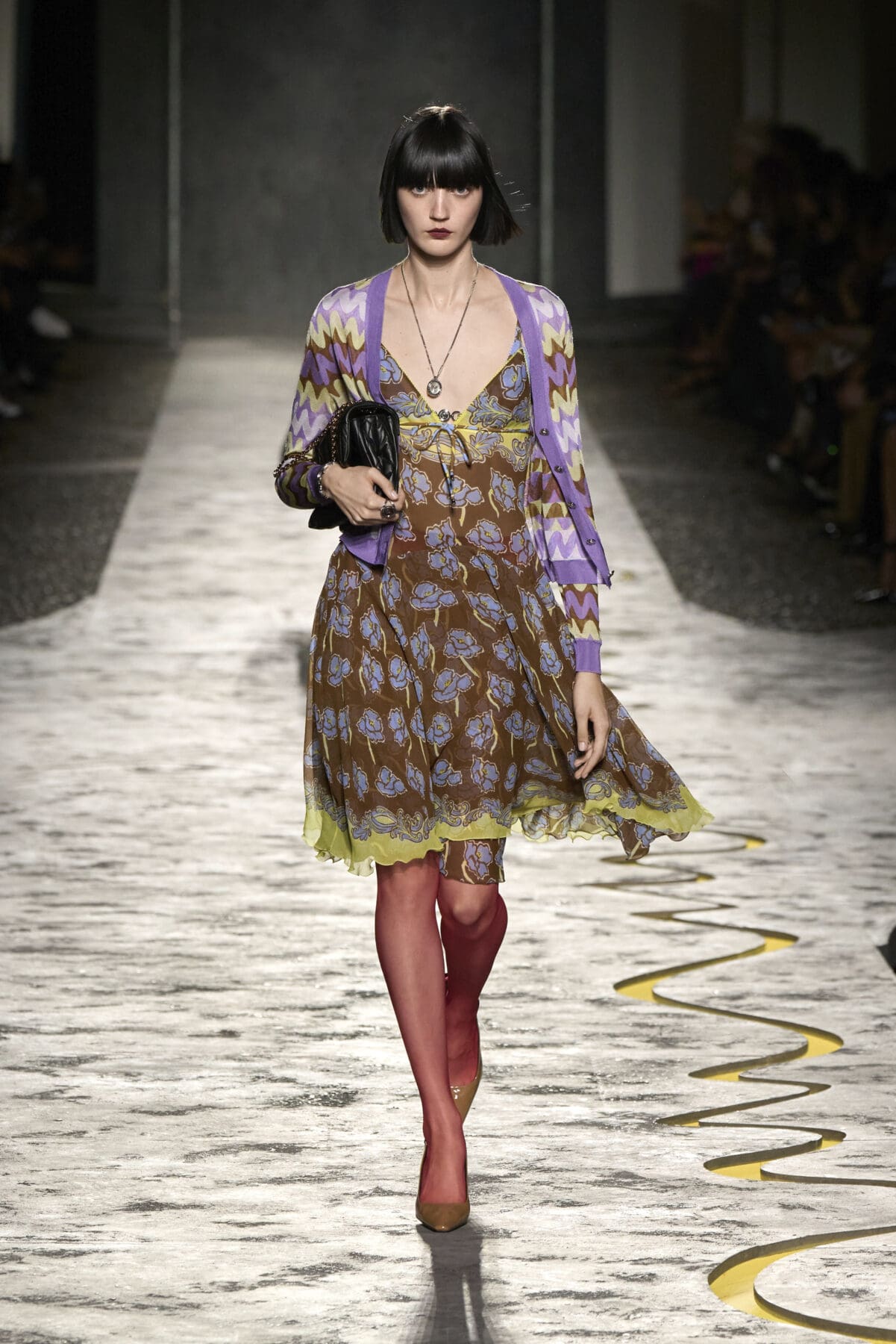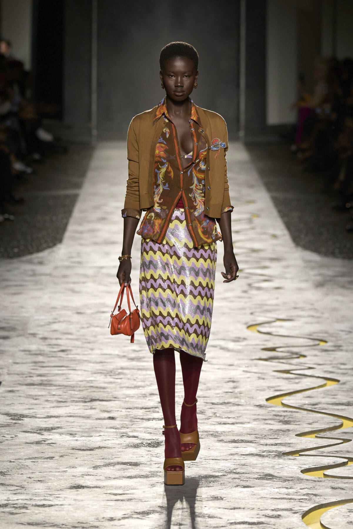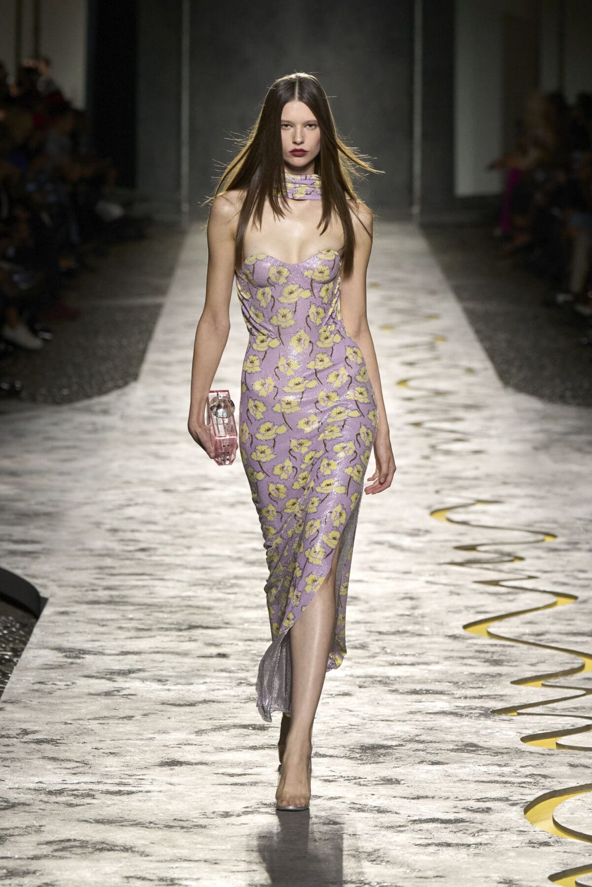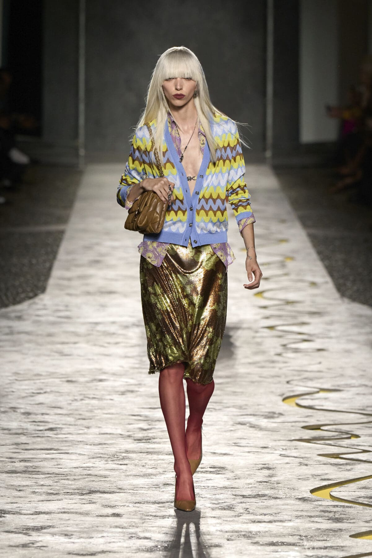 That long-ago season she really lived up to Versus’s latter-day billing, clashing prints and patterns in energizing ways. Fast forward 28 years to a Milan night just balmy enough for the outdoor setting of the Castello Sforzesco, and she was at it again, with squiggly patterned knits and floral prints, some on silk and some on chainmail, which were near replicas of the originals.