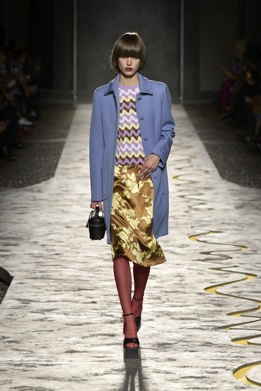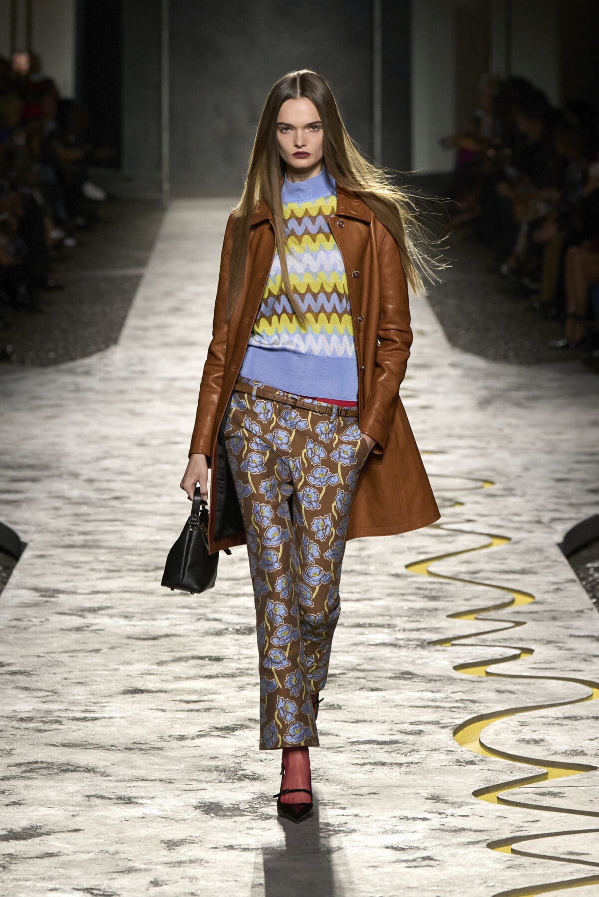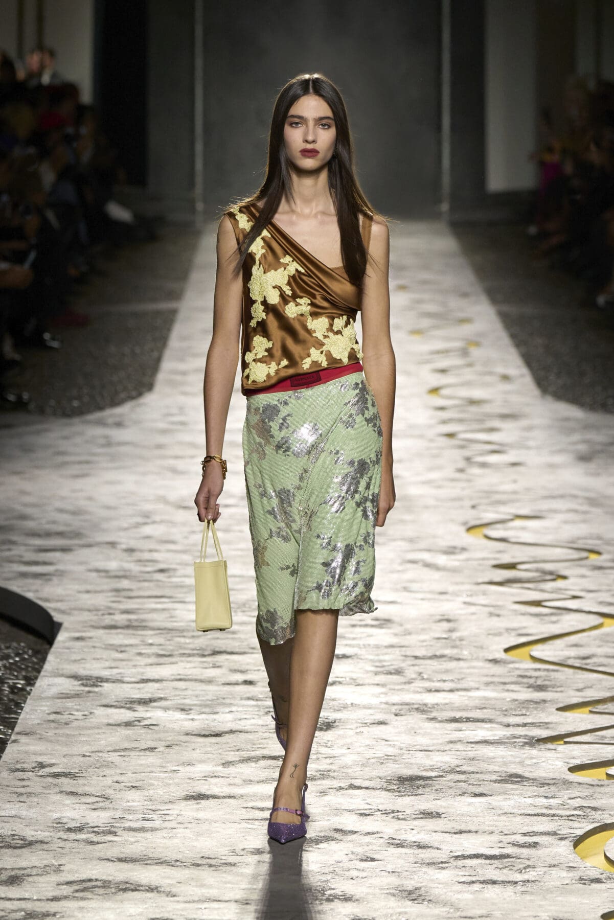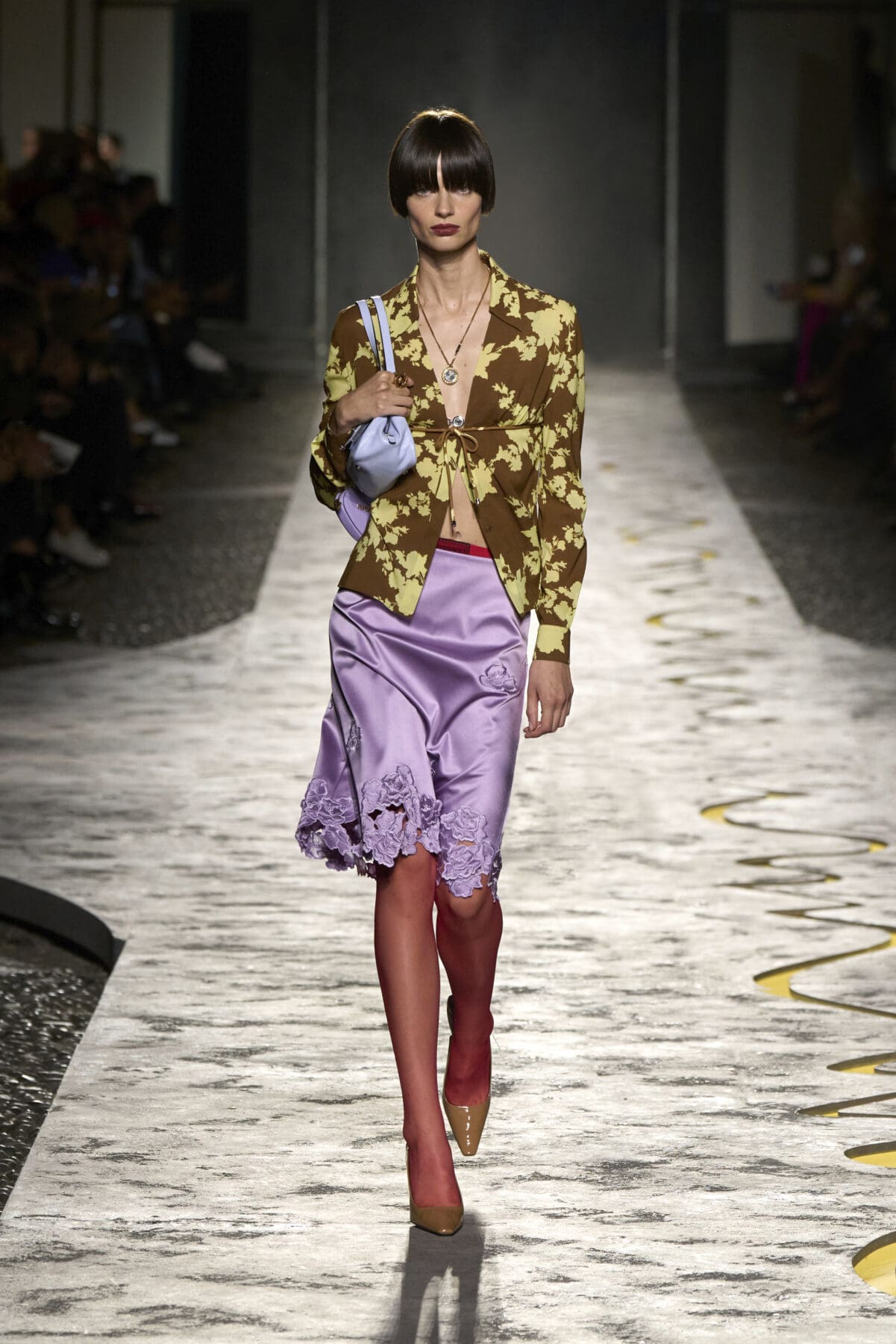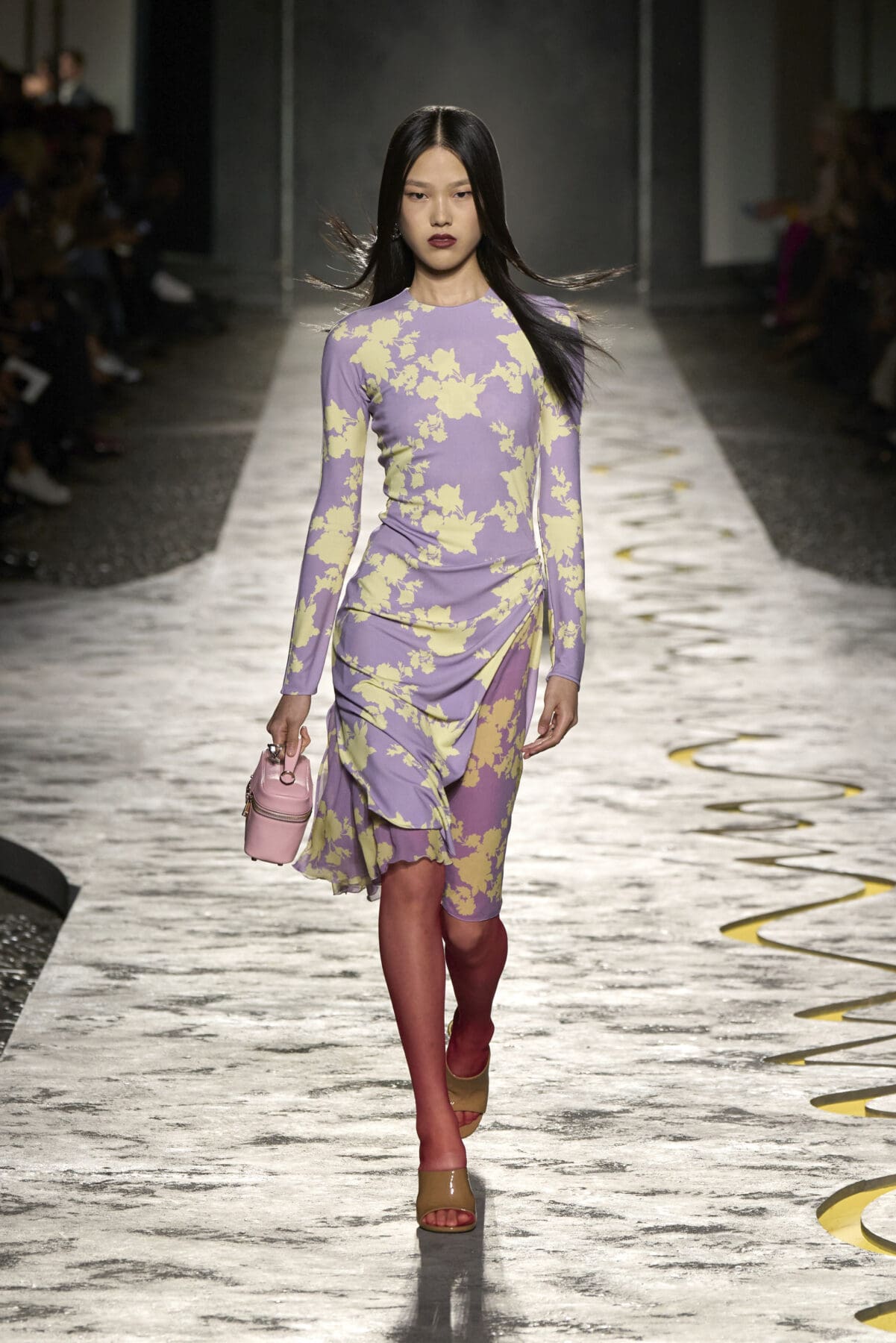That long-ago season she really lived up to Versus’s latter-day billing, clashing prints and patterns in energizing ways. Fast forward 28 years to a Milan night just balmy enough for the outdoor setting of the Castello Sforzesco, and she was at it again, with squiggly patterned knits and floral prints, some on silk and some on chainmail, which were near replicas of the originals.