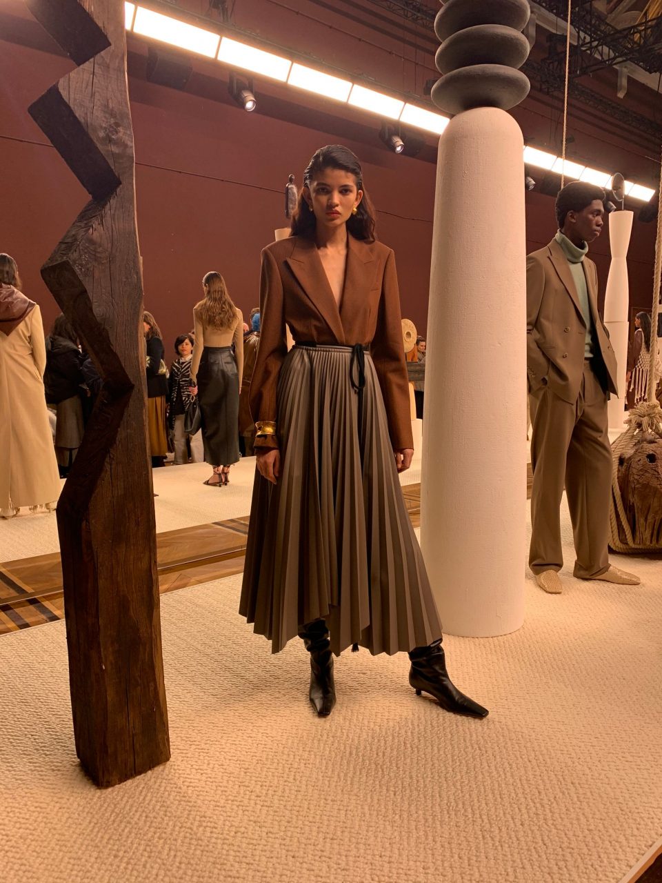 Sandra Sandor’s Budapest label, Nanushka, is quickly becoming a label to watch. The young brand adheres to sustainable practices when it comes to fabric development and has some of the softest vegan leather I’ve ever come across. A look that jumped out at me during their presentation in Paris back in March was a peak lapel blazer in rust that was worn tucked into a grey pleated skirt. I loved how it was styled with a slouchy boot.