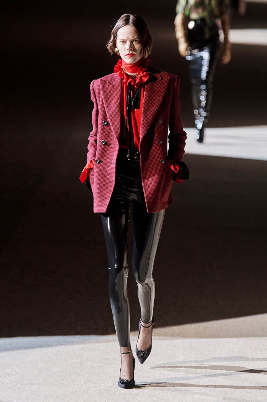 One of my favourite collections from the season was from Anthony Vacarello’s Saint Laurent. I loved the unlikely pairing of 80s inspired heritage tartan double breasted jackets and sheer bow blouses with second-skin jet black latex trousers. While the latex trousers would definitely not be an everyday look, the strong shoulder jacket is a versatile piece that can take me from day to night.