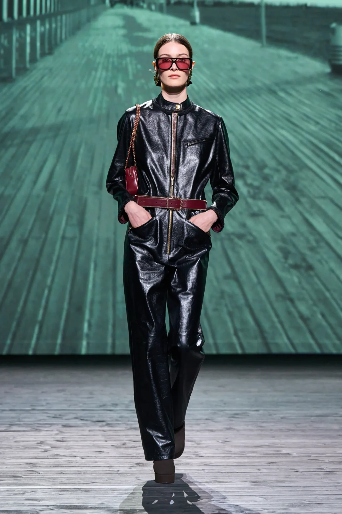 This is arguably one of the most unforgettable looks for me from the Chanel Fall/Winter 2024 fashion show. I love the shine of this calfskin leather jumpsuit and the accessories in burgundy tones. The pilot sunglasses with the red tint really just top it off so perfectly.