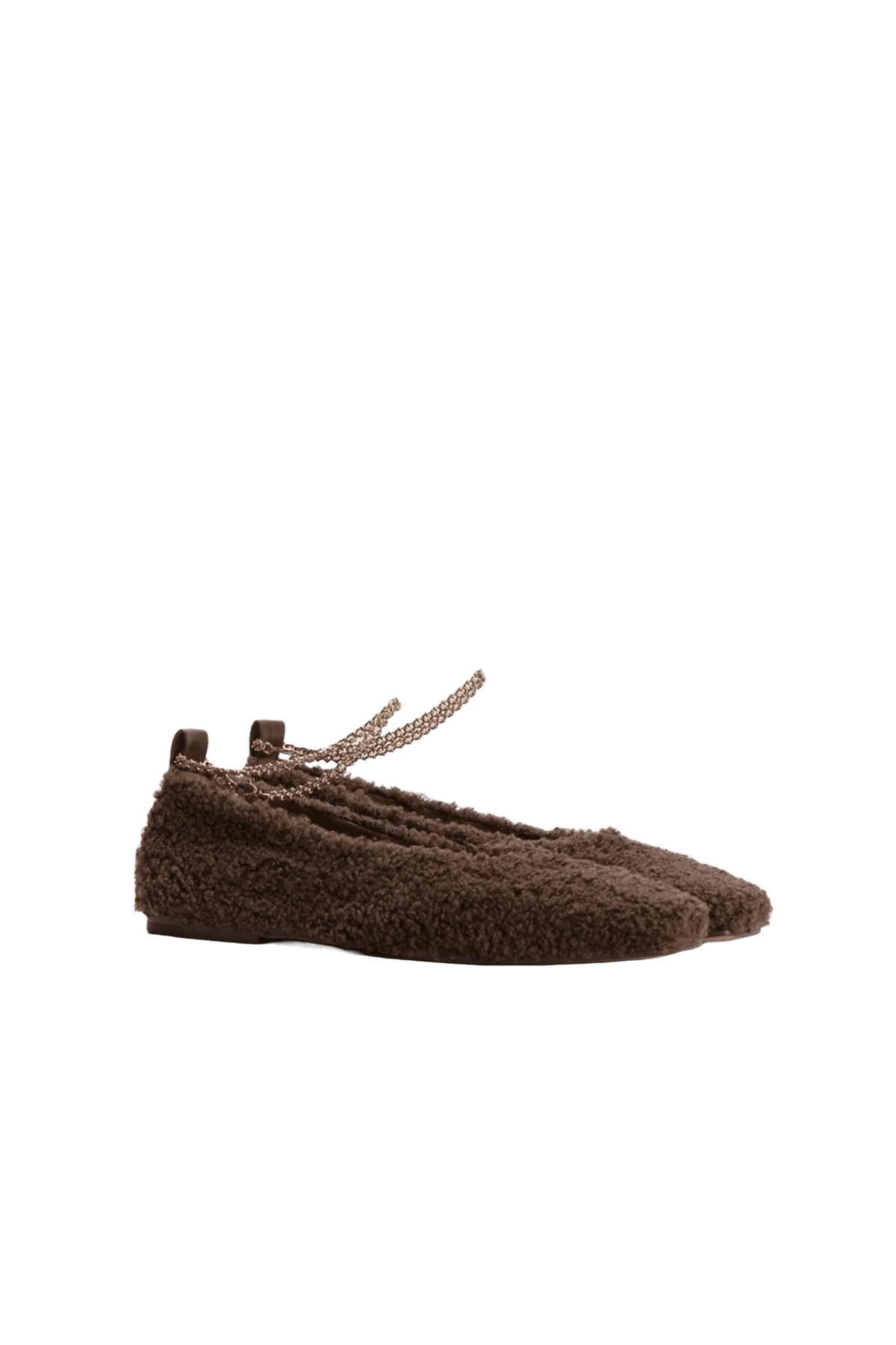 While ballet flats and Mary Janes have made a steady return to many of our shoe closets, one thing I seem to be lacking is a squared-toe flat, which we’ve been seeing more of lately. These eco-fur ballet flats from Maria Luca feature a delicate ankle chain and, again, are chocolate brown, which, might I dare say, is the new black?