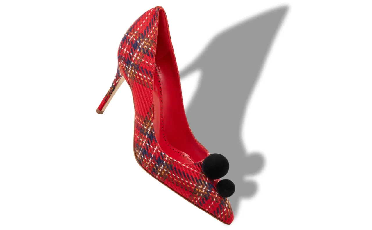 Manolo Blahnik Piera Red Wool Tartan Pom Pom Detail Pumps