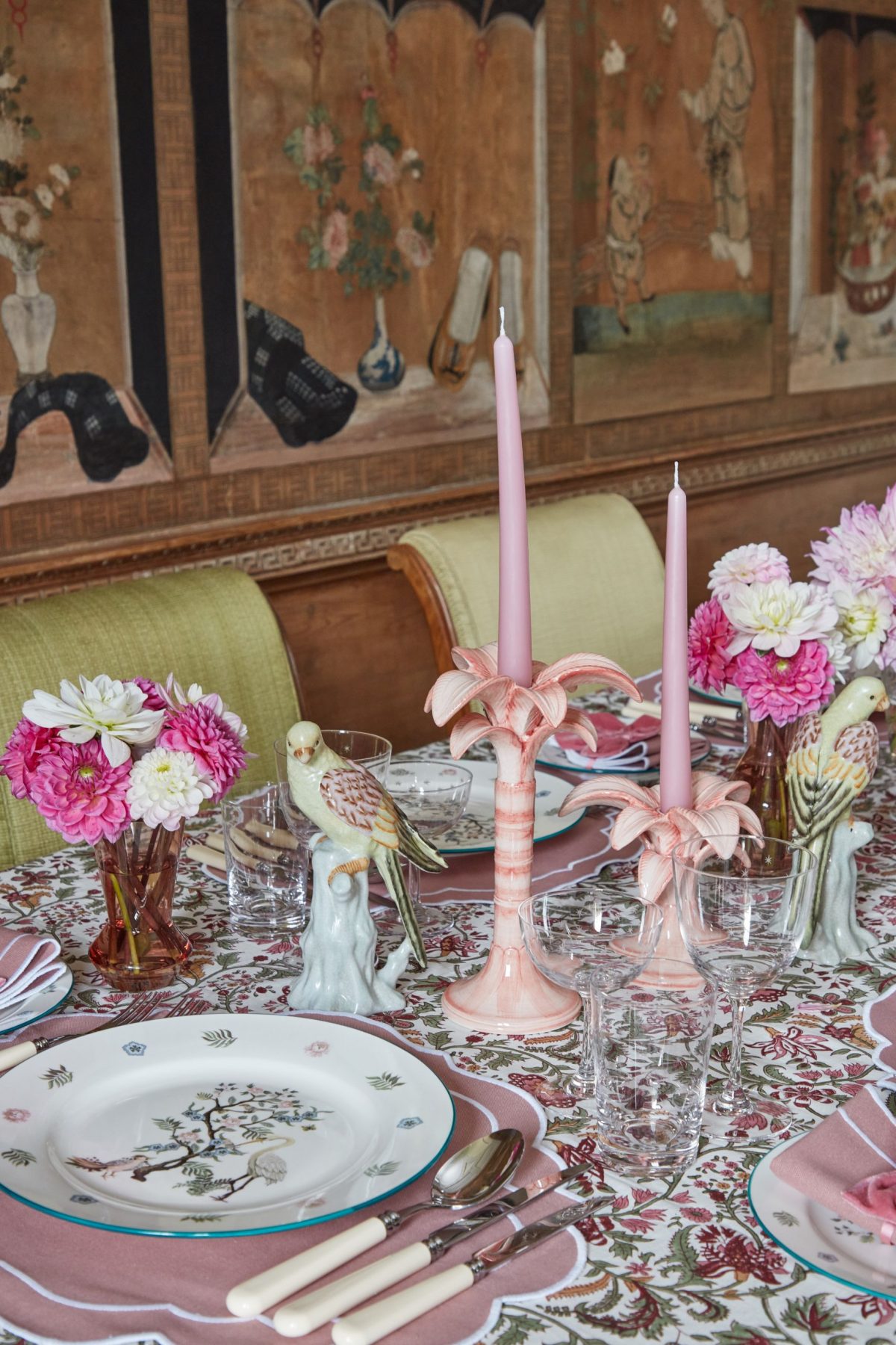 Alice and I have been friends for 30 years so collaborating with her brand Mrs. Alice was a dream come true. For me, as you know, I am bonkers about interiors, and the inspiration behind this particular tablescape was our shared love of Chinoiserie, with stolen elements from The Beverly Hills Hotel. It is a magical place for us which holds very special memories. Everything about it is powder pink, with palm trees in abundance, and I think that you can really feel all of those things within the collection. We wanted it to be fun, so we added moons and stars to all the glassware and we were truly inspired by our lifelong friendship. I am beyond proud of Alice who is not only a great mother but an amazing business woman.