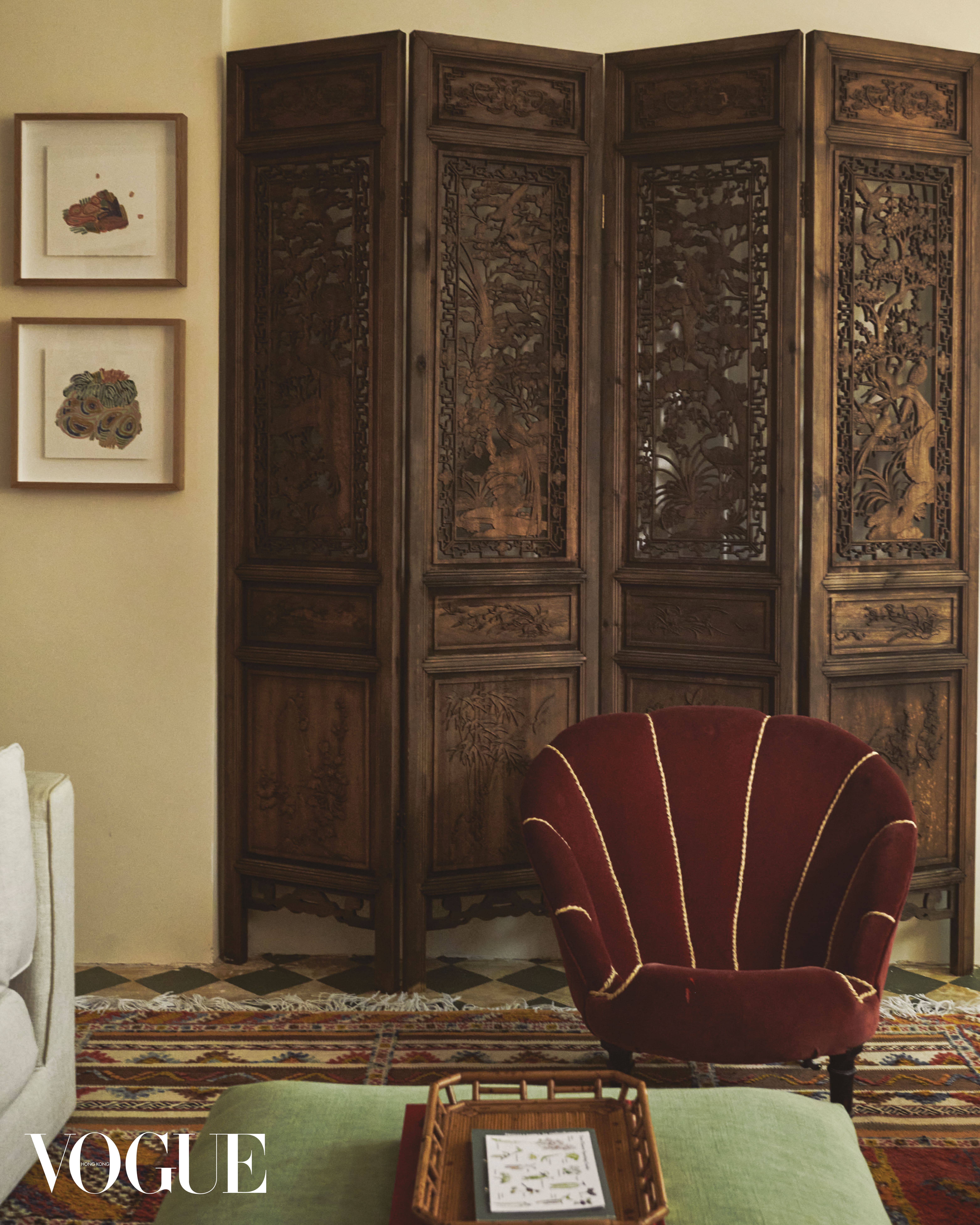 Artwork by Hou Lam Tsui and Tibetan cupboard sourced from Oriental Home in Ap Lei Chau which matches one in yellow in the room nearby