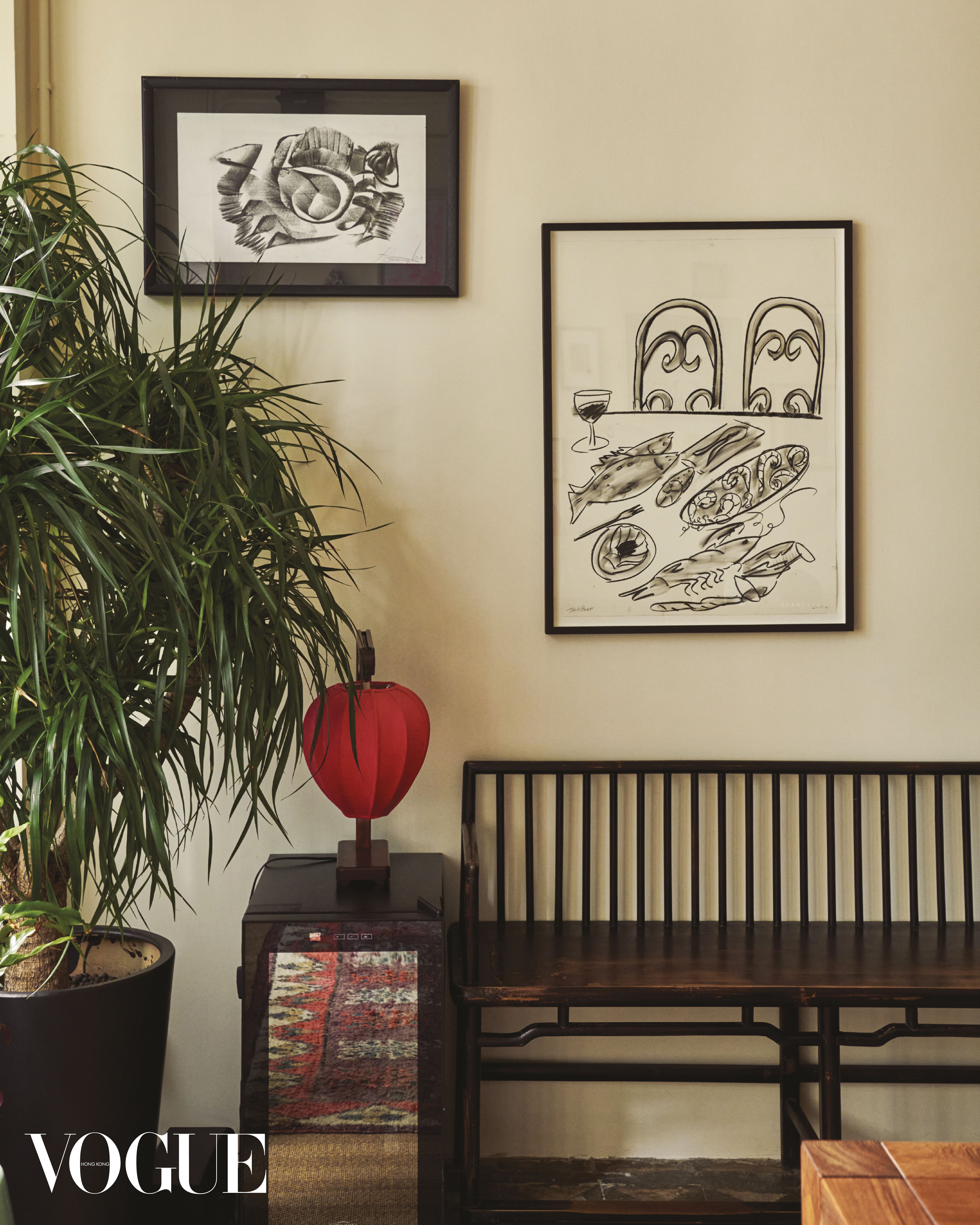 Artworks by Ron Sharon and Jack Penny. 1950s lamp sourced from To Tsu Kok Furniture & Antiques in Peng Chau