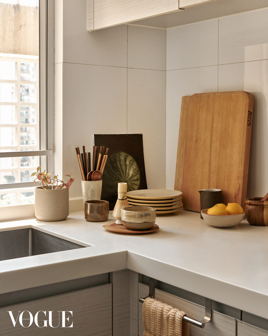 The kitchen is simple and neat, featuring handmade ceramic plates by Jono Pandolfi, a Studio TK matcha bowl, and another Brendan Fitzpatrick painting.
