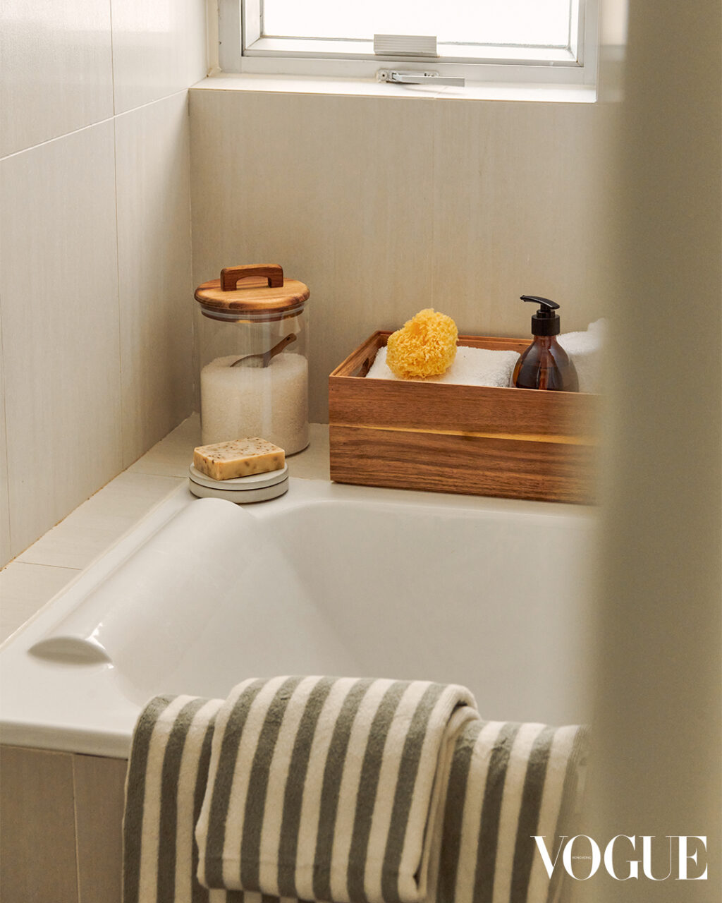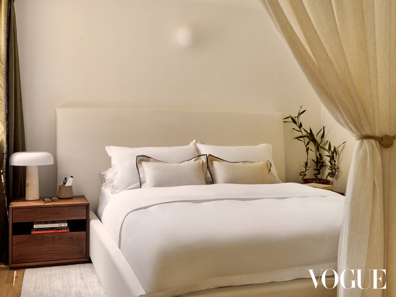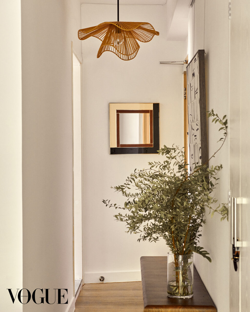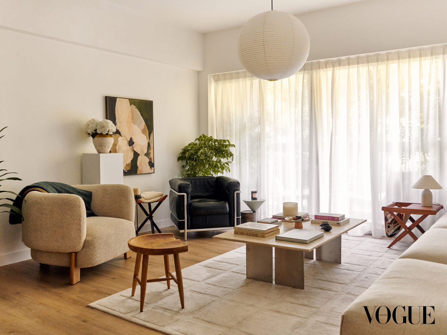 I ring the doorbell to Kwan’s apartment and hear an enthusiastic skittering of paws from behind the door. “Hellooo, come in, come in!” She answers the door with a warm smile and a bowl of yoghurt in hand, while an excited Chihuahua/Jack Russell Terrier mix beams at us from her feet. We are led through a hallway flanked by a gorgeous black walnut Butcher block bench by Hardwood HK, and brought into the main area of the home. The space is filled with soft morning light, and the sun’s rays are softened as they filter in through white linen curtains that frame the living room’s expansive balcony windows. It smells like Treehouse by Byredo and the pre-typhoon stillness is palpable even inside the apartment.