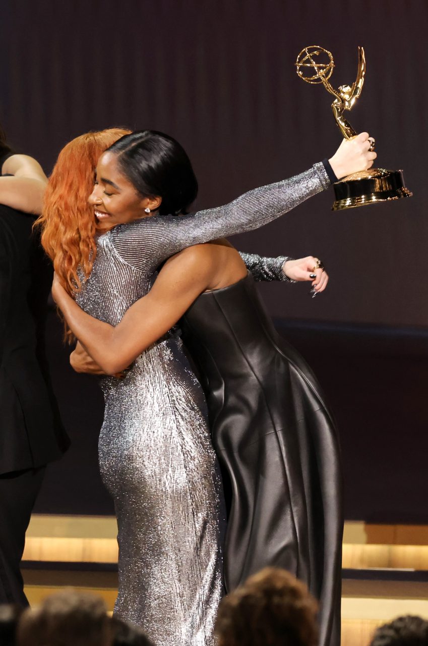 LOS ANGELES, CALIFORNIA - JANUARY 15: (L-R) Natasha Lyonne presents the Outstanding Comedy Series award for “The Bear” to Ayo Edebiri onstage during the 75th Primetime Emmy Awards at Peacock Theater on January 15, 2024 in Los Angeles, California. (Photo by Kevin Winter/Getty Images)