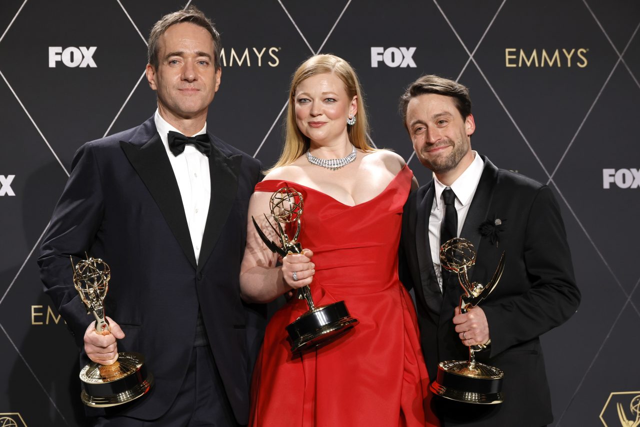 LOS ANGELES, CALIFORNIA - JANUARY 15: (L-R) Matthew Macfadyen, winner of Best Supporting Actor in a Drama Series, Sarah Snook, winner of Best Actress in a Drama Series, and Kieran Culkin, winner of Best Actor in a Drama Series for "Succession" (Best Drama Series) pose in the press room during the 75th Primetime Emmy Awards at Peacock Theater on January 15, 2024 in Los Angeles, California. (Photo by Frazer Harrison/Getty Images)