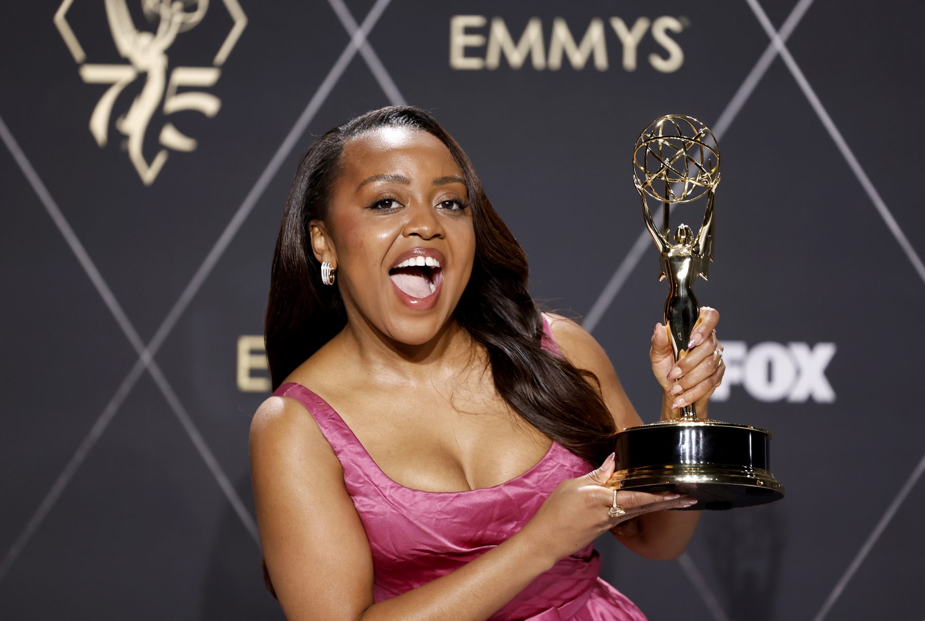 LOS ANGELES, CALIFORNIA - JANUARY 15: Quinta Brunson, winner of the Outstanding Lead Actress in a Comedy Series award for "Abbott Elementary," poses in the press room during the 75th Primetime Emmy Awards at Peacock Theater on January 15, 2024 in Los Angeles, California. (Photo by Frazer Harrison/Getty Images)
