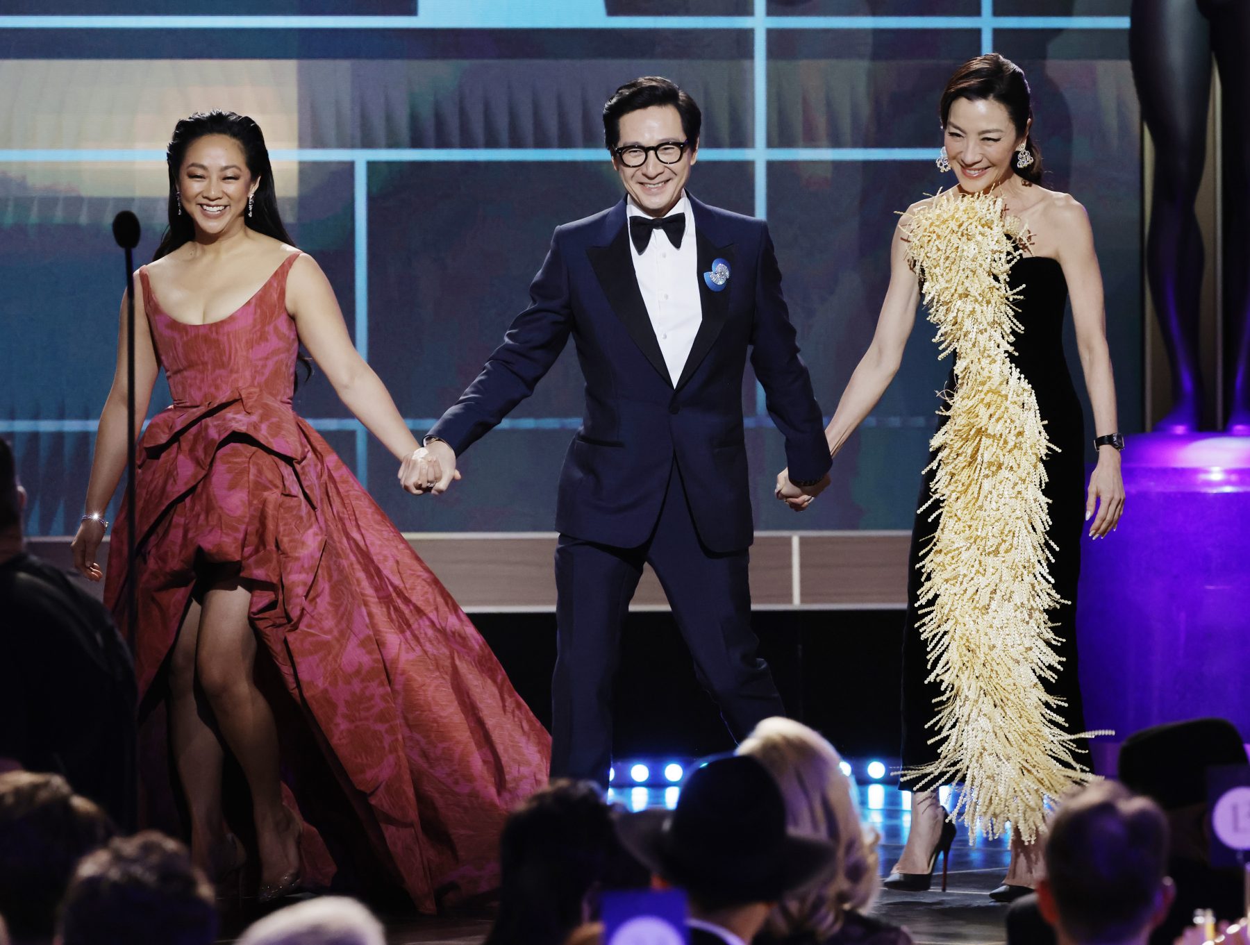 LOS ANGELES, CALIFORNIA - FEBRUARY 26: (L-R) Stephanie Hsu, Ke Huy Quan, and Michelle Yeoh speak onstage during the 29th Annual Screen Actors Guild Awards at Fairmont Century Plaza on February 26, 2023 in Los Angeles, California. (Photo by Kevin Winter/Getty Images)
