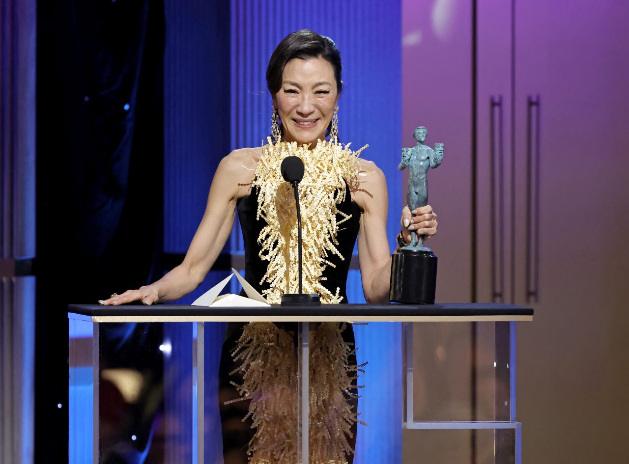 LOS ANGELES, CALIFORNIA - FEBRUARY 26: Michelle Yeoh accepts the Outstanding Performance by a Female Actor in a Leading Role for "Everything Everywhere All at Once" onstage during the 29th Annual Screen Actors Guild Awards at Fairmont Century Plaza on February 26, 2023 in Los Angeles, California. (Photo by Kevin Winter/Getty Images)