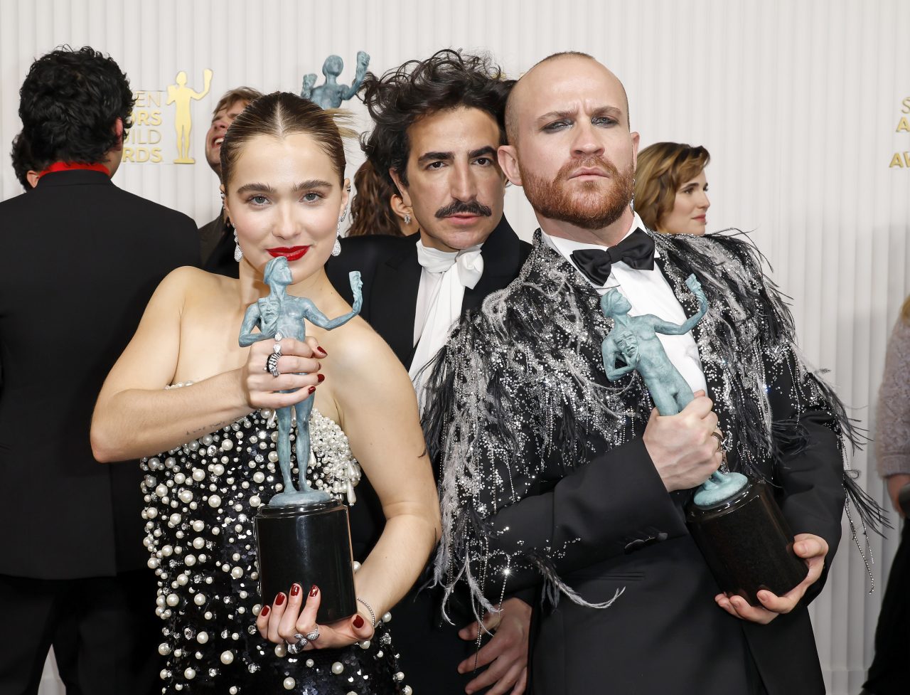 LOS ANGELES, CALIFORNIA - FEBRUARY 26: (L-R) Haley Lu Richardson, Francesco Zecca and Paolo Camilli, recipients of the Outstanding Performance by an Ensemble in a Drama Series award for "The White Lotus," pose in the press room during the 29th Annual Screen Actors Guild Awards at Fairmont Century Plaza on February 26, 2023 in Los Angeles, California. (Photo by Frazer Harrison/Getty Images)